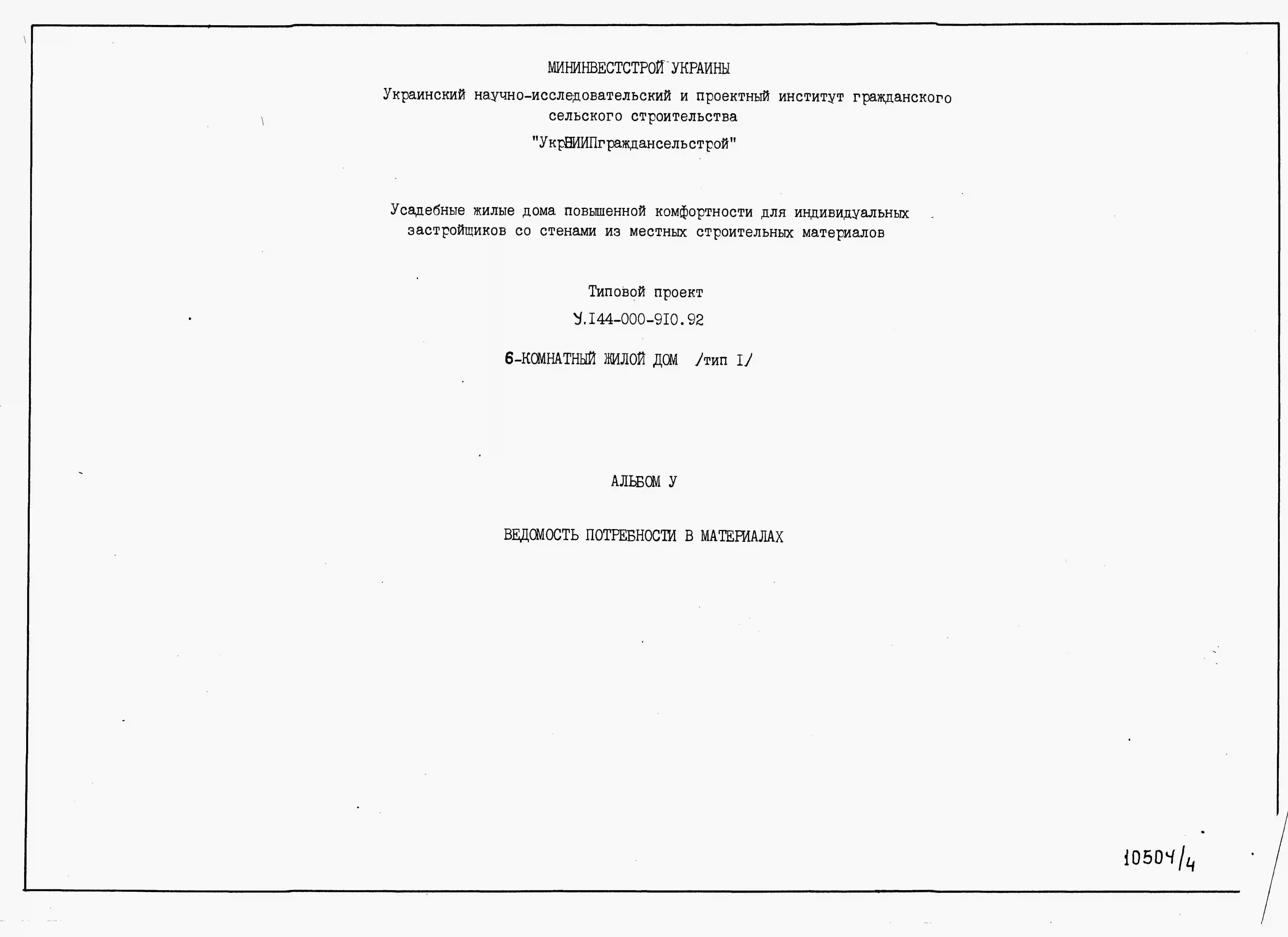 Типовой проект У.144-000-910.92 Усадебные жилые дома повышенной комфортности для индивидуальных застройщиков со стенами из местных строительных материалов, 6-комнатный жилой дом (тип 1). Паспорт проекта (формат PDF) Чертежи (формат TIF)