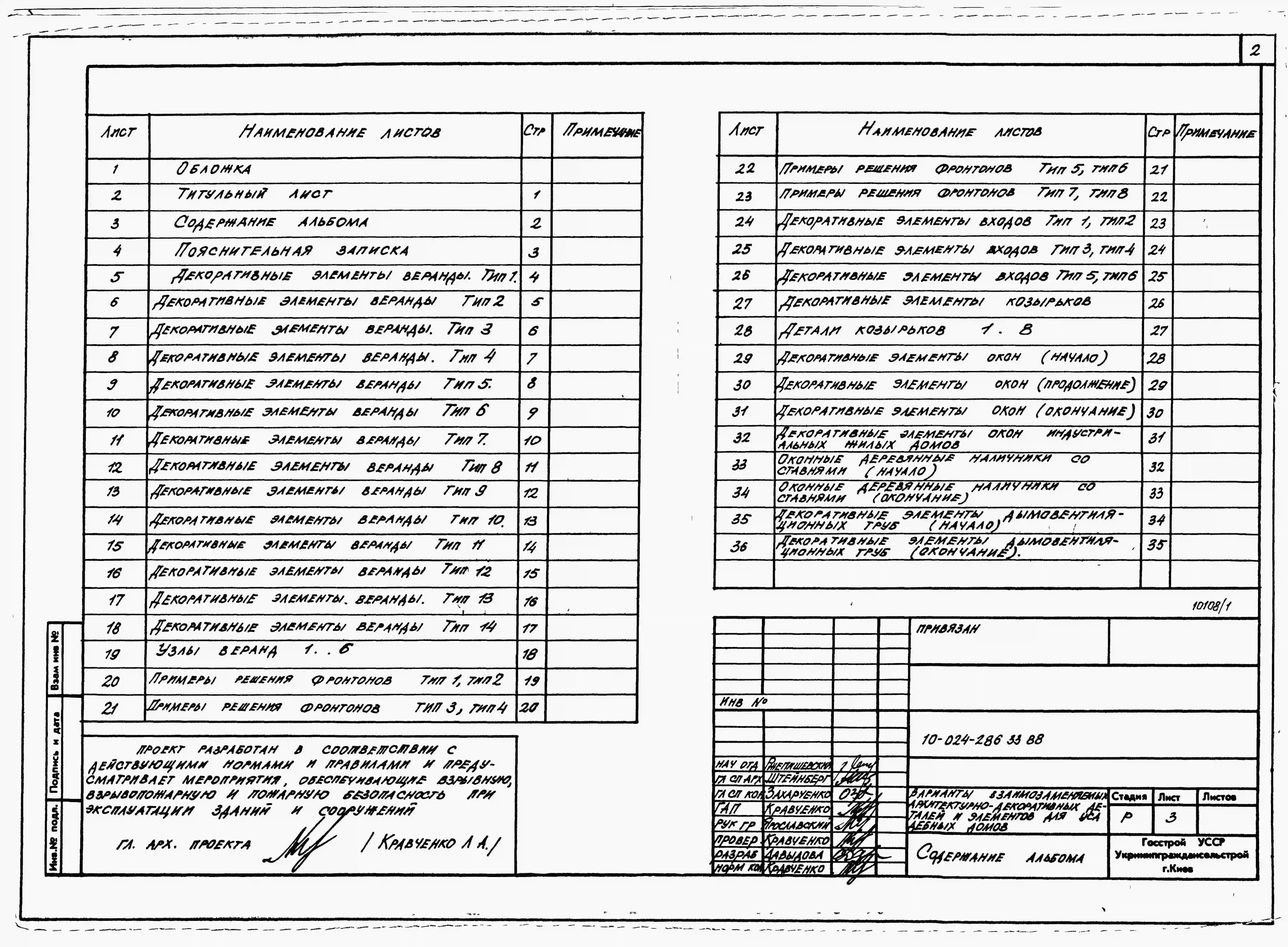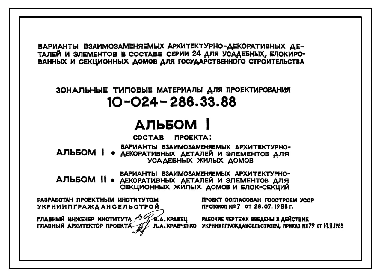 Типовой проект 10-024-286.33.88 Варианты взаимозаменяемых архитектурно-декоративных деталей и элементов в составе серии 24 для усадебных, блокированных и секционных домов для государственного строительства. Паспорт проекта (формат PDF) Чертежи (формат TIF)