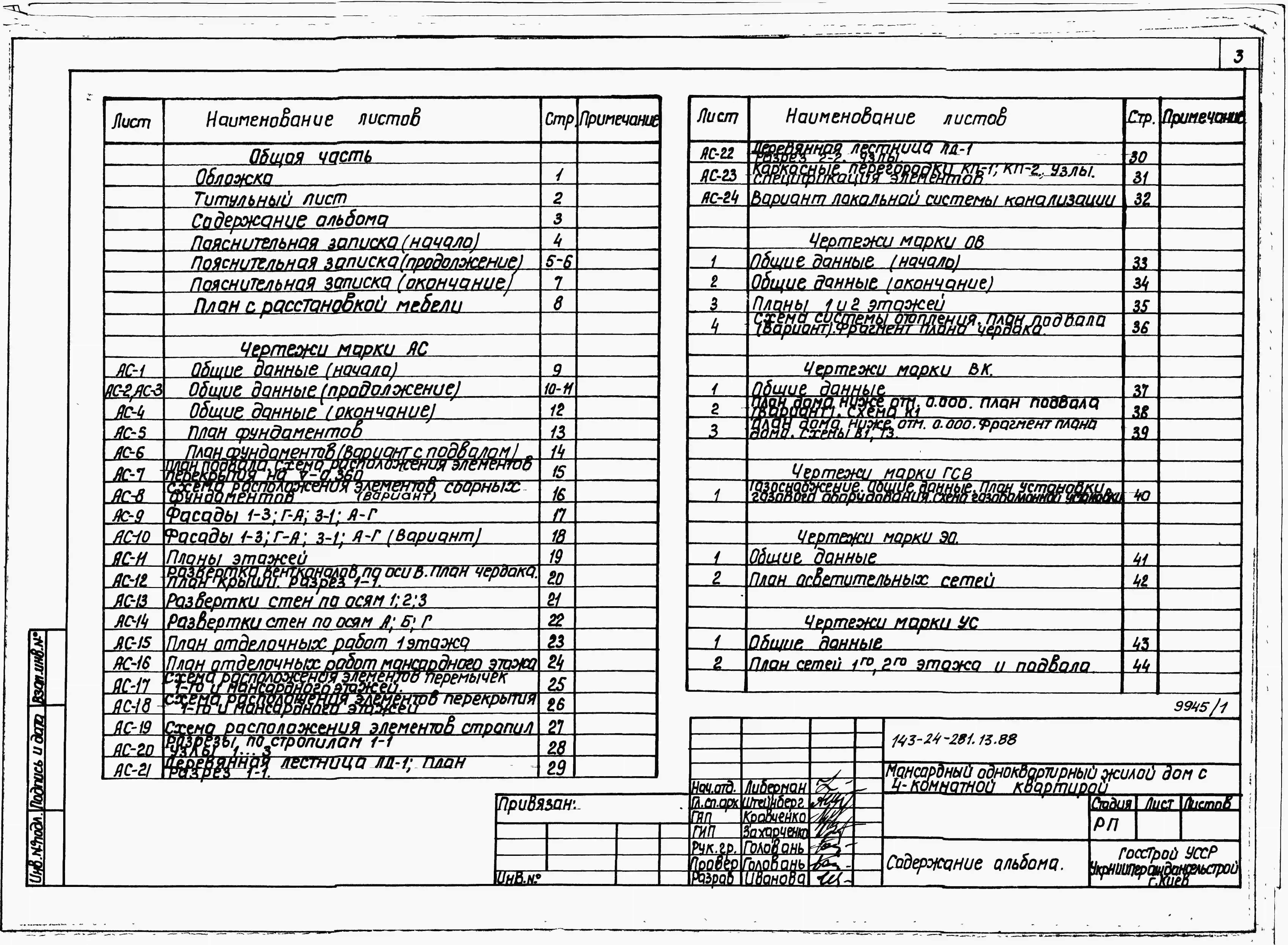 Типовой проект 143-24-281.13.88 Мансардный одноквартирный жилой дом с 4-комнатной квартирой. Паспорт проекта (формат PDF) Чертежи (формат TIF)