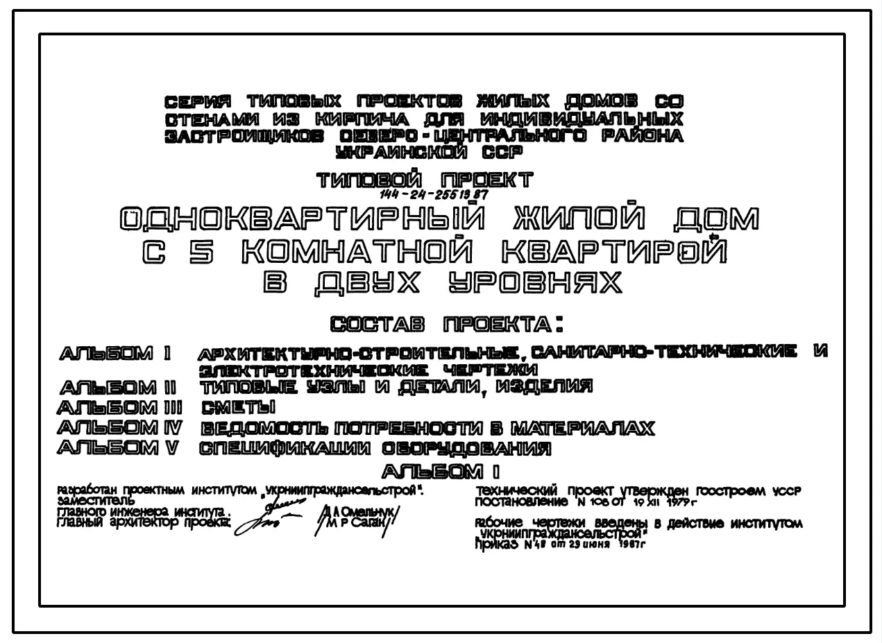 Типовой проект 144-24-255.13.87 Одноквартирный жилой дом с 5-комнатной квартирой в двух уровнях (для индивидуальных застройщиков северо-центральных районов УССР). Чертежи (формат TIF) Паспорт проекта (формат PDF)