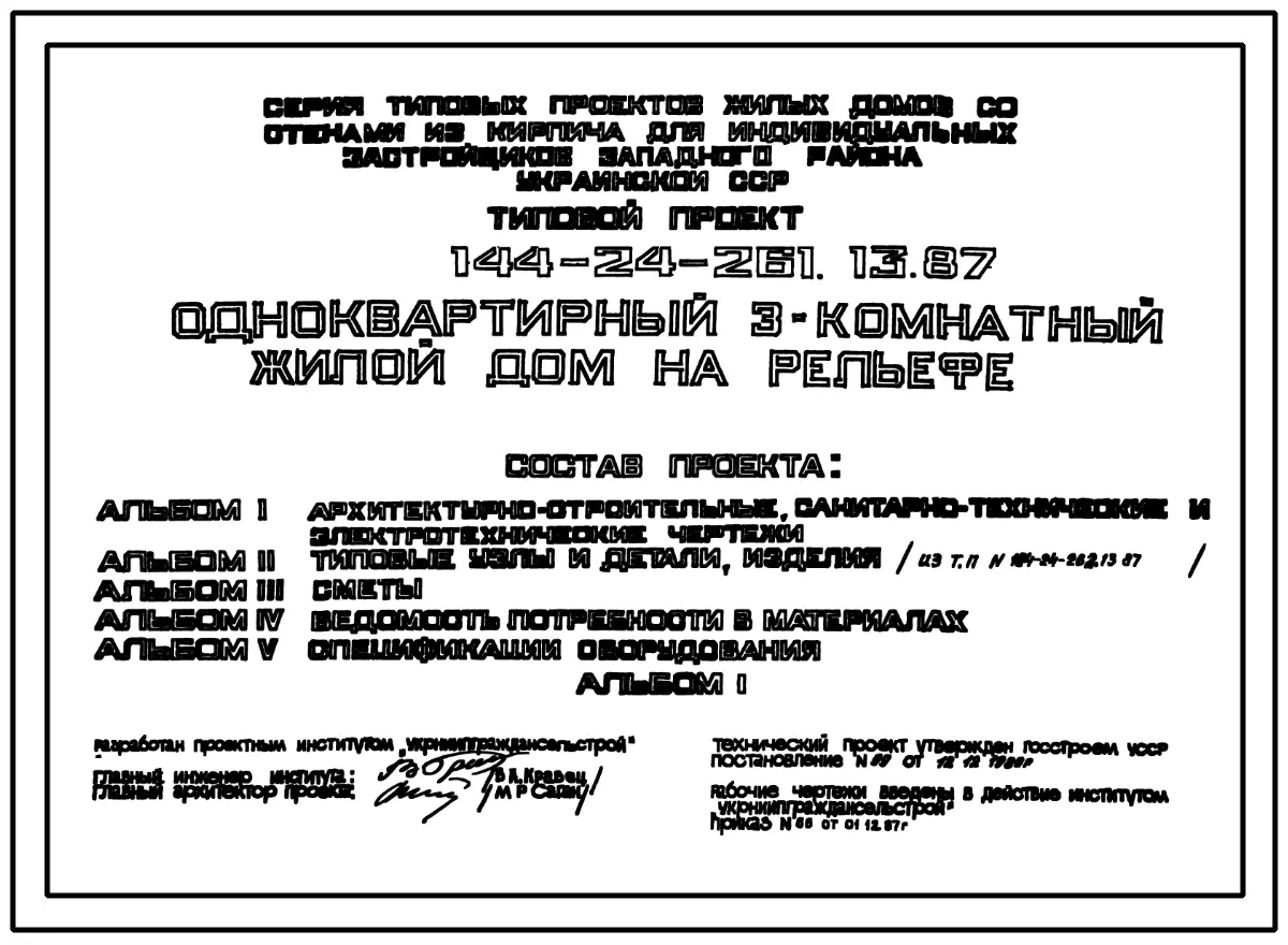 Типовой проект 144-24-261.13.87 Одноквартирный 3-комнатный жилой дом на рельефе. Паспорт проекта (формат PDF) Чертежи (формат TIF)