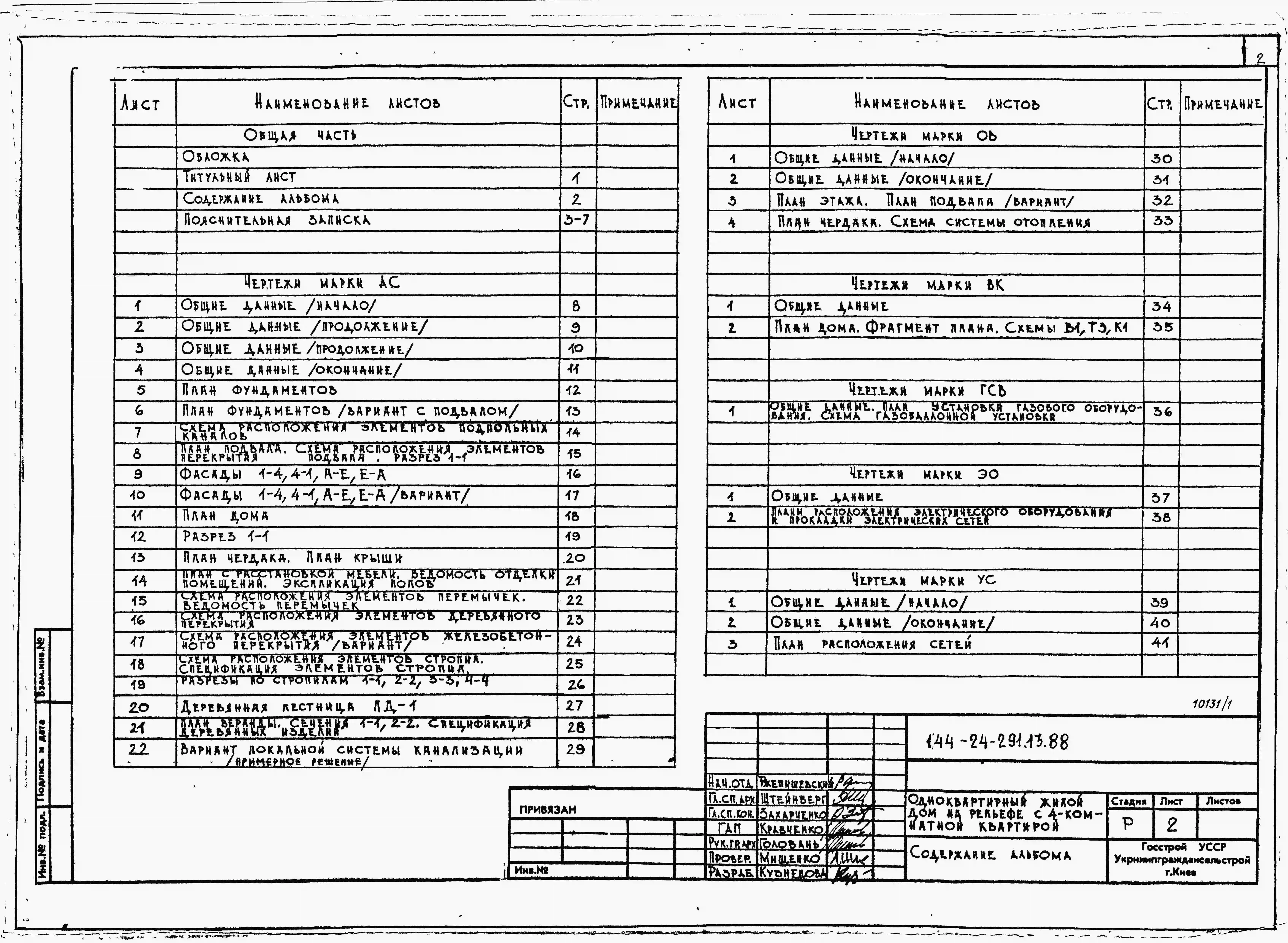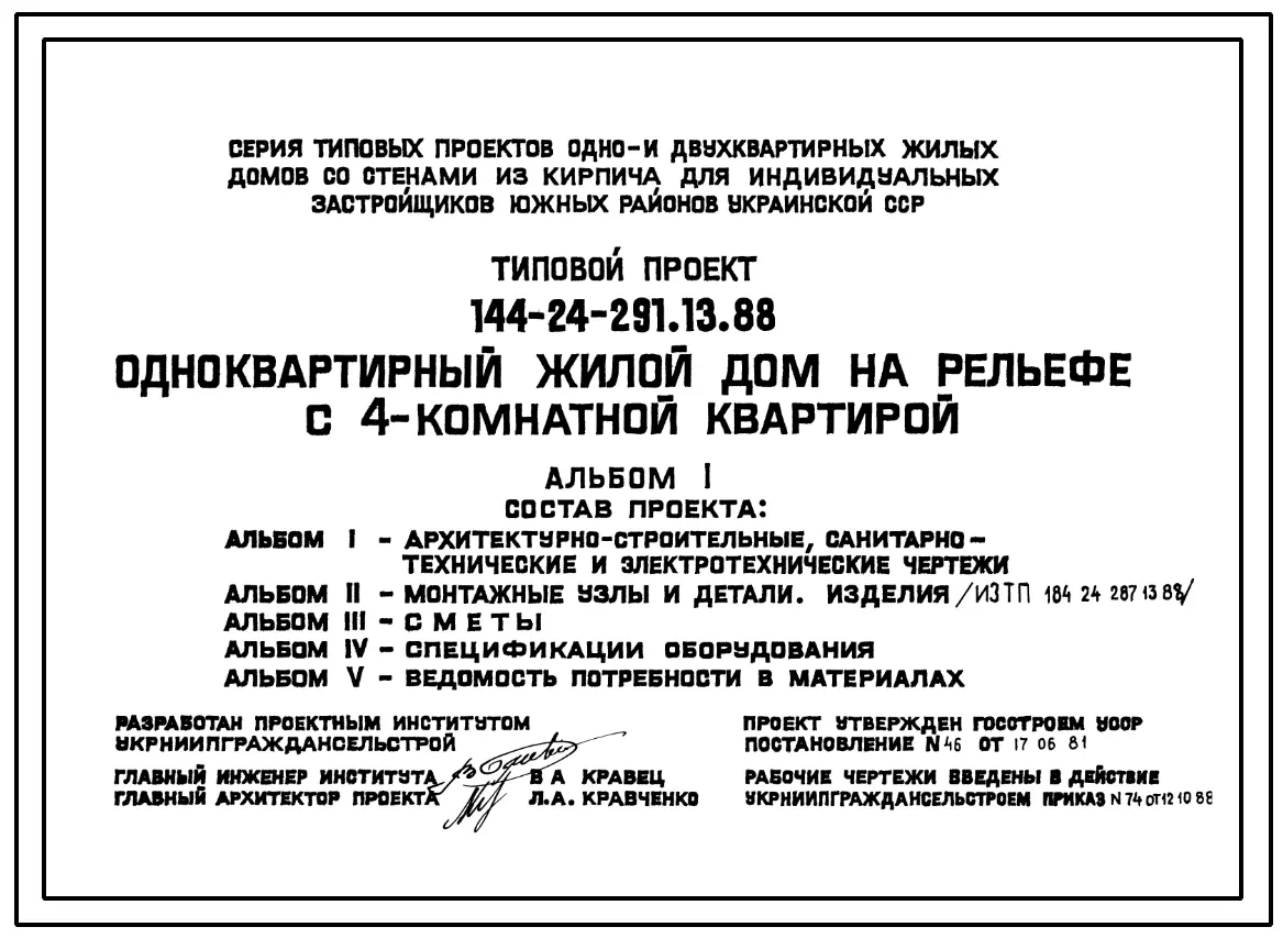 Типовой проект 144-24-291.13.88 Одноквартирный жилой дом на рельефе с 4-комнатной квартирой (для индивидуальных застройщиков южных районов УССР). Паспорт проекта (формат PDF) Чертежи (формат TIF)