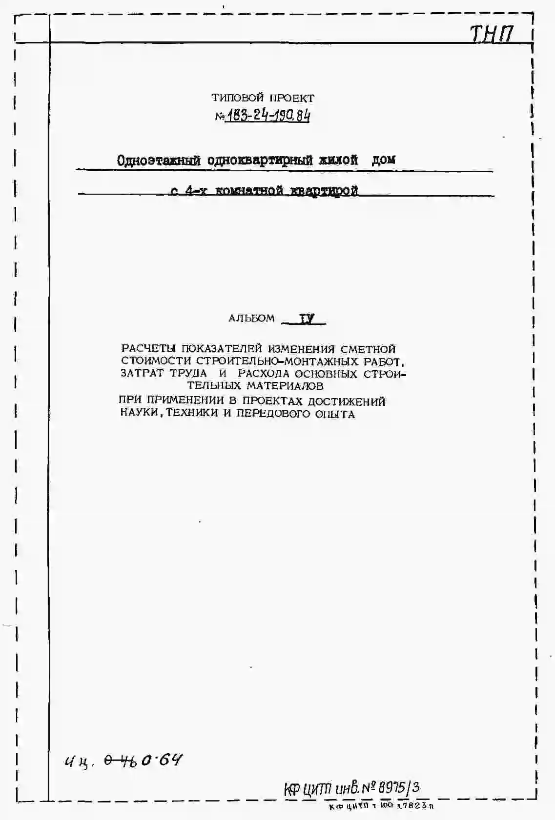 Типовой проект 183-24-190.84 Одноэтажный одноквартирный жилой дом с 4-комнатной квартирой для государственного строительства. Паспорт проекта (формат PDF) Чертежи (формат TIF)