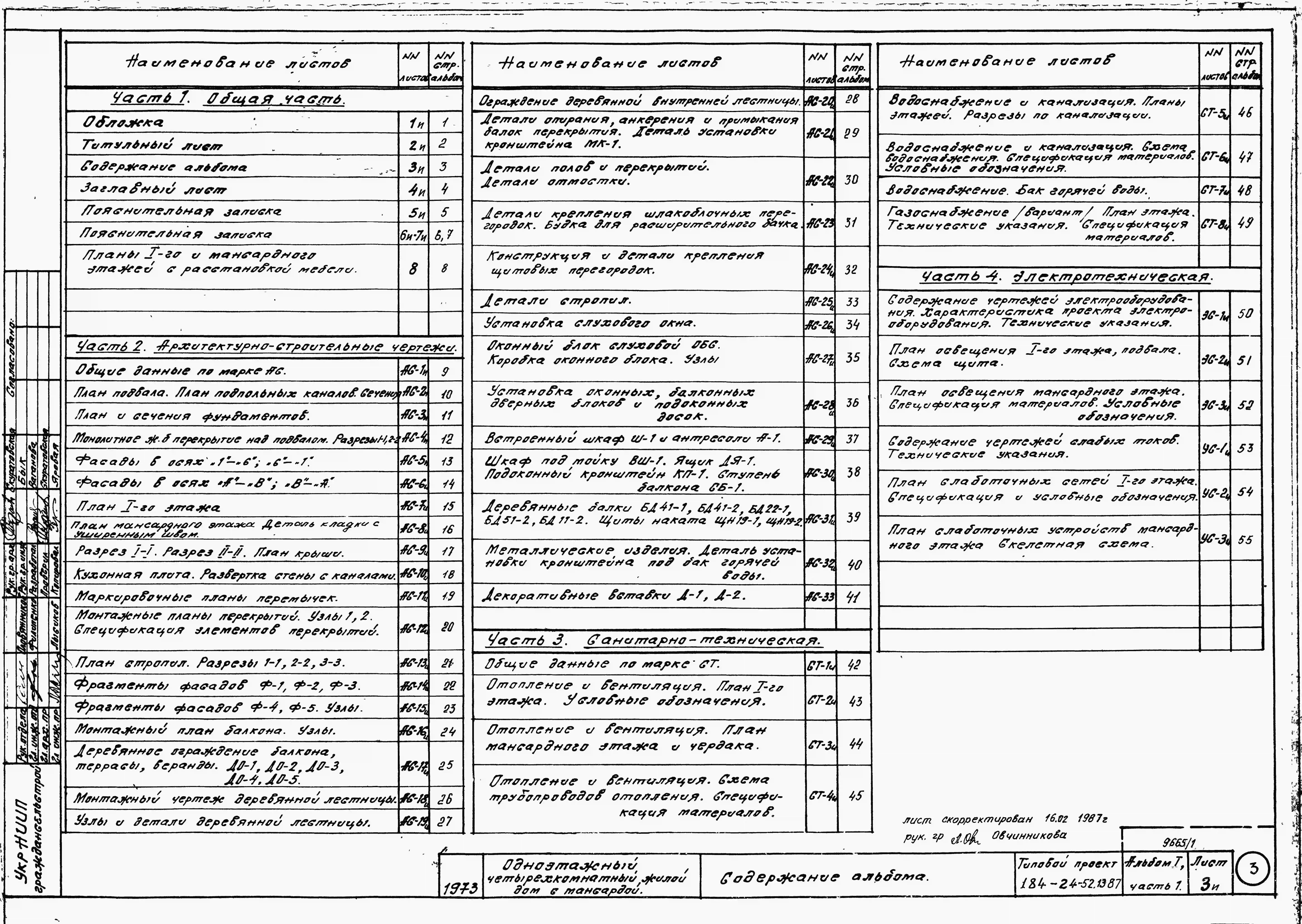 Типовой проект 184-24-52.13.87 Одноэтажный четырехкомнатный жилой дом с мансардой (для строительства в северных и центральных районах УССР). Паспорт проекта (формат PDF) Чертежи (формат TIF)