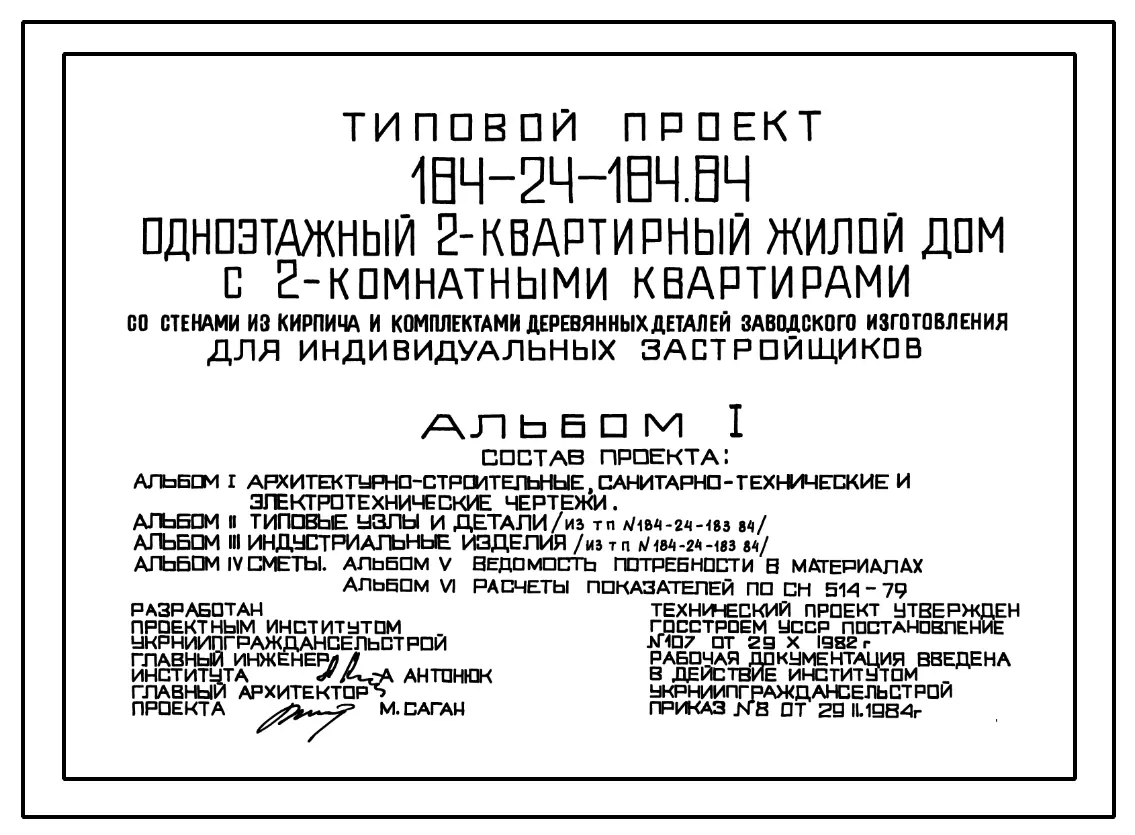 Типовой проект 184-24-184.84 Одноэтажный двухквартирный жилой дом с 2-комнатными квартирами со стенами из кирпича и комплектами деревянных деталей заводского изготовления для индивидуальных застройщиков. Паспорт проекта (формат PDF) Чертежи (формат TIF)