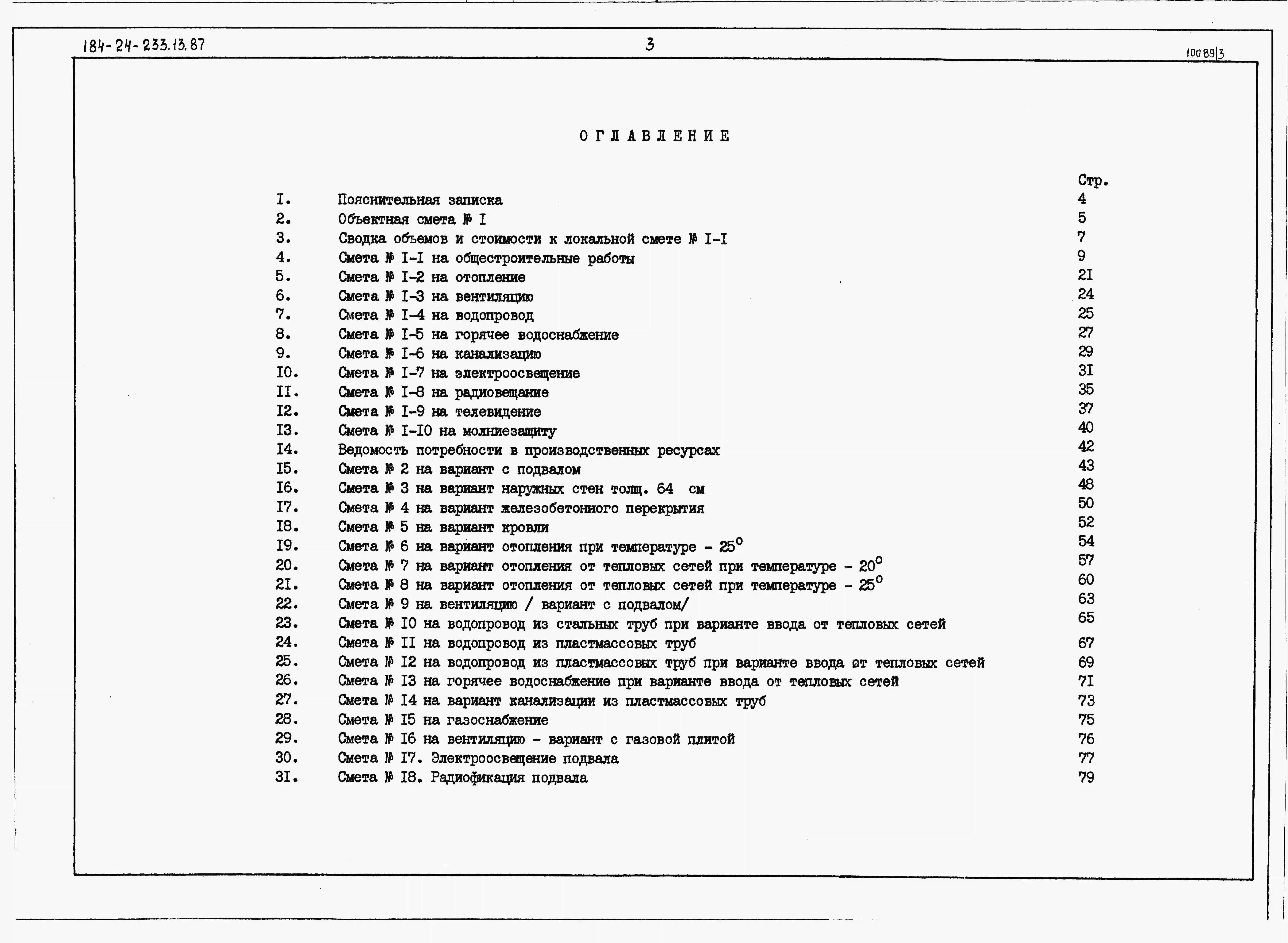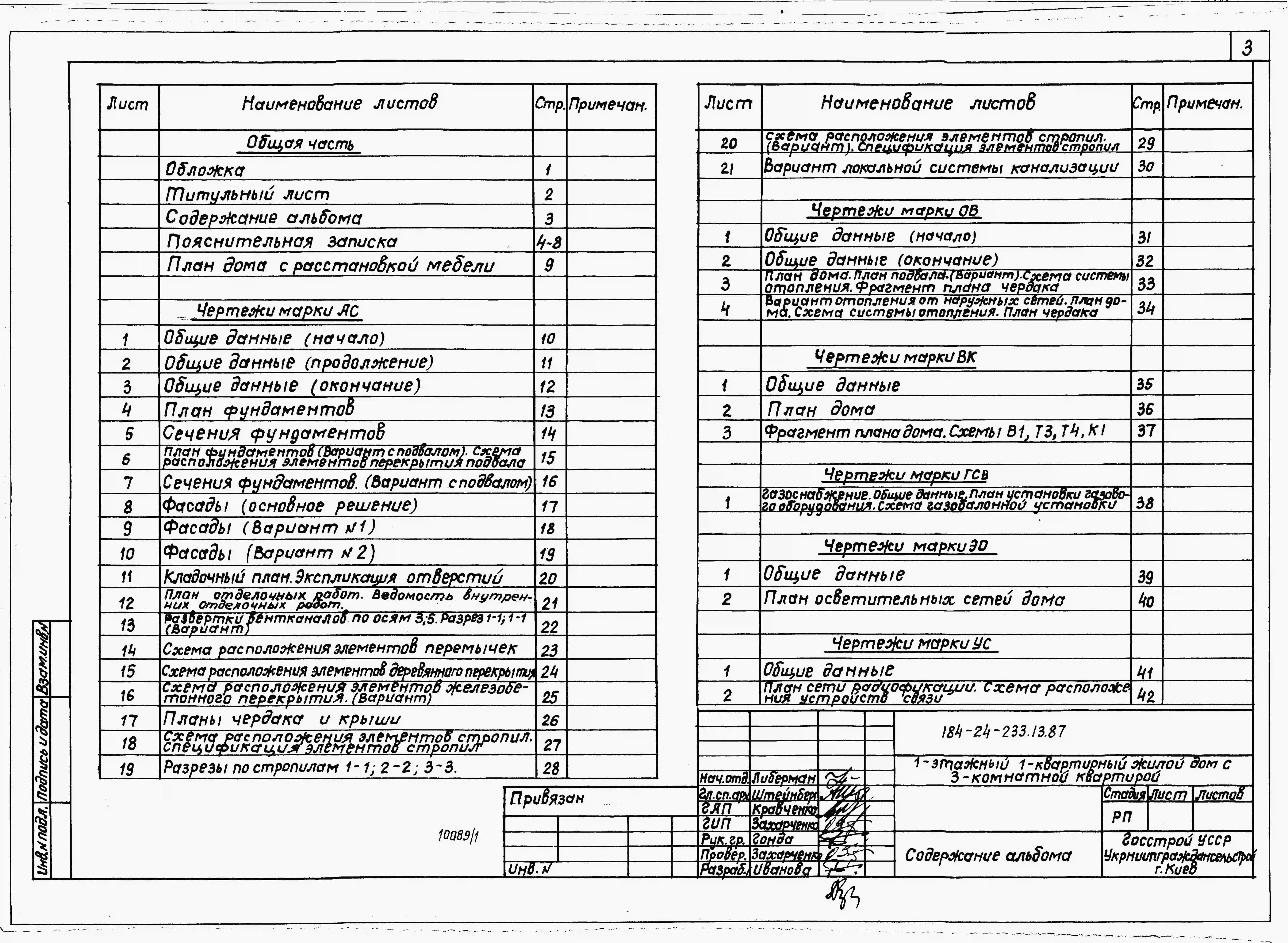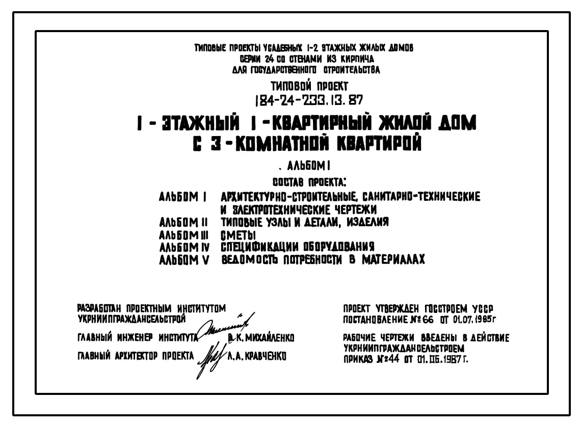 Типовой проект 184-24-233.13.87 1-этажный 1-квартирный жилой дом с 3-комнатной квартирой (для строительства в северно-центральных районах Украинской ССР). Паспорт проекта (формат PDF) Чертежи (формат TIF)