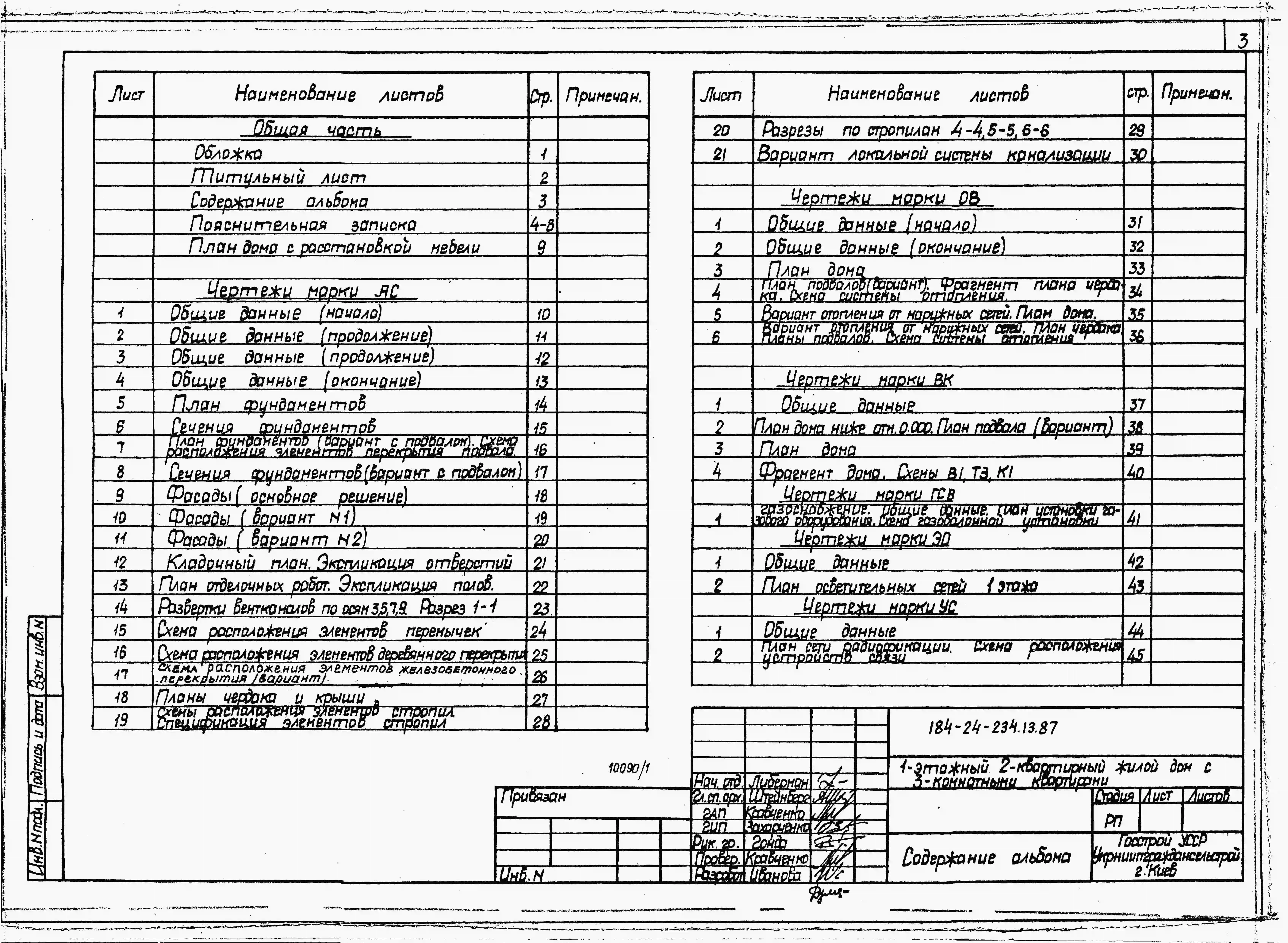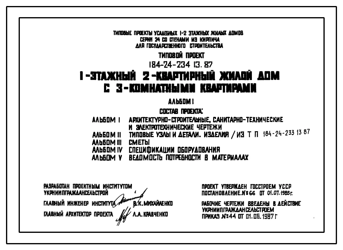 Типовой проект 184-24-234.13.87 1-этажный 2-квартирный жилой дом с 3-комнатными квартирами (для строительства в северно-центральных районах Украинской ССР). Паспорт проекта (формат PDF) Чертежи (формат TIF)