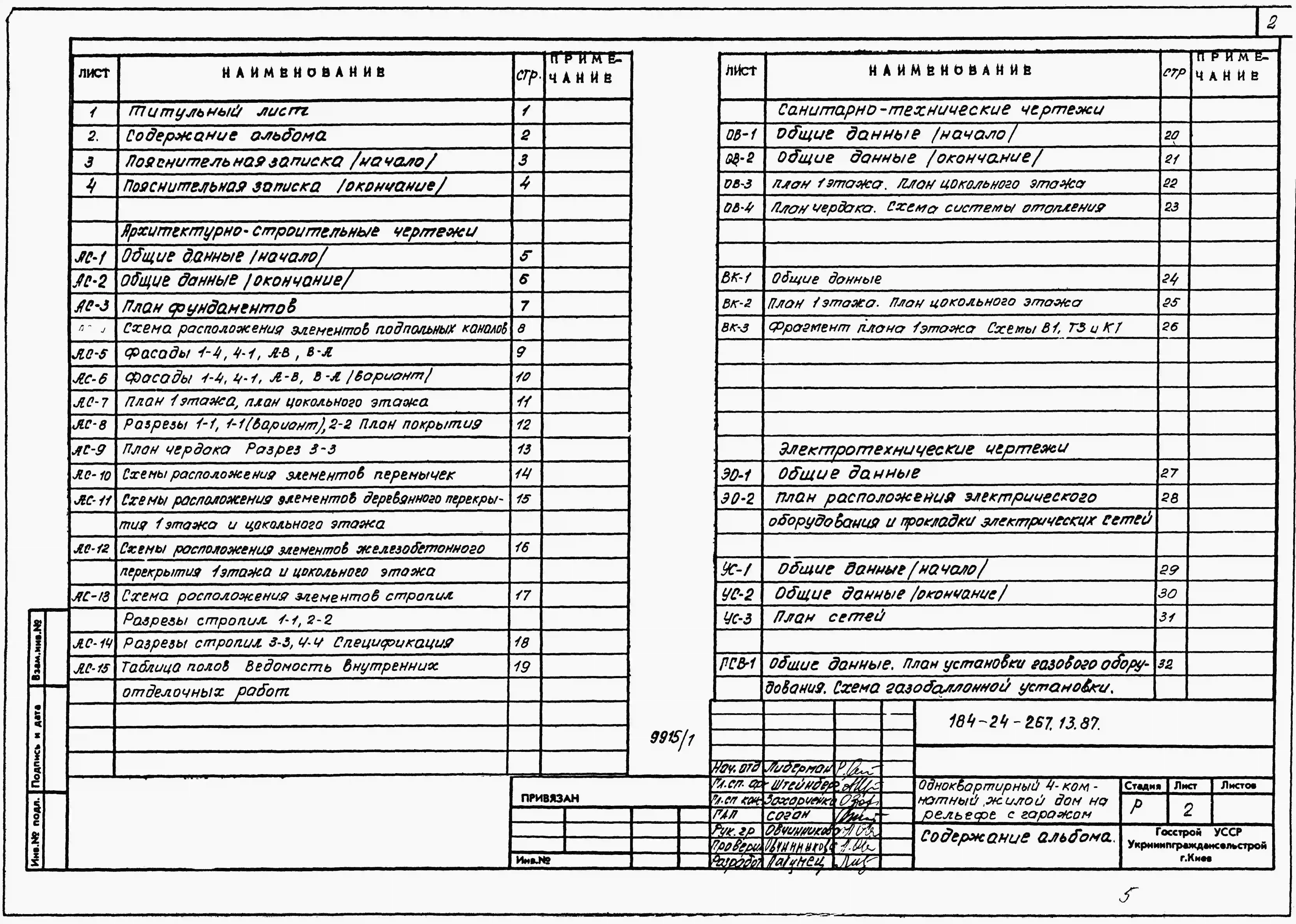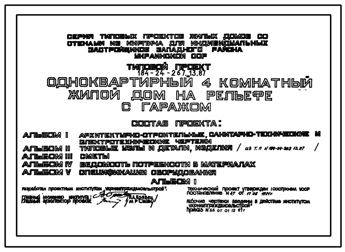Типовой проект 184-24-267.13.87 Одноквартирный четырехкомнатный жилой дом на рельефе с гаражом (для индивидуальных застройщиков западных районов УССР). Паспорт проекта (формат PDF) Чертежи (формат TIF)
