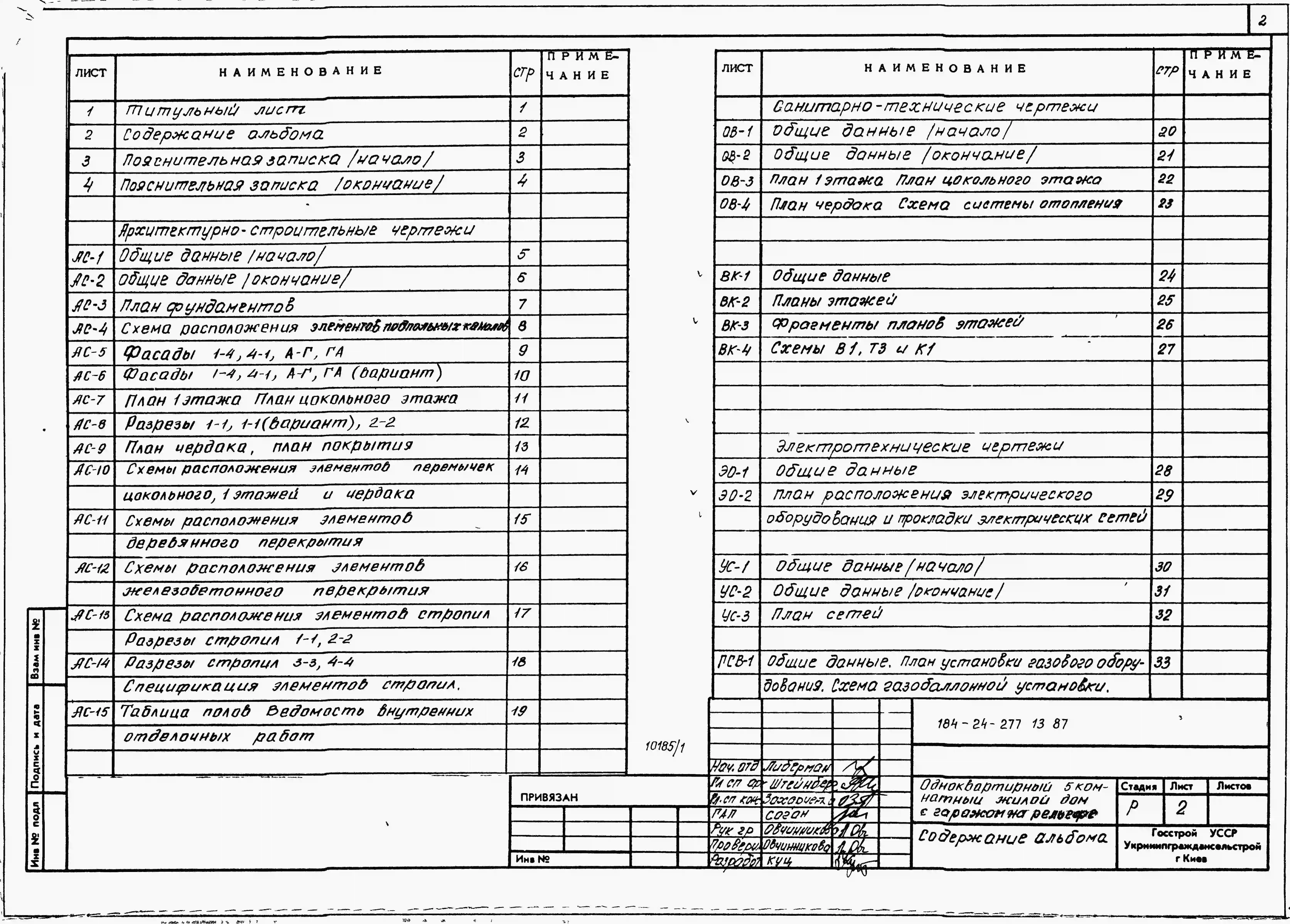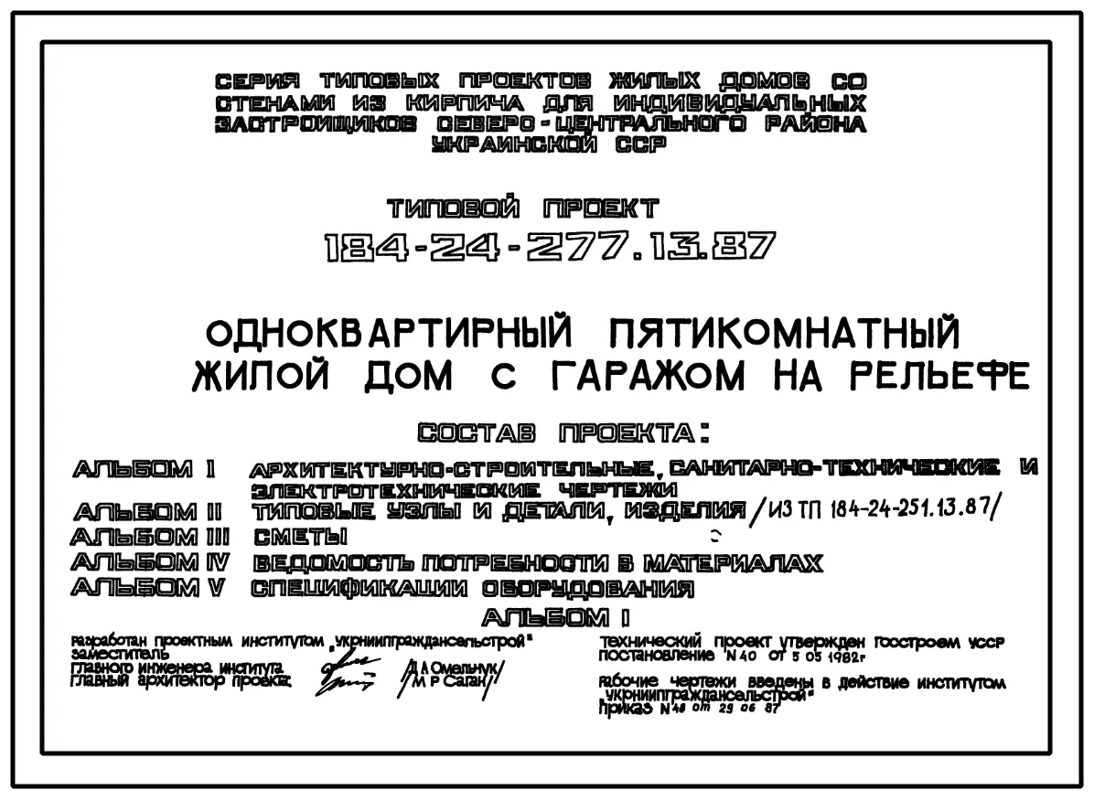 Типовой проект 184-24-277.13.87 Одноквартирный пятикомнатный жилой дом с гаражом на рельефе (для индивидуальных застройщиков северо-центральных районов УССР). Паспорт проекта (формат PDF) Чертежи (формат TIF)