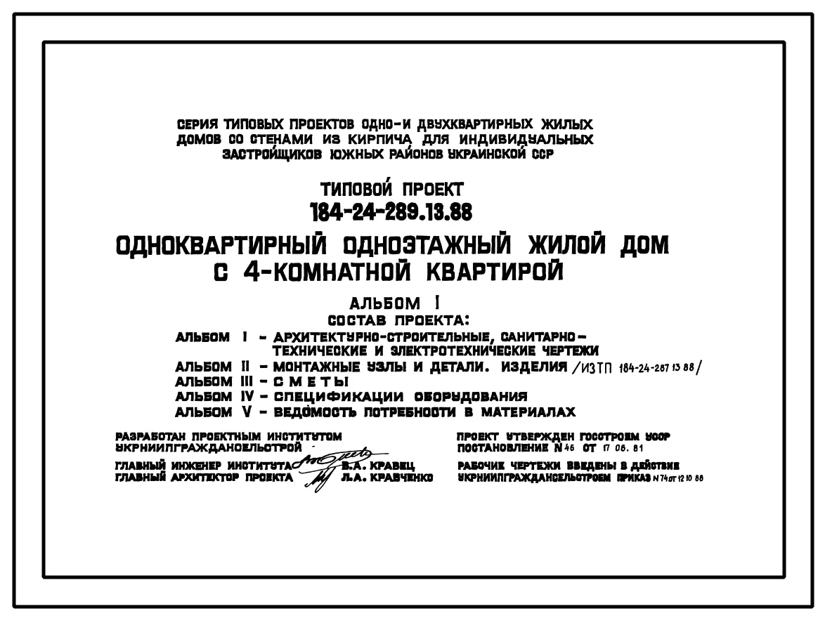 Типовой проект 184-24-289.13.88 Одноквартирный одноэтажный жилой дом с 4-комнатной квартирой (для индивидуальных застройщиков южных районов УССР). Паспорт проекта (формат PDF) Чертежи (формат TIF)