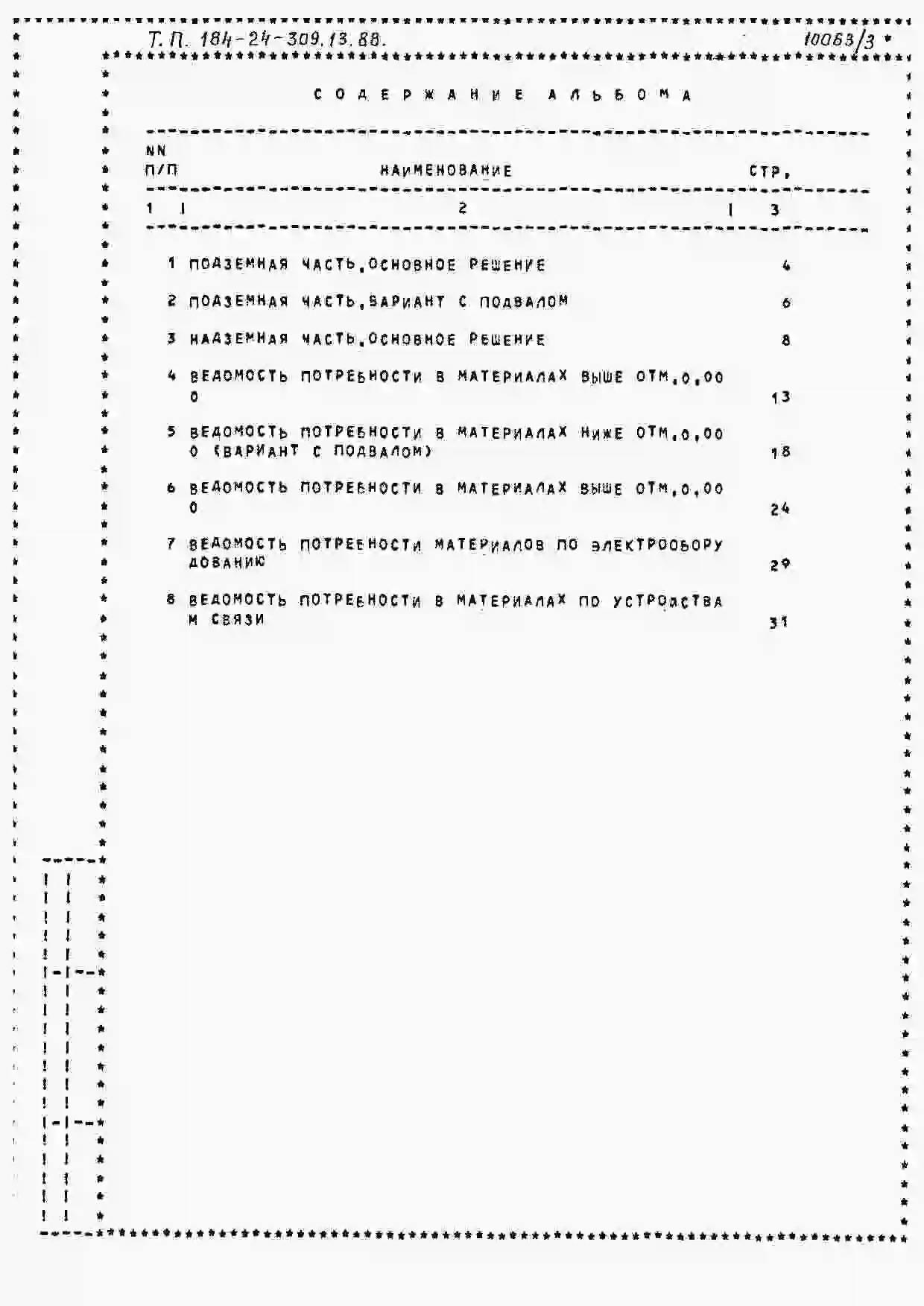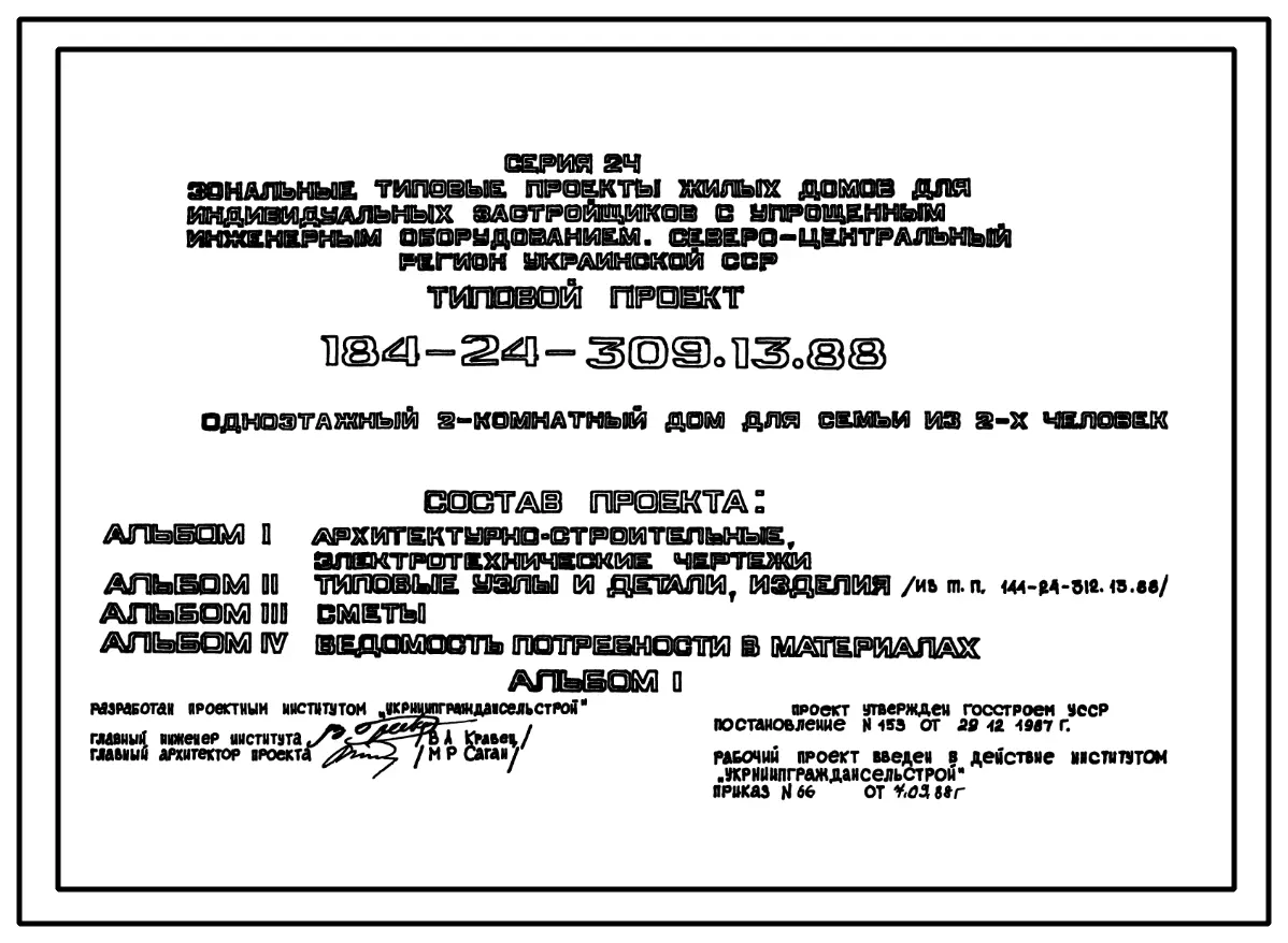 Типовой проект 184-24-309.13.88 Одноэтажный 2 комнатный дом для семьи из 2 человек (с упрощенным инженерным оборудованием для индивидуальных застройщиков северо-центрального региона Украинской ССР). Паспорт проекта (формат PDF) Чертежи (формат TIF)