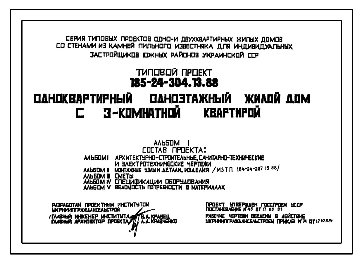 Типовой проект 185-24-304.13.88 Одноквартирный одноэтажный жилой дом с 3-комнатной квартирой . Стены из блоков пильного известняка.. Паспорт проекта (формат PDF) Чертежи (формат TIF)