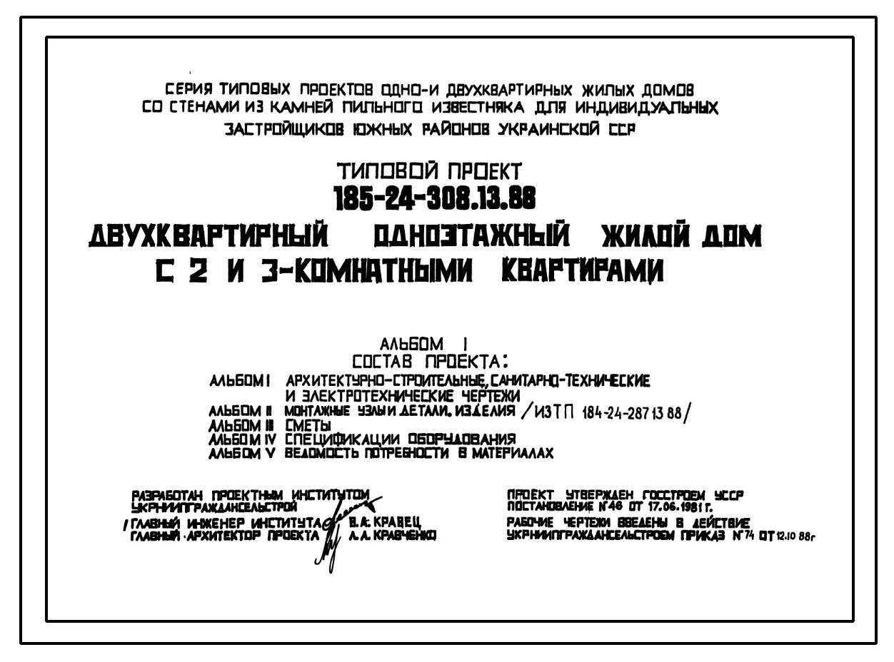 Типовой проект 185-24-308.13.88 Двухквартирный одноэтажный жилой дом с 2 и 3-комнатными квартирами Стены из блоков пильного известняка.. Паспорт проекта (формат PDF) Чертежи (формат TIF)