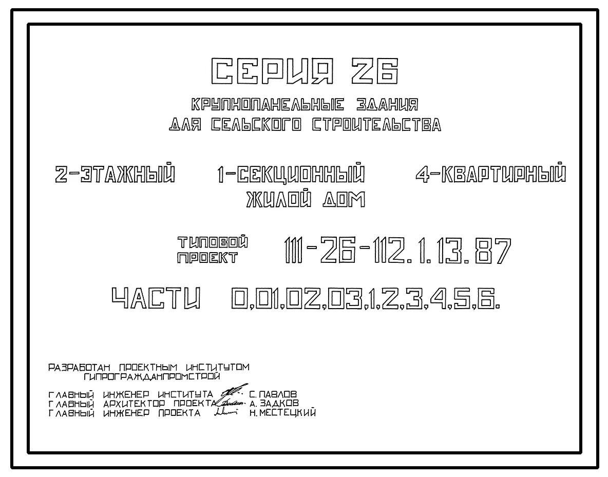 Типовой проект 111-26-112.1.13.87 Двухэтажный 1-секционный 4-квартирный жилой дом для сельского строительства. Паспорт проекта (формат PDF) Чертежи (формат TIF)