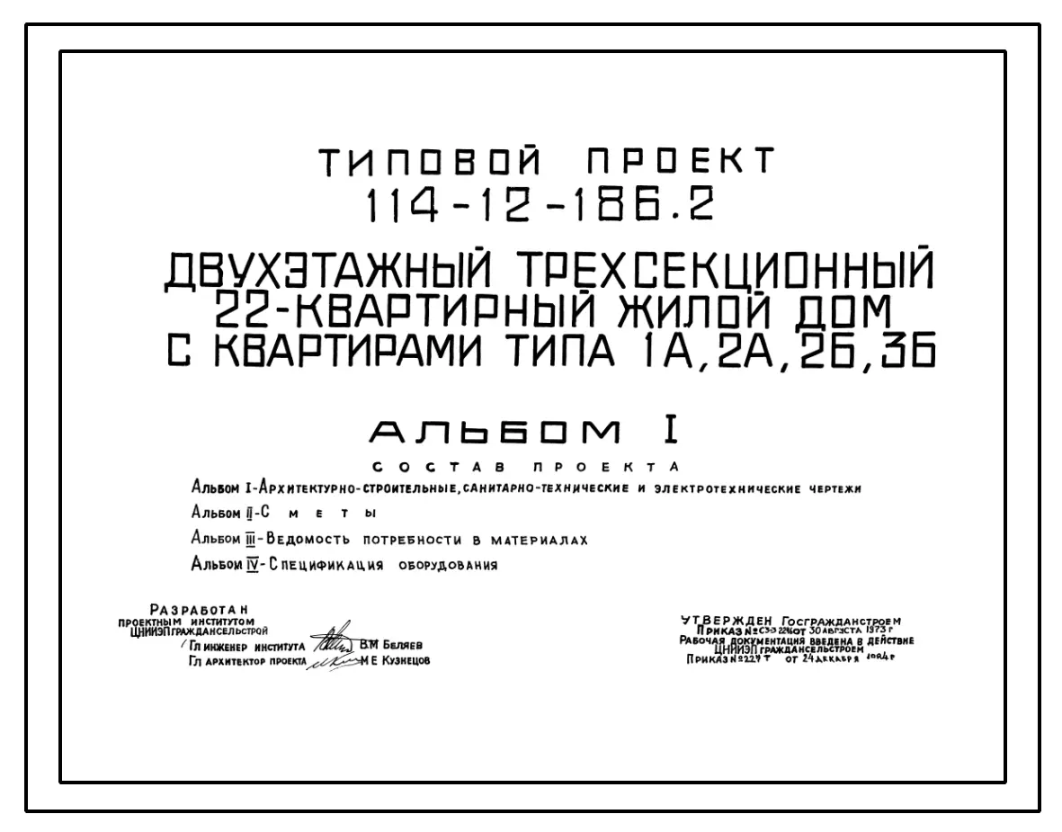 Типовой проект 114-12-186.2 Двухэтажный трехсекционный 22-квартирный жилой дом с квартирами типа 1А, 2А, 2Б, 3Б. Чертежи (формат TIF)