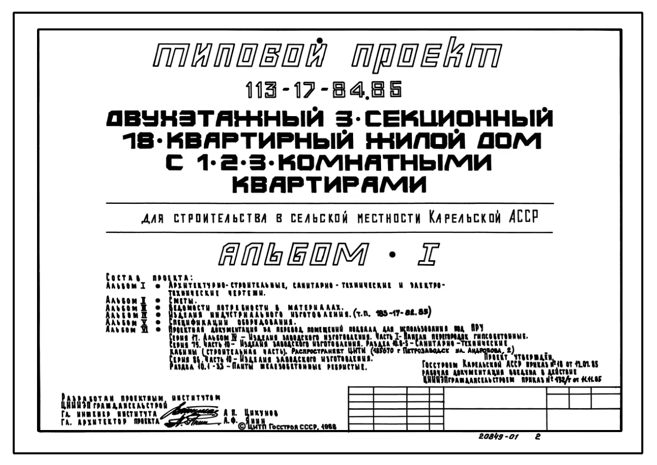 Типовой проект 113-17-84.85 Трехсекционный дом на 18 квартир (однокомнатных 1Б -6, двухкомнатных 2Б – 6, трехкомнатных 3Б – 6). СТЕНЫ ИЗ КРУПНЫХ ЛЕГКОБЕТОННЫХ БЛОКОВ, для строительства в Карельской АССР. Паспорт проекта (формат PDF) Чертежи (формат TIF)