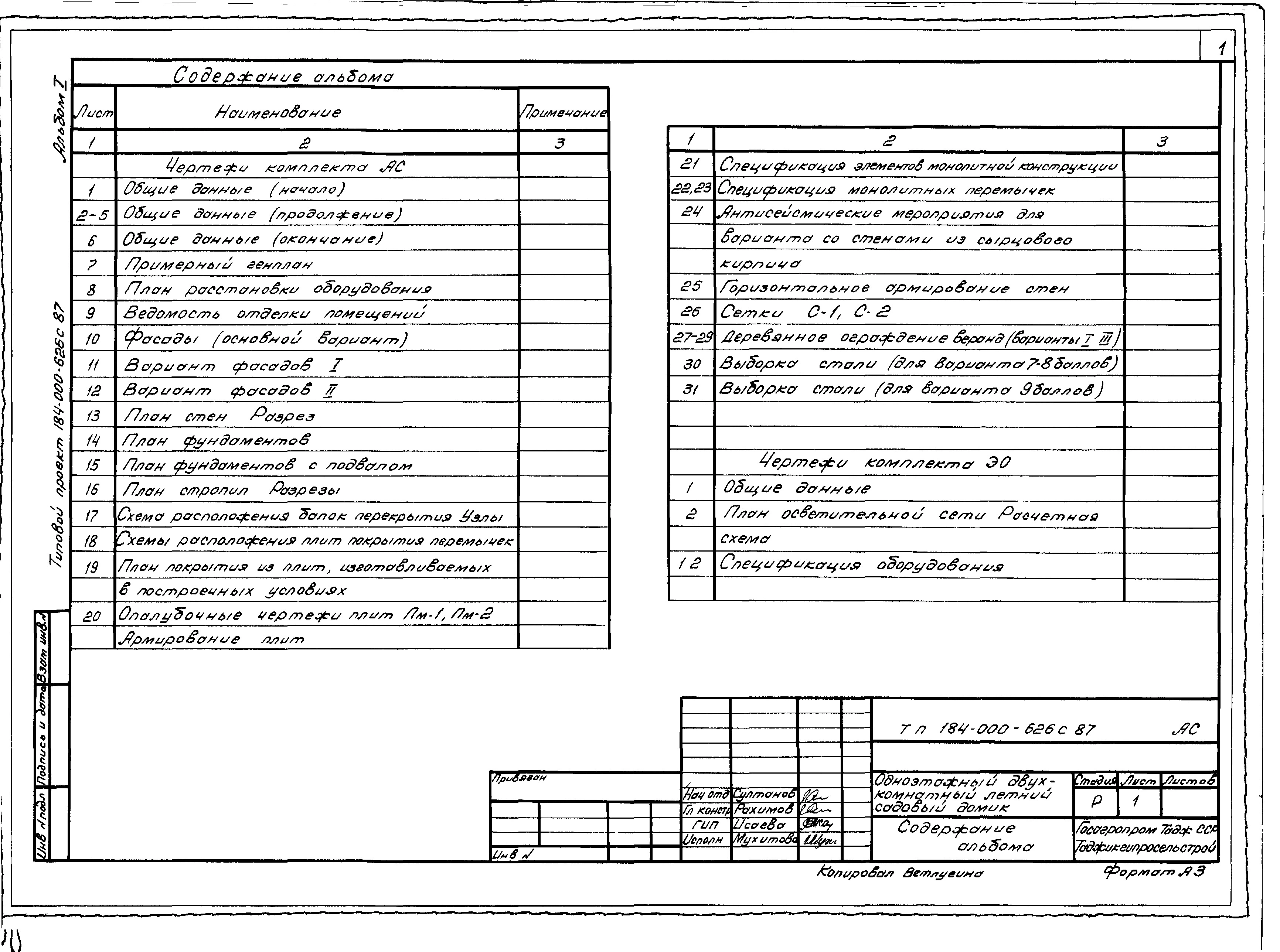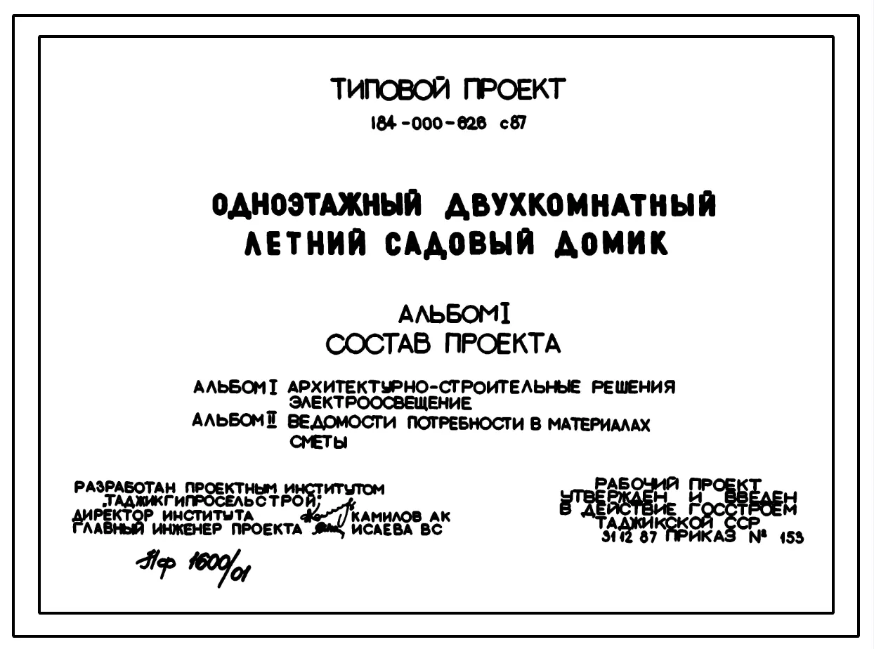 Типовой проект 184-000-626с.87 Одноэтажный двухкомнатный летний садовый домик. Паспорт проекта (формат PDF) Чертежи (формат TIF)