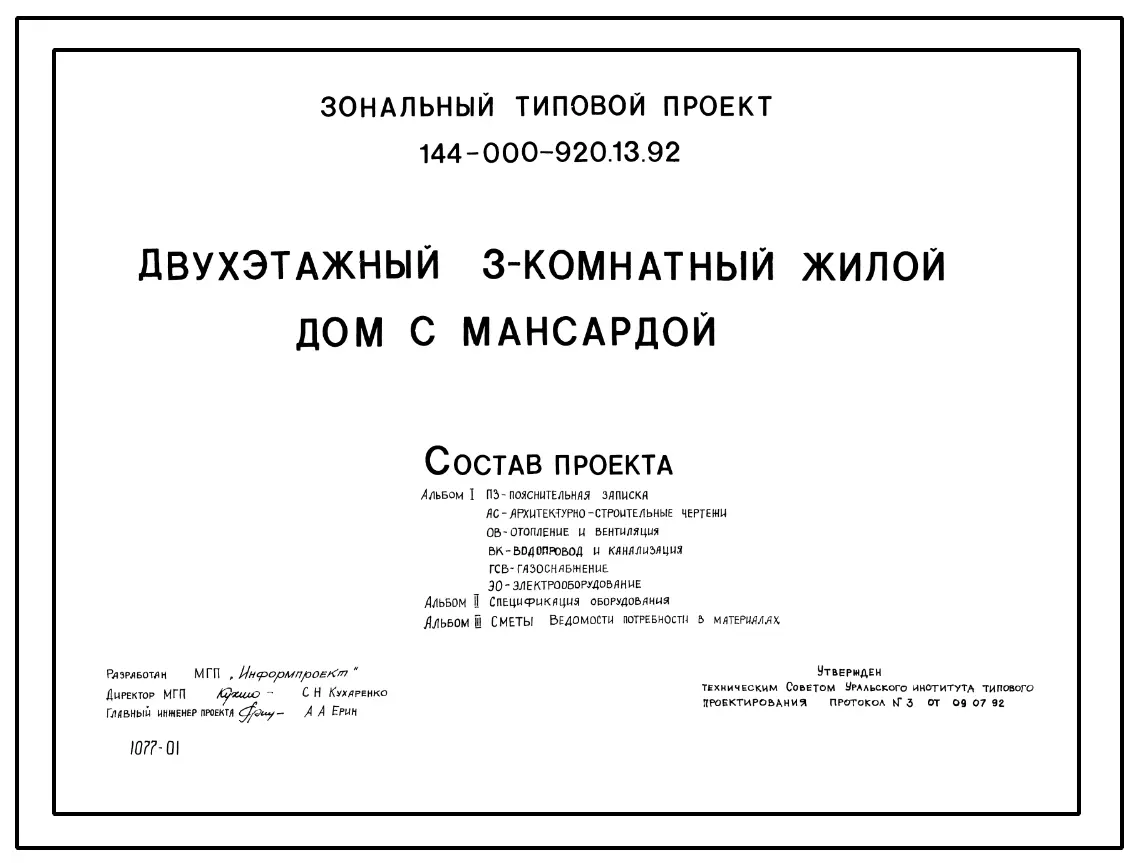 Типовой проект 144-000-920.13.92 Двухэтажный трехкомнатный жилой дом с мансардой (для строительства в Уральской зоне России)
