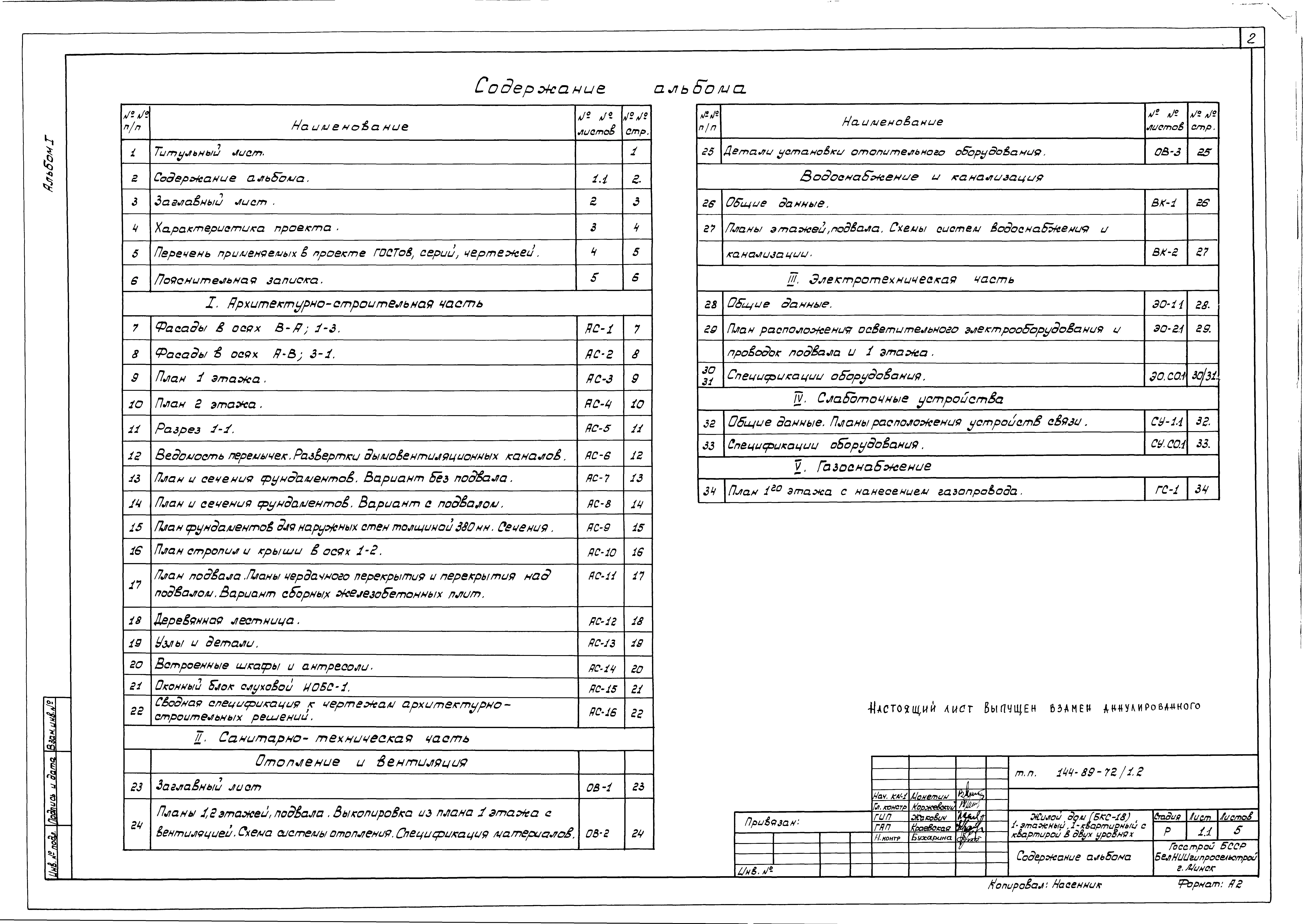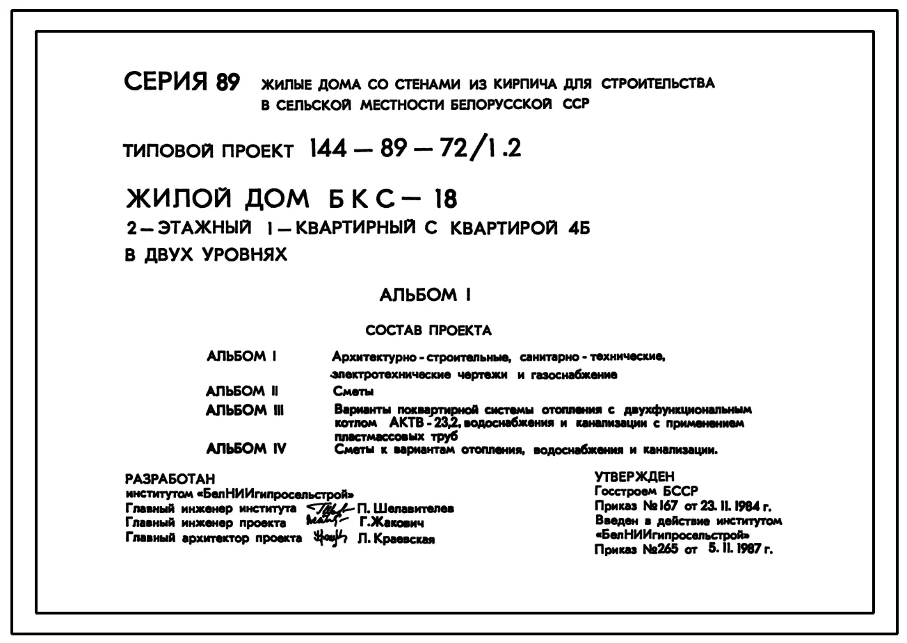 Типовой проект 144-89-72/1.2 Жилой дом (БКС-18) 2-этажный с квартирой 4Б в двух уровнях. Паспорт проекта (формат PDF) Чертежи (формат TIF)