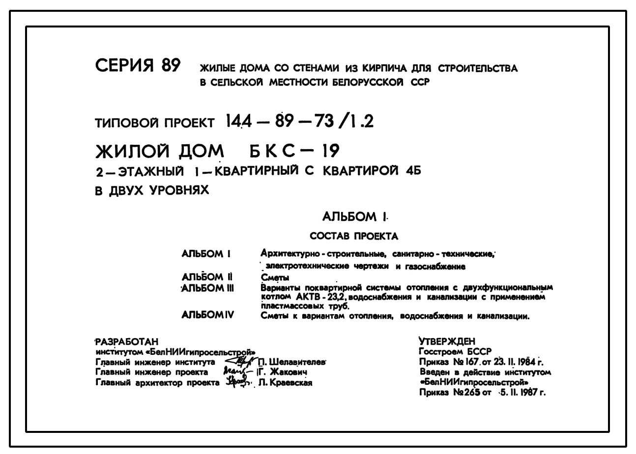 Типовой проект 144-89-73/1.2 Жилой дом (БКС-19) 2-этажный, 1-квартирный с квартирой 4Б в двух уровнях. Паспорт проекта (формат PDF) Чертежи (формат TIF)