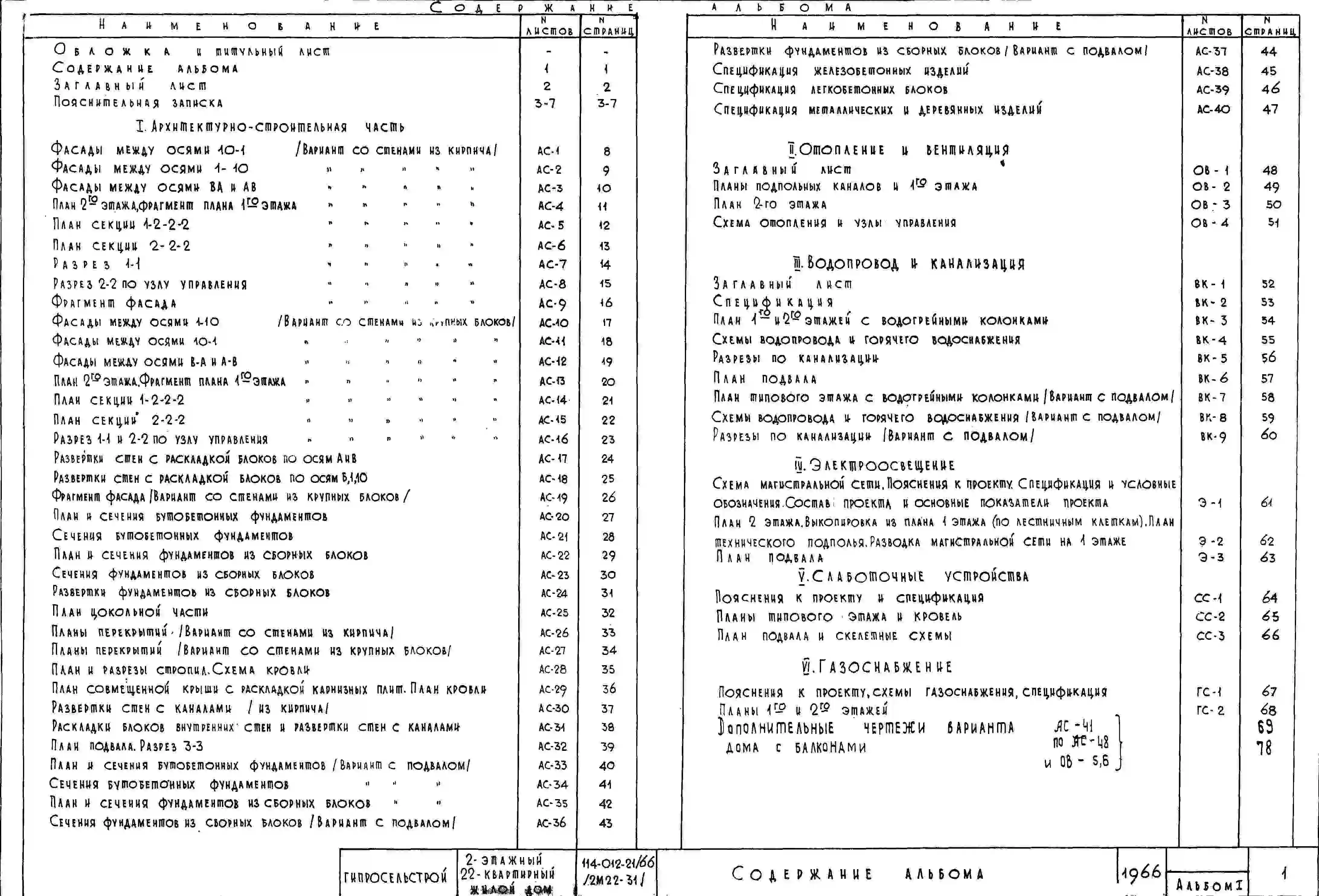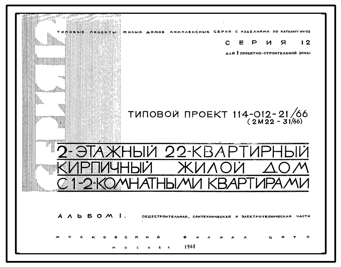 Типовой проект 114-012-21/66 Двухэтажный трехсекционный дом на 22 квартиры. Для строительства во II и III строительно-климатических зонах.. Чертежи (формат TIF)