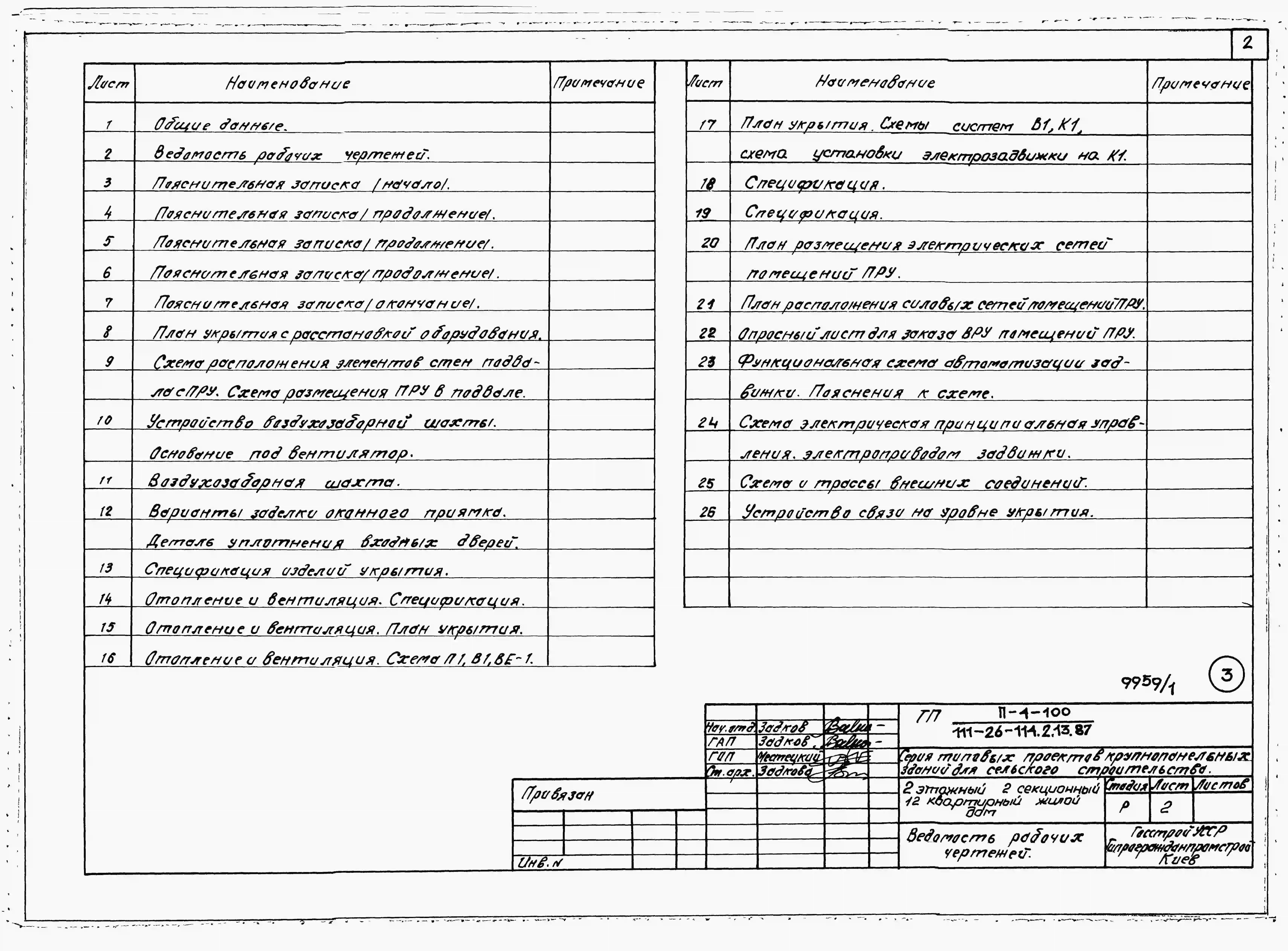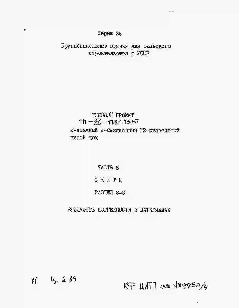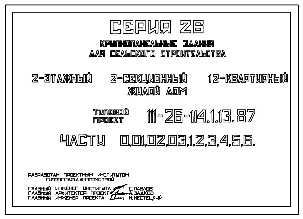 Типовой проект 111-26-114.1.13.87 2-этажный 2-секционный 12-квартирный жилой дом (1-2-2; 1-3-3) /для строительства в УССР/. Паспорт проекта (формат PDF) Чертежи (формат TIF)