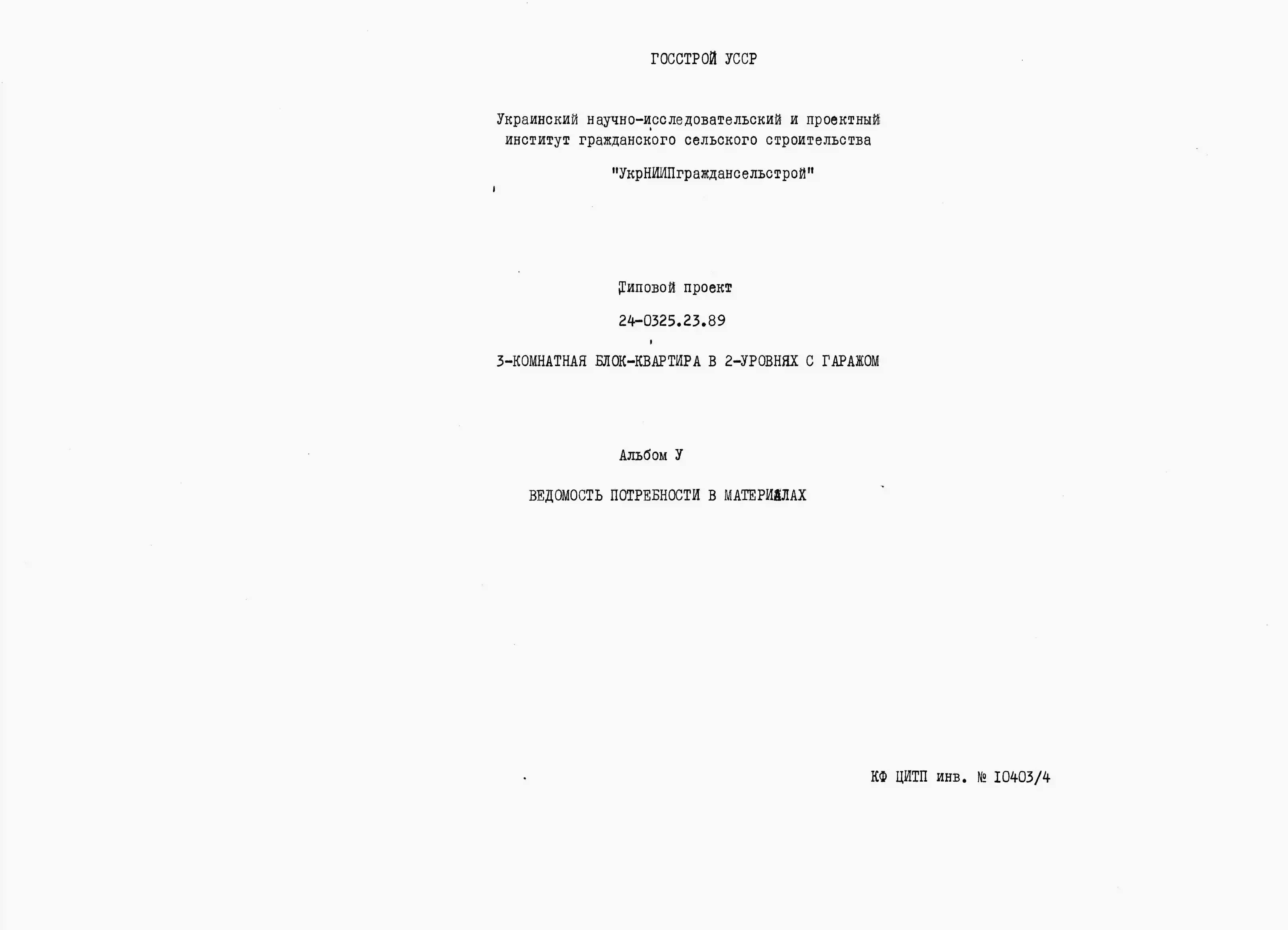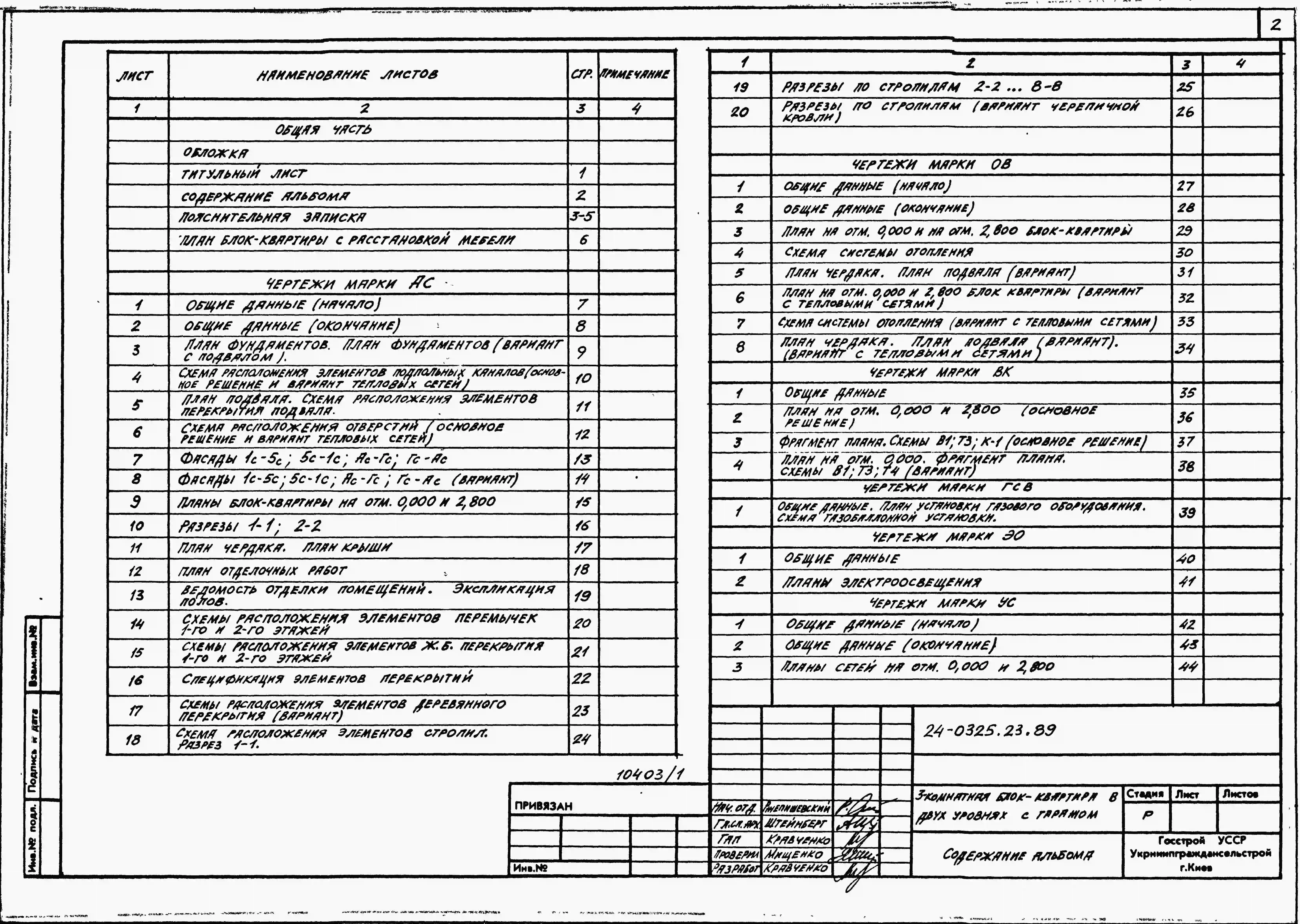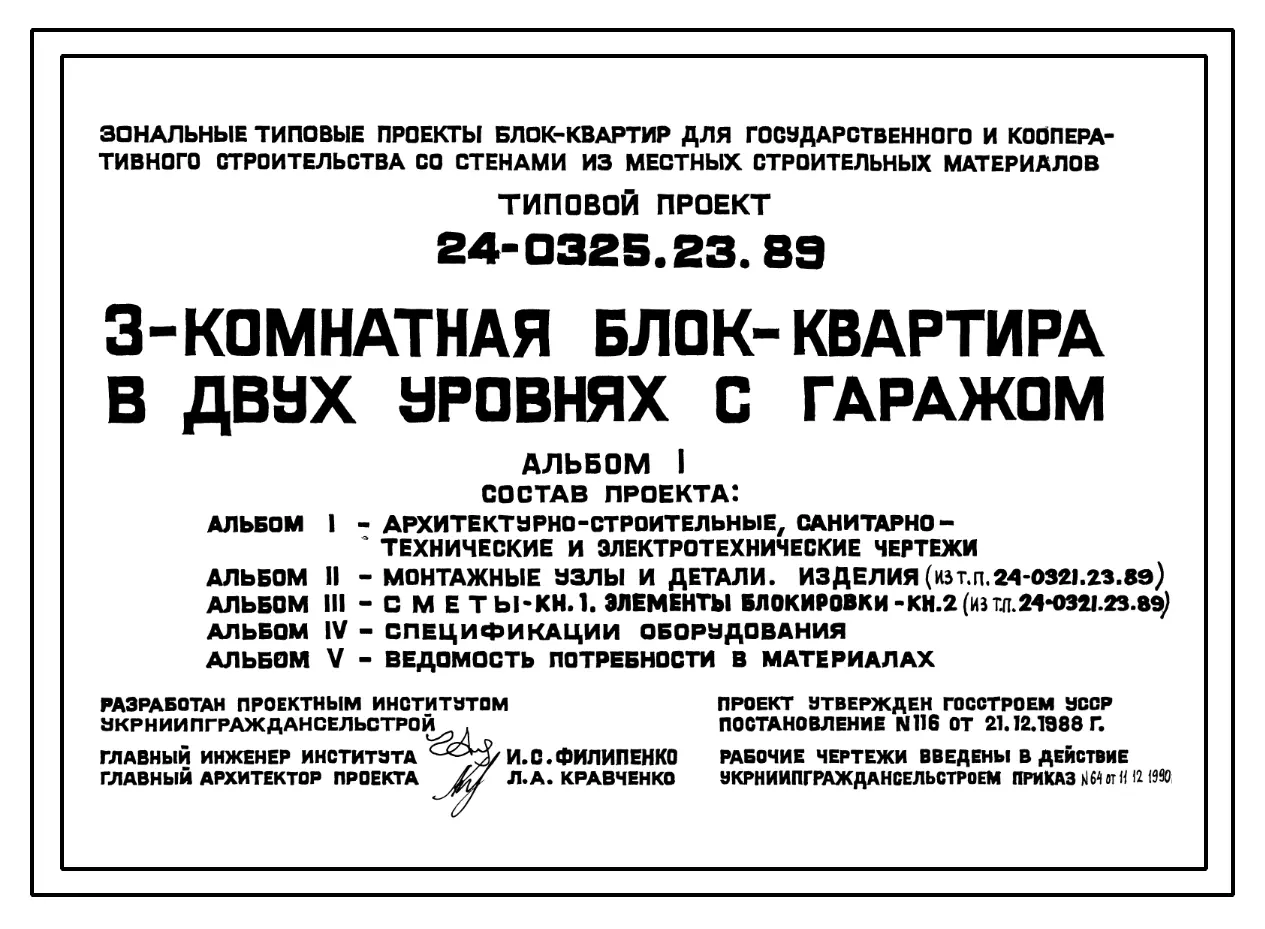 Типовой проект 24-0325.23.89 3-комнатная блок-квартира в двух уровнях с гаражом (для строительства в Украинской ССР). Паспорт проекта (формат PDF) Чертежи (формат TIF)