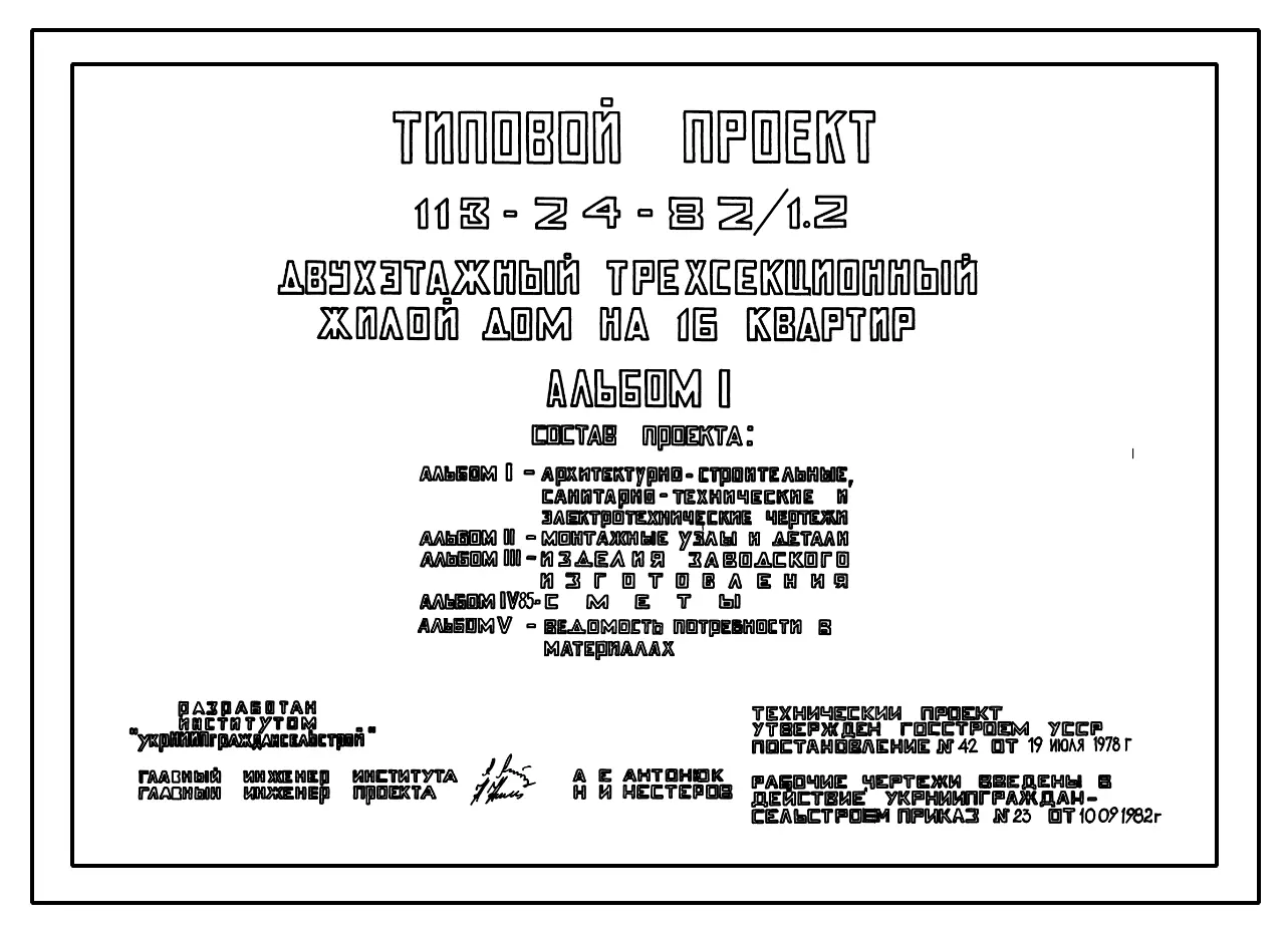 Типовой проект 113-24-82/1.2 Двухэтажный трехсекционный жилой дом на 16 квартир. Паспорт проекта (формат PDF) Чертежи (формат TIF)