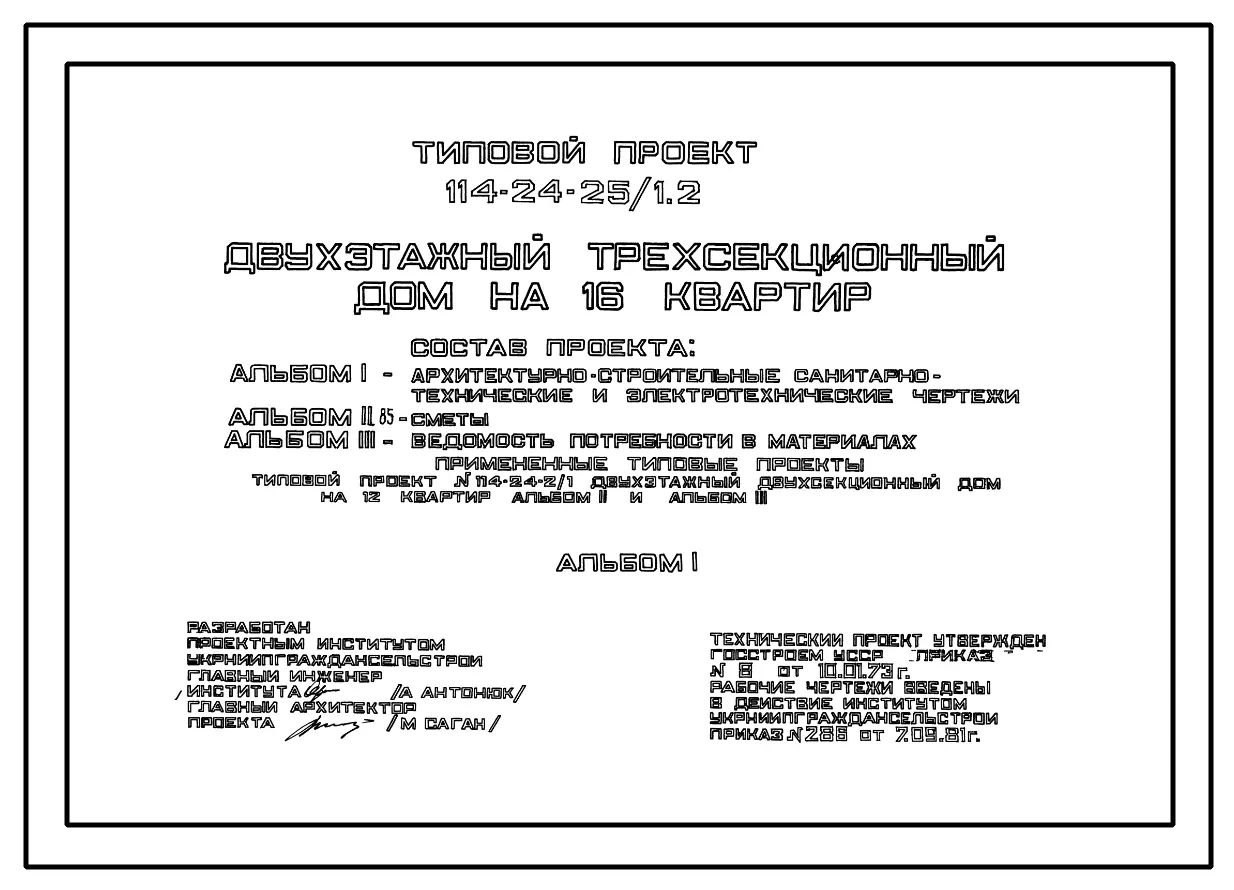 Типовой проект 114-24-25/1.2 Двухэтажный трехсекционный дом на 16 квартир. Паспорт проекта (формат PDF) Чертежи (формат TIF)
