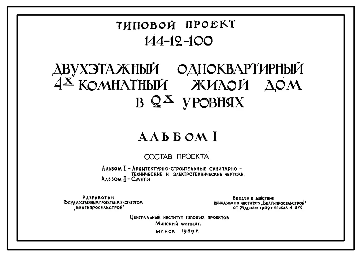 Типовой проект 144-12-100 2-этажный 1-квартирный 4-комнатный жилой дом в 2-х уровнях для индивидуального строительства в Белорусской ССР.. Паспорт проекта (формат PDF) Чертежи (формат TIF)