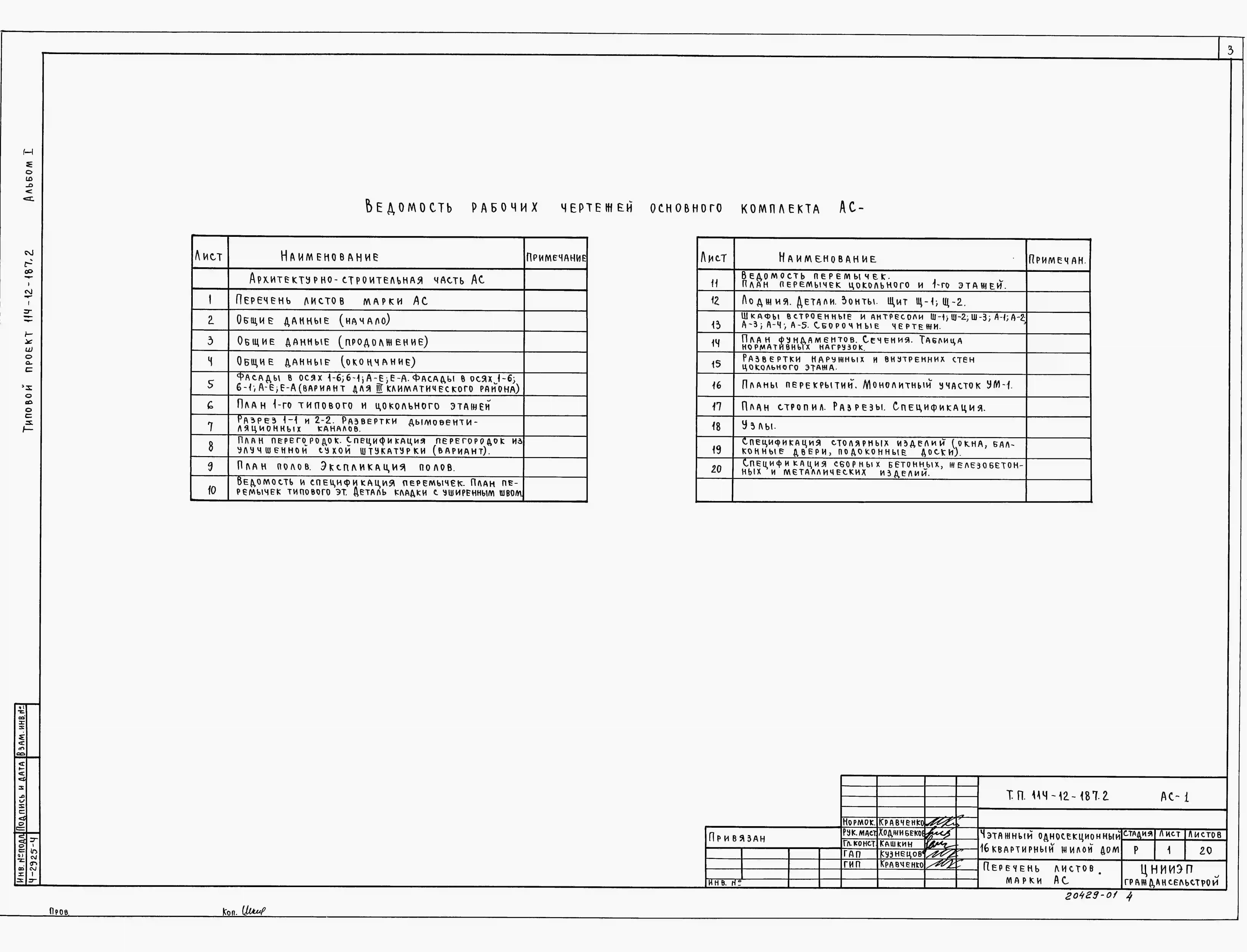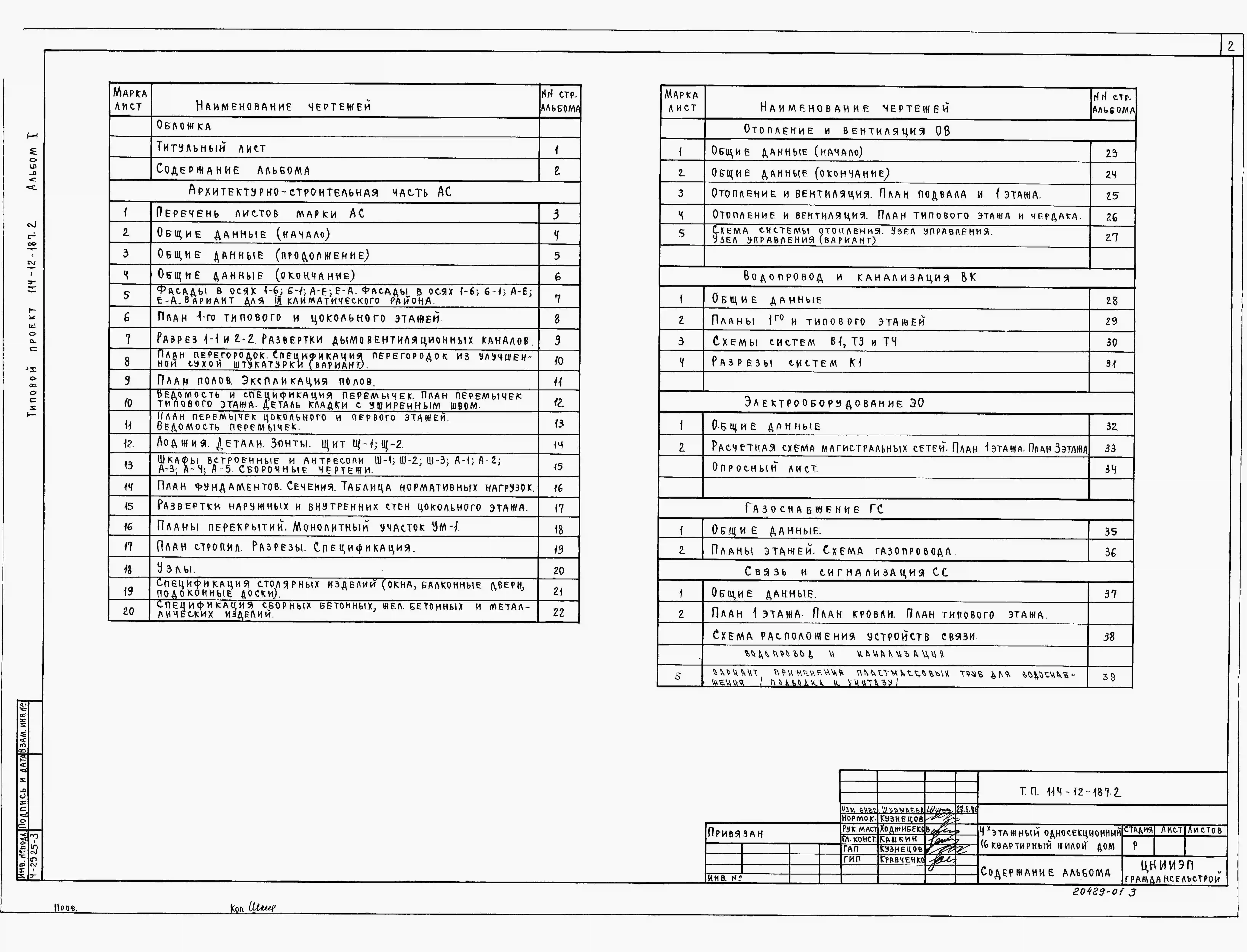 Типовой проект 114-12-187.2 Четырехэтажный односекционный 16-квартирный жилой дом с квартирами типа 2А, 2Б, 3А. Чертежи (формат TIF)