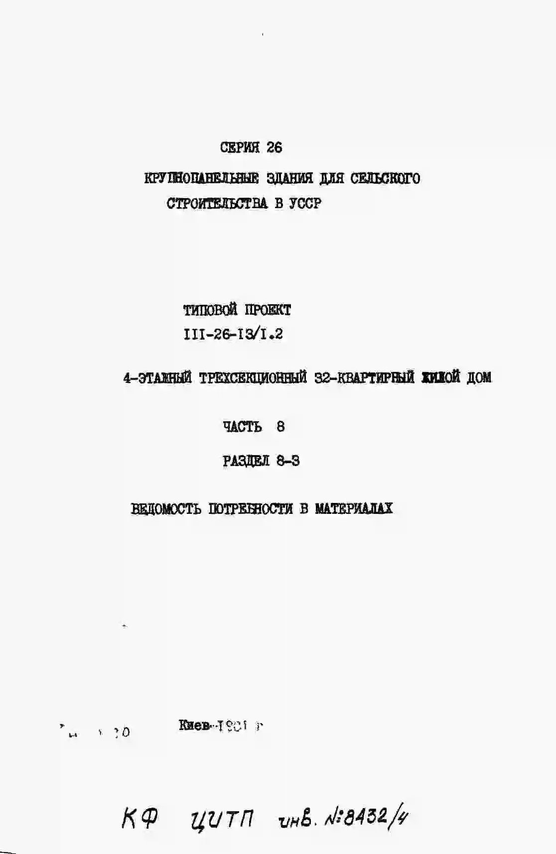 Типовой проект 111-26-13/1.2 4-этажный трехсекционный 32-квартирный жилой дом. Паспорт проекта (формат PDF) Чертежи (формат TIF)