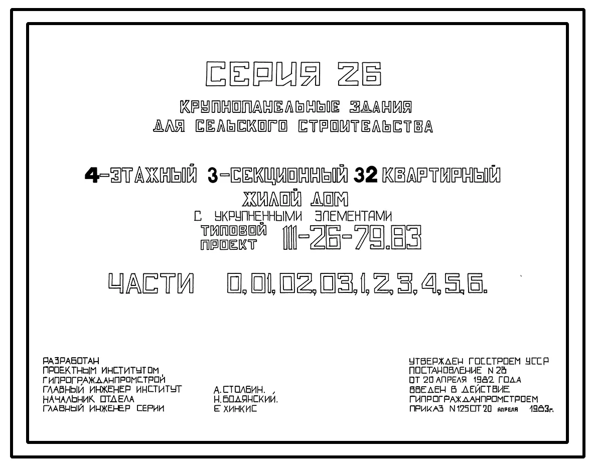 Типовой проект 111-26-79.83 4-этажный трехсекционный 32-квартирный жилой дом с укрупненными элементами /для Николаевского сельского строительного комбината Львовской области/. Паспорт проекта (формат PDF) Чертежи (формат TIF)