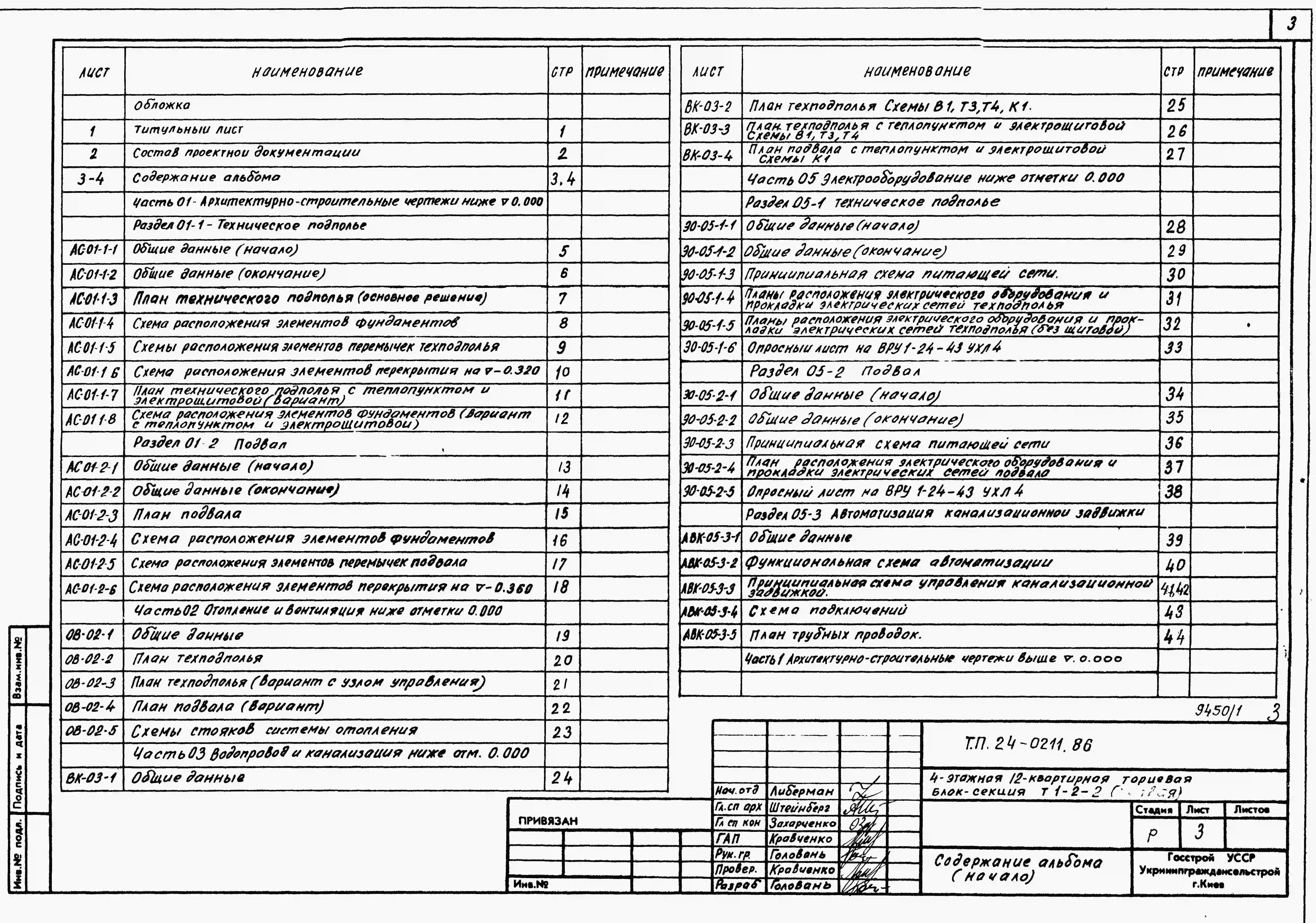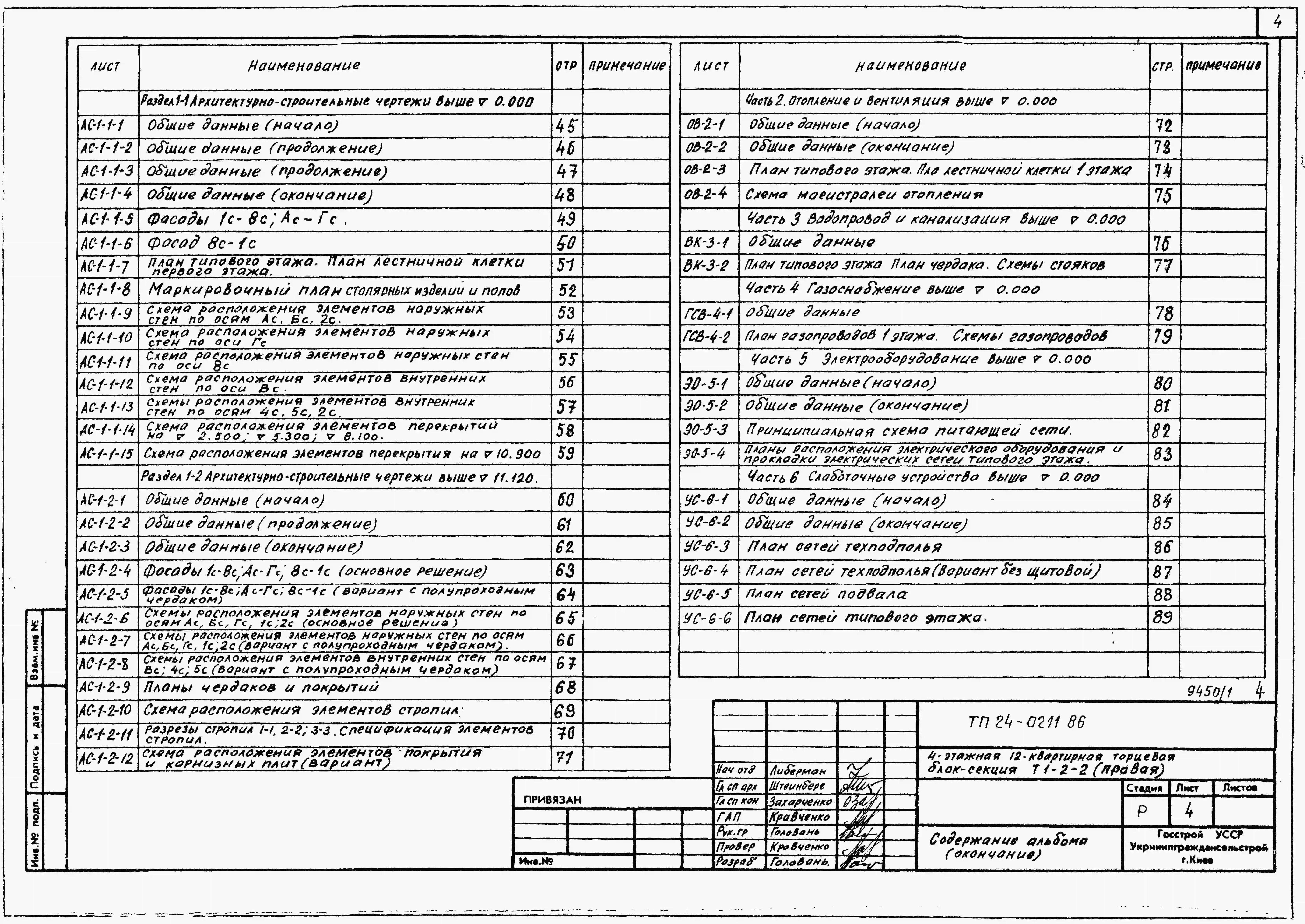 Типовой проект 24-0211.86 4-этажная 12-квартирная торцевая блок-секция Т 1-2-2 (правая). Паспорт проекта (формат PDF) Чертежи (формат TIF)