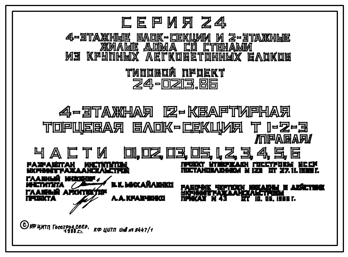 Типовой проект 24-0213.86 4-этажная 12-квартирная торцевая блок-секция Т 1-2-3 (правая). Паспорт проекта (формат PDF) Чертежи (формат TIF)