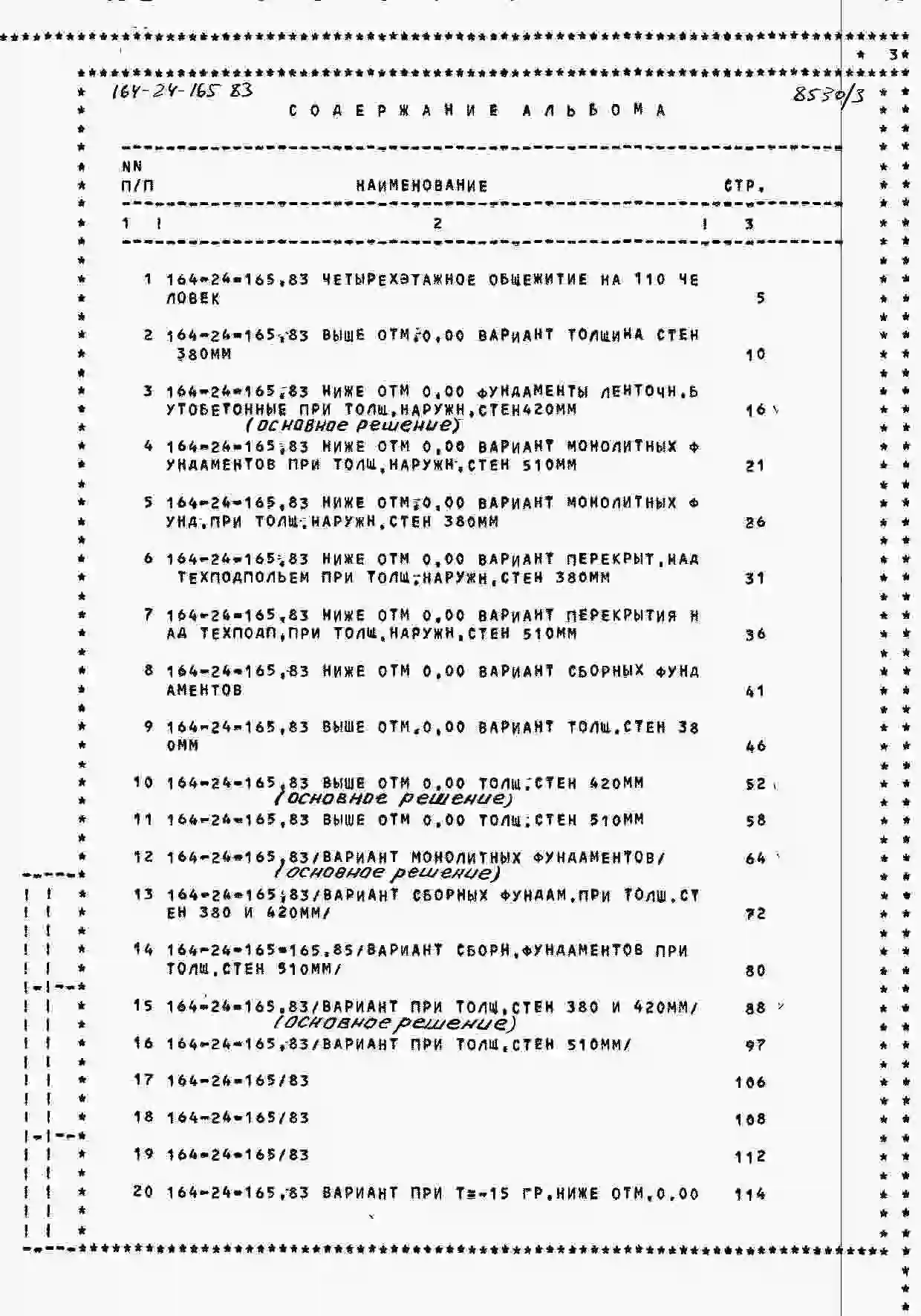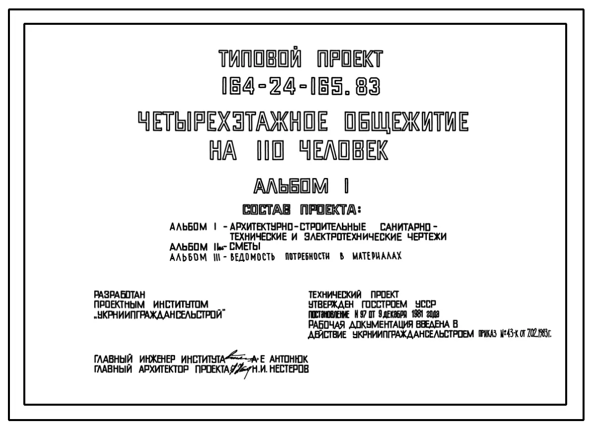 Типовой проект 164-24-165.83 Четырехэтажное общежитие на 110 человек для рабочих и служащих. Паспорт проекта (формат PDF) Чертежи (формат TIF)