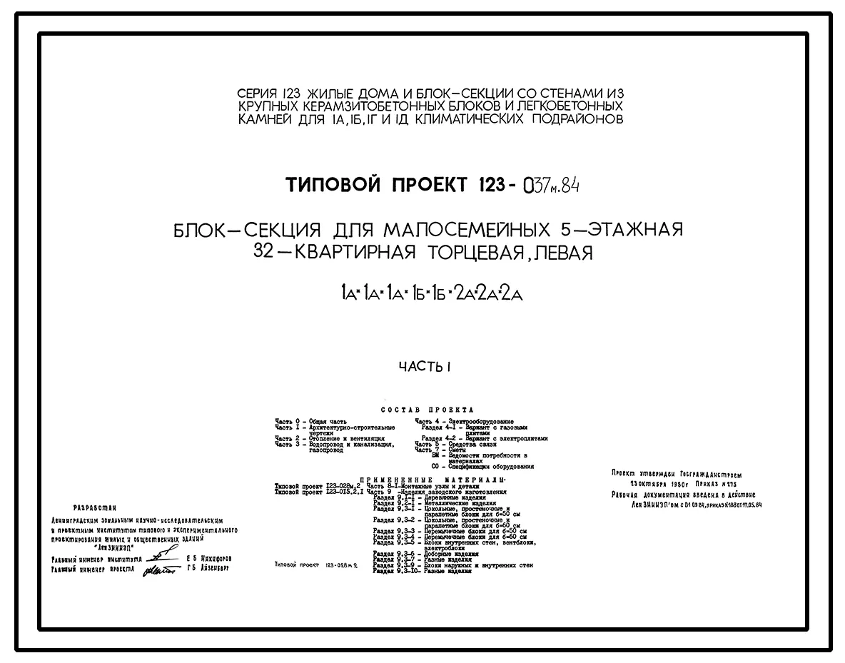 Типовой проект 123-037м.84 Блок-секция для малосемейных 5-этажная 32-квартирная торцевая (левая и правая) 1А.1А.1А.1Б.1Б.2А.2А.2А