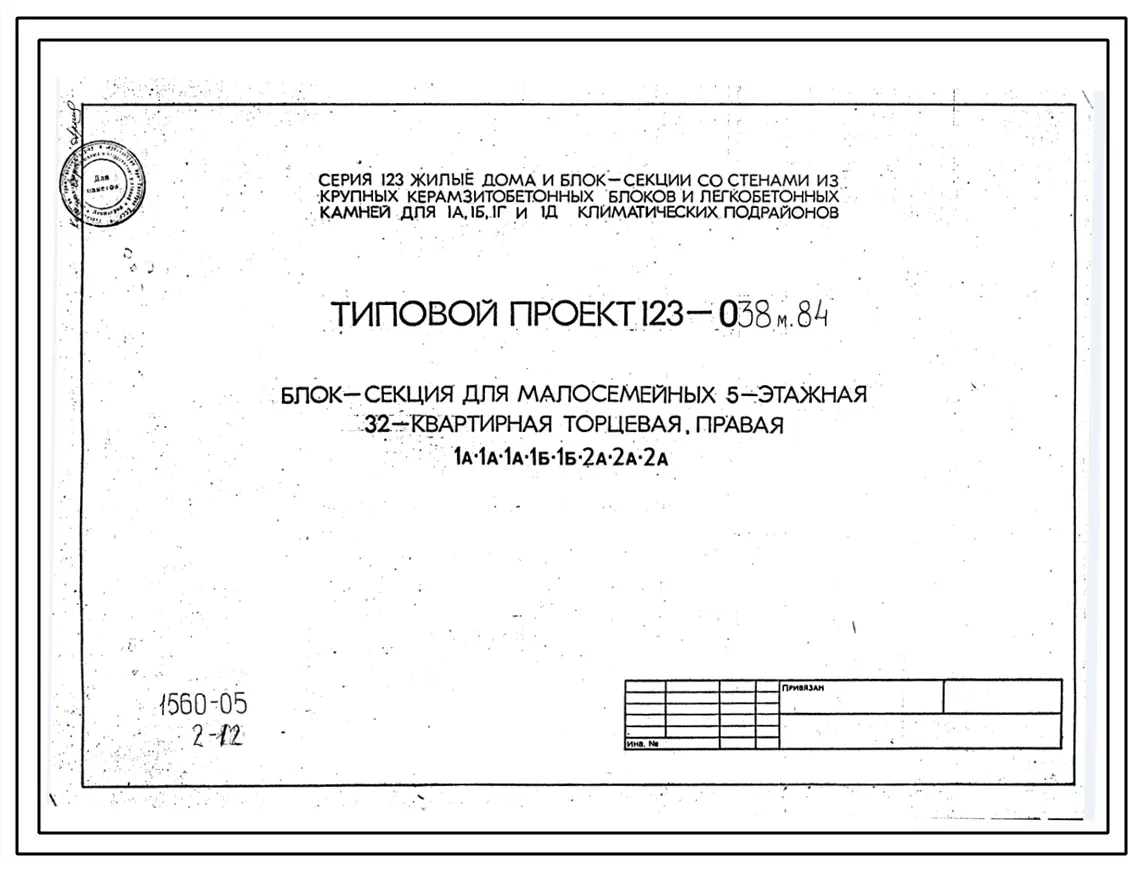 Типовой проект 123-038м.84 Блок-секция для малосемейных 5-этажная 32-квартирная торцевая (левая и правая) 1А.1А.1А.1Б.1Б.2А.2А.2А