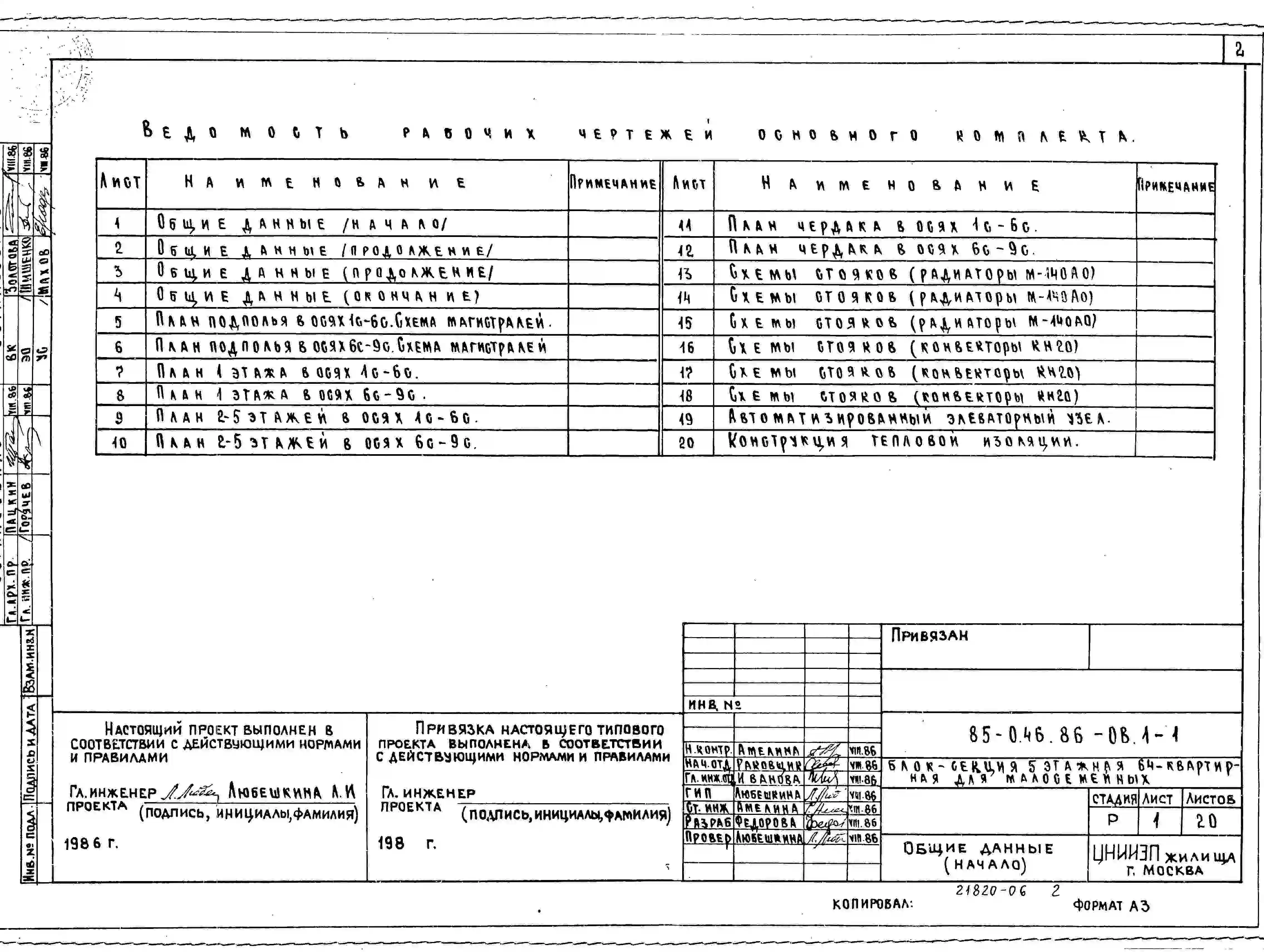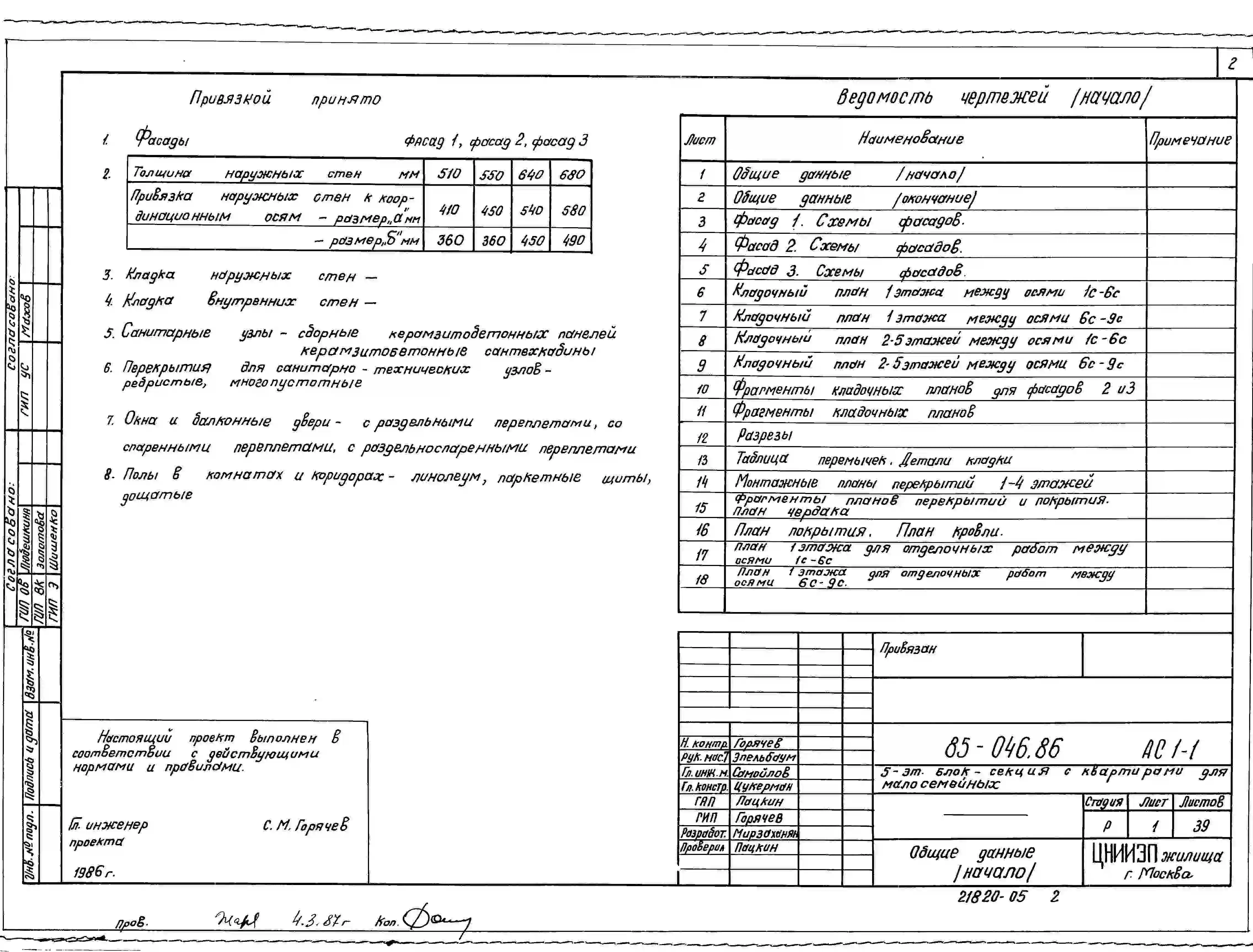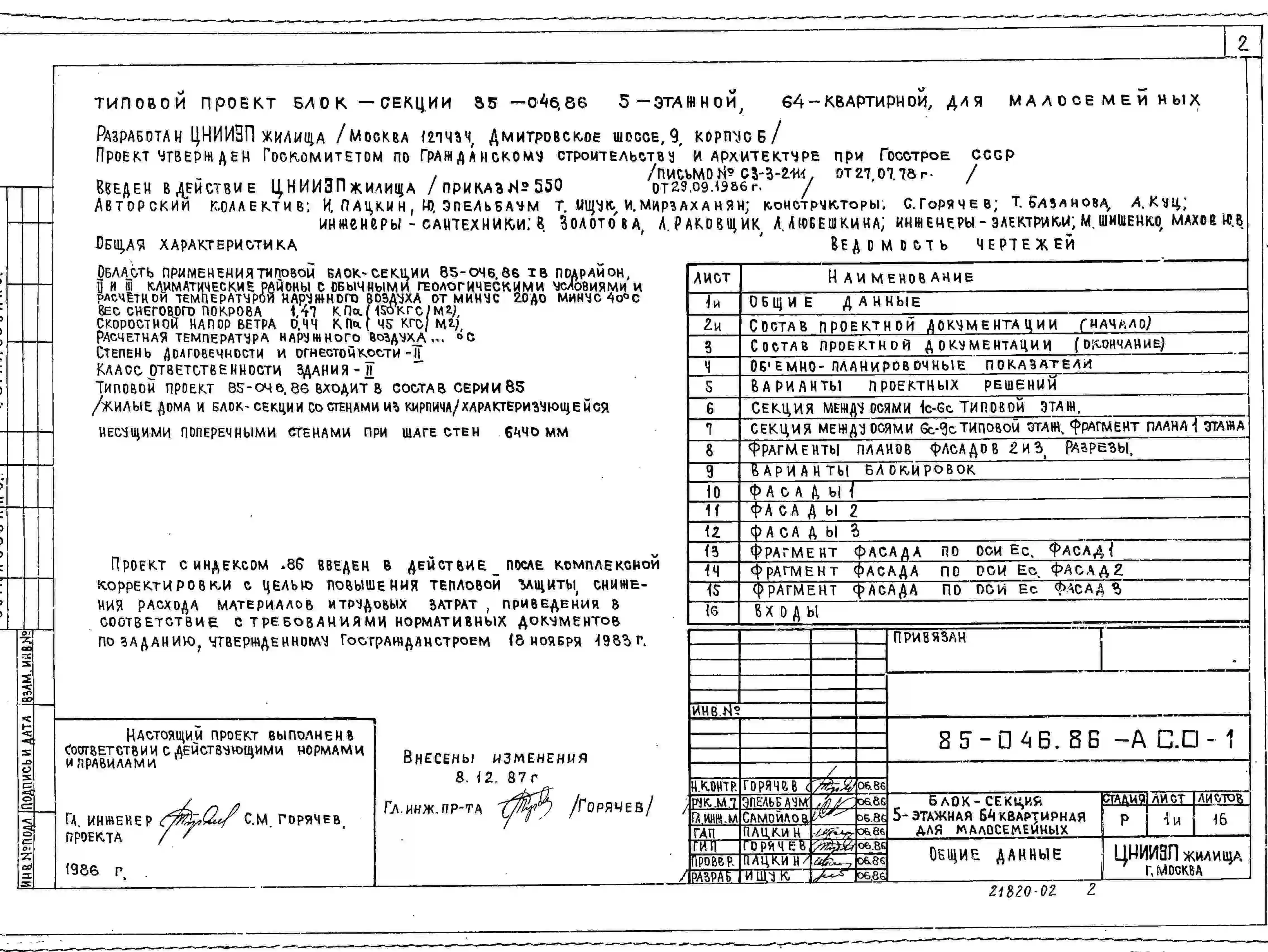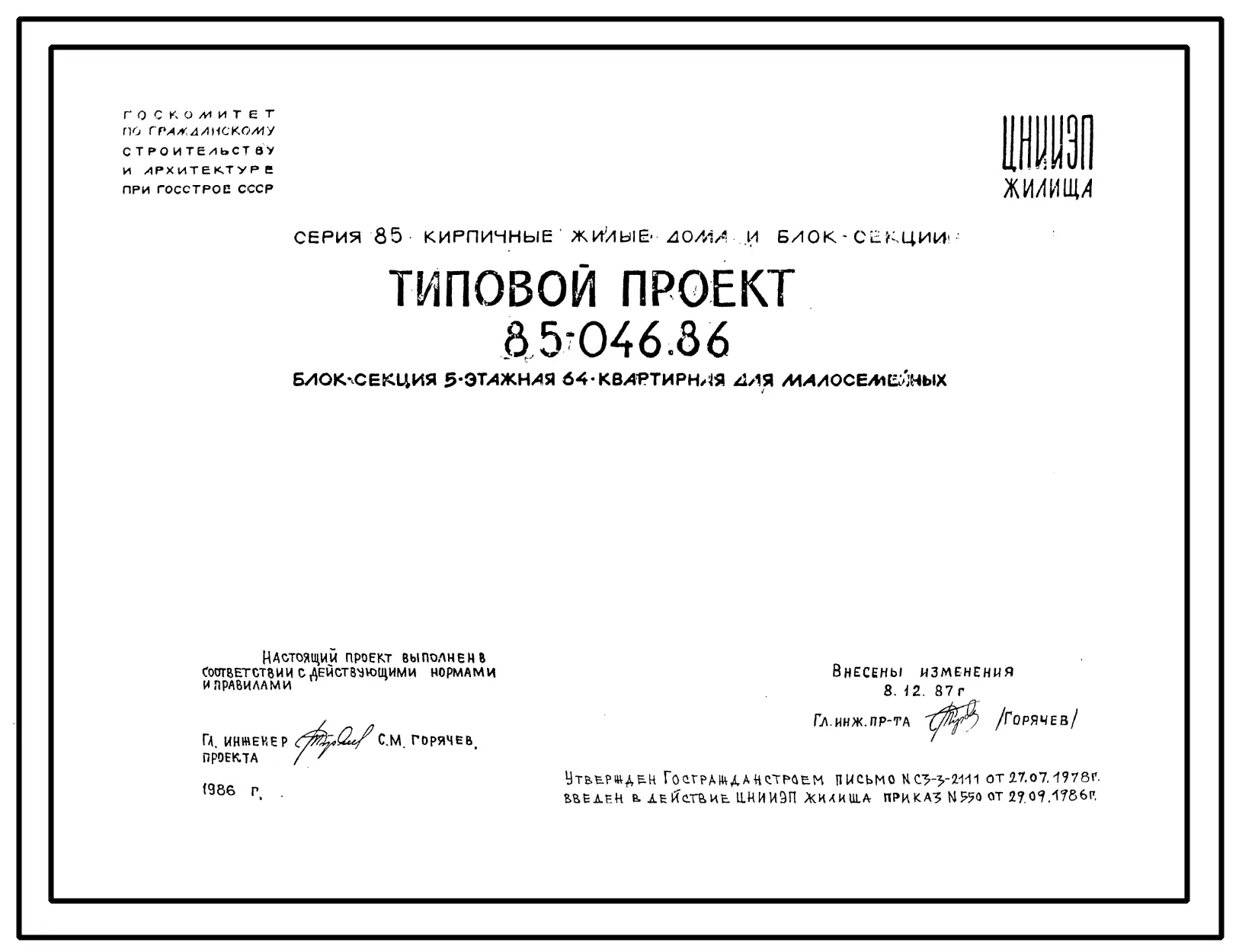 Типовой проект 85-046.86 Блок секция 5-этажная 64-квартирная для малосемейных. Паспорт проекта (формат PDF) Чертежи (формат TIF)