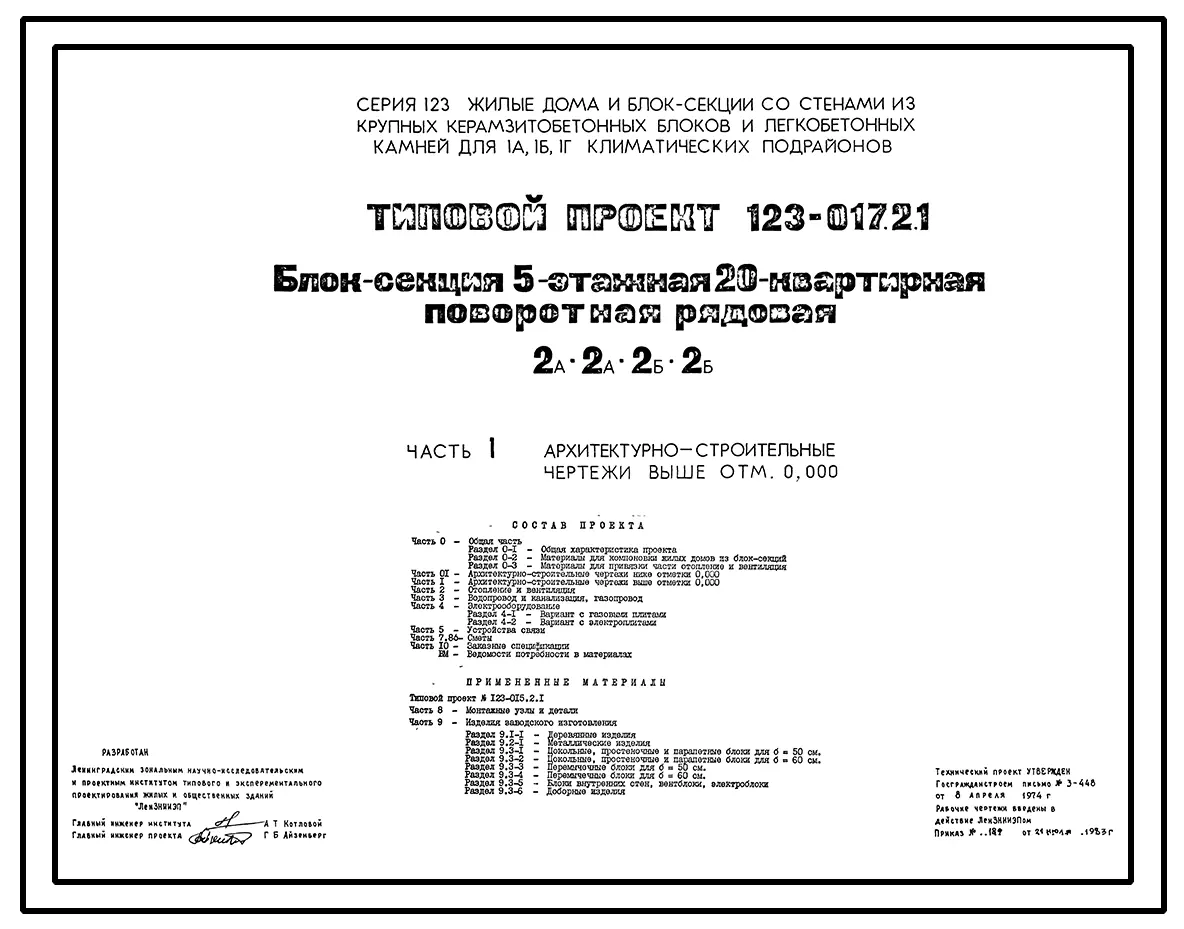 Типовой проект 123-017.2.1 Блок-секция 5-этажная 20-квартирная поворотная рядовая 2А.2А.2Б.2Б