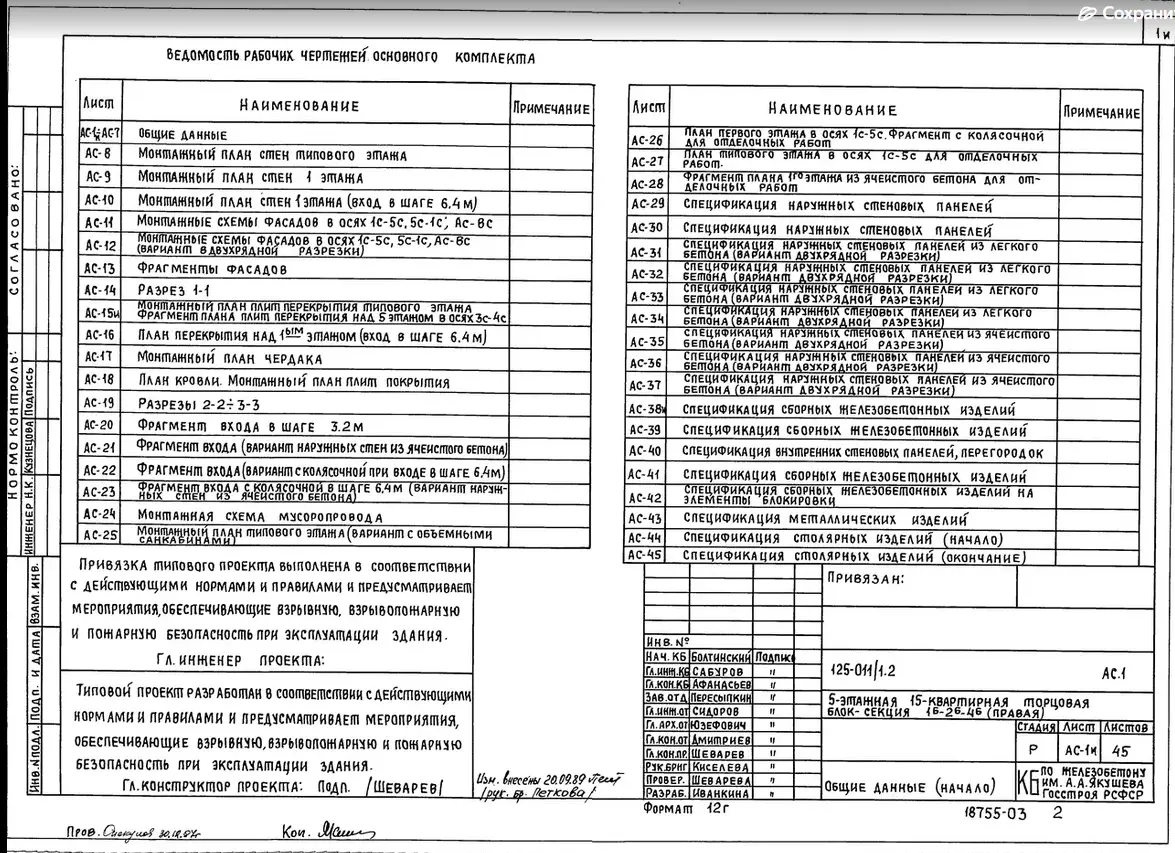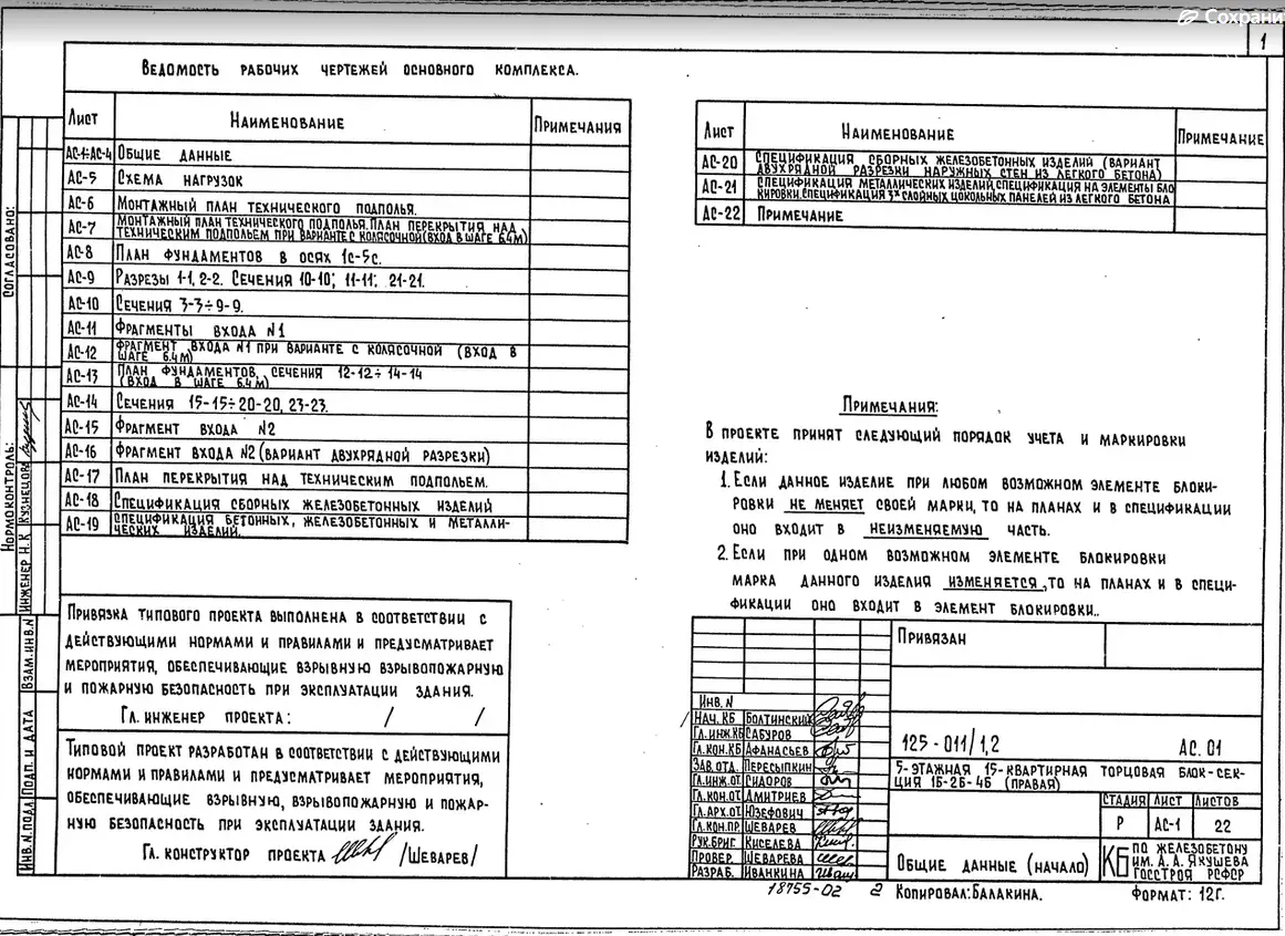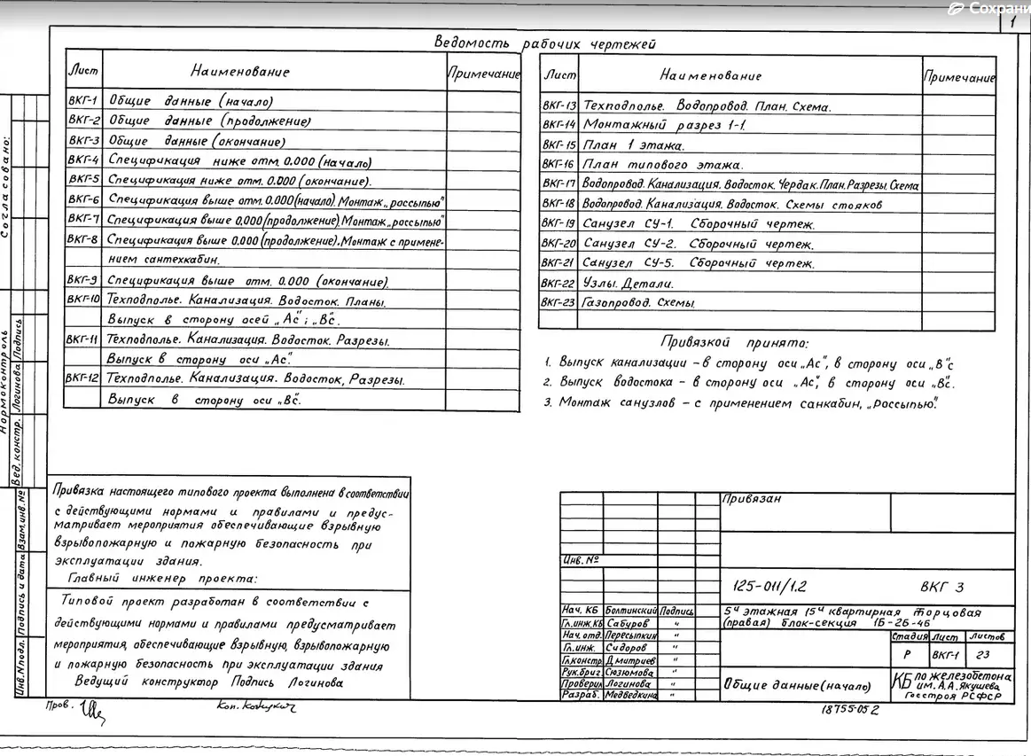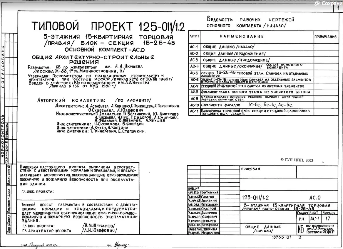 Типовой проект 125-011/1.2 5-ти этажная 15-ти квартирная торцовая (правая) блок-секция 1-Б 2-Б 4-Б. Чертежи (формат TIF)