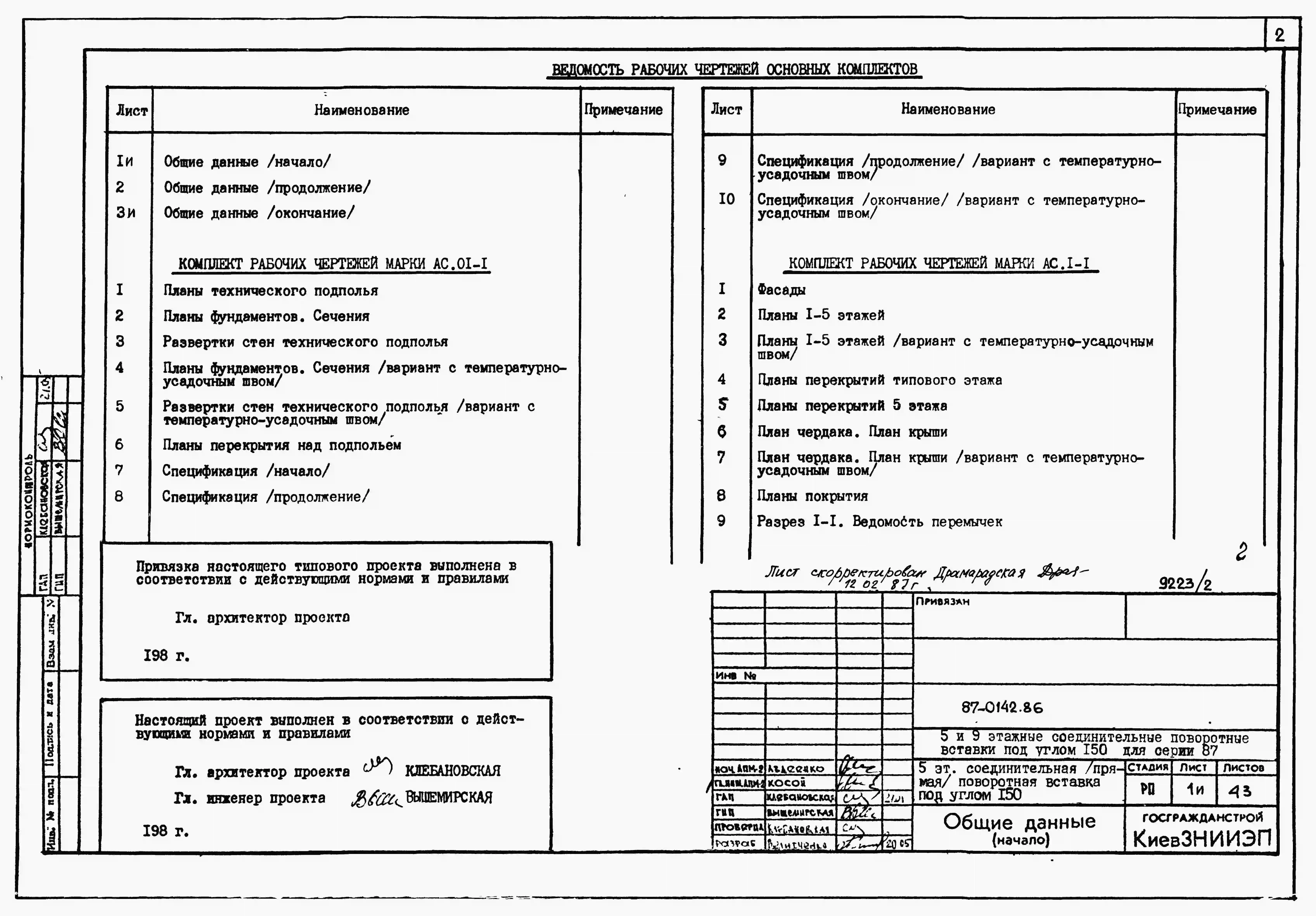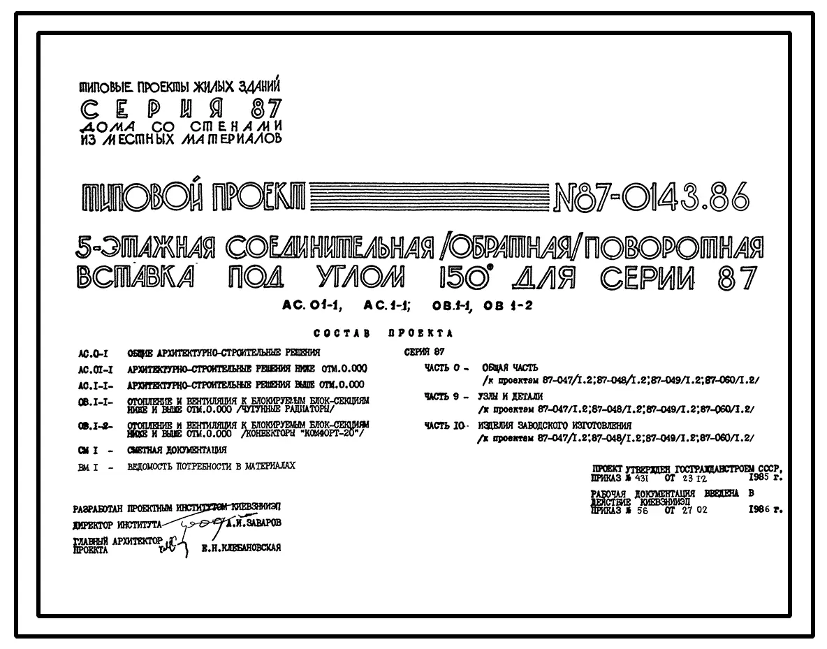 Типовой проект 87-0142.86 5-этажная соединительная /прямая/ поворотная вставка под углом 150о