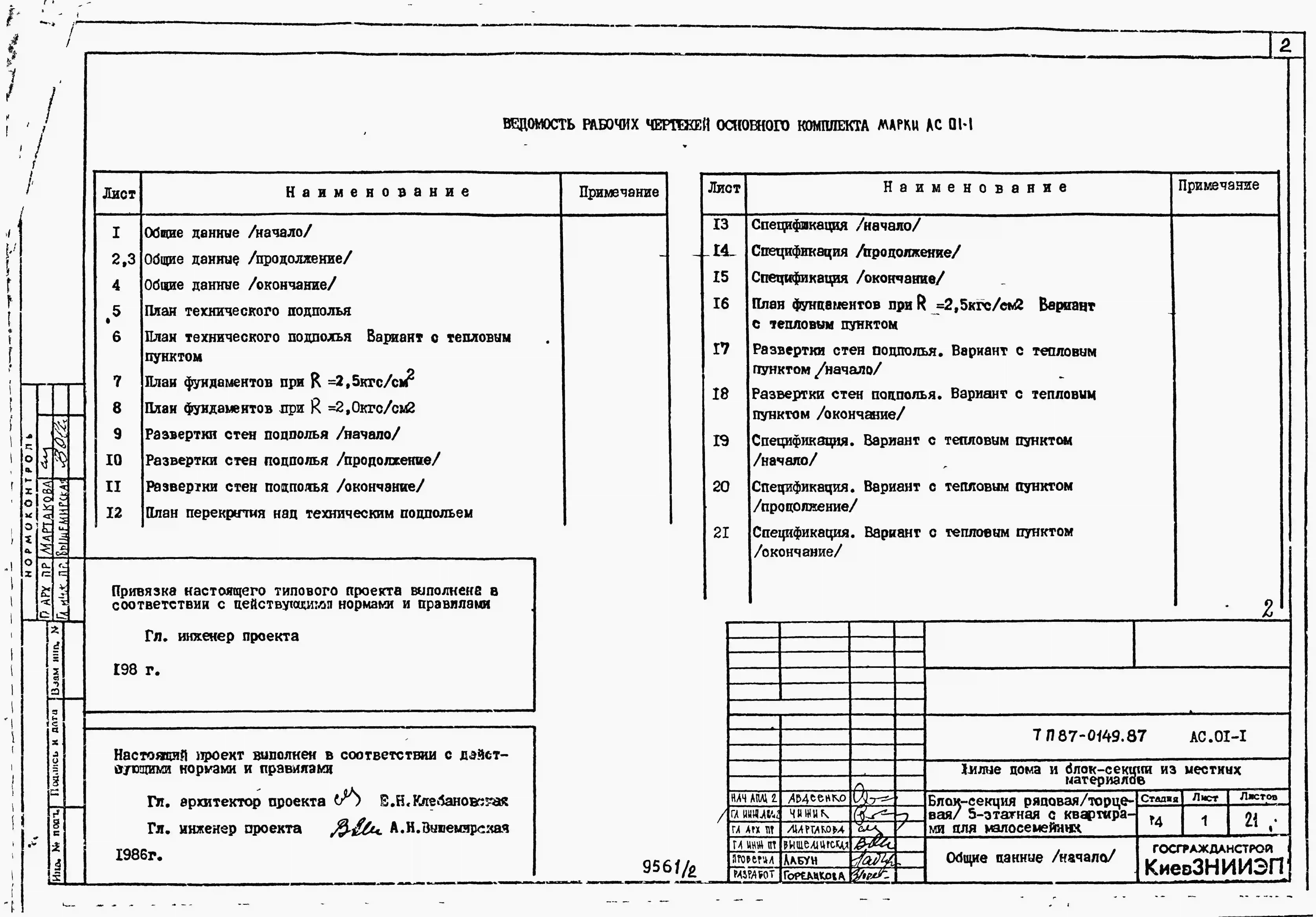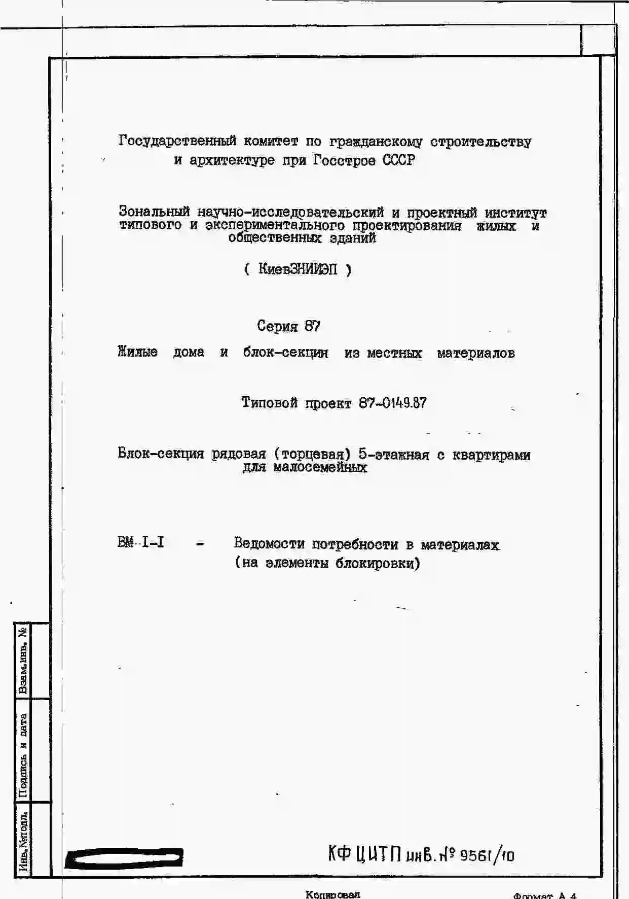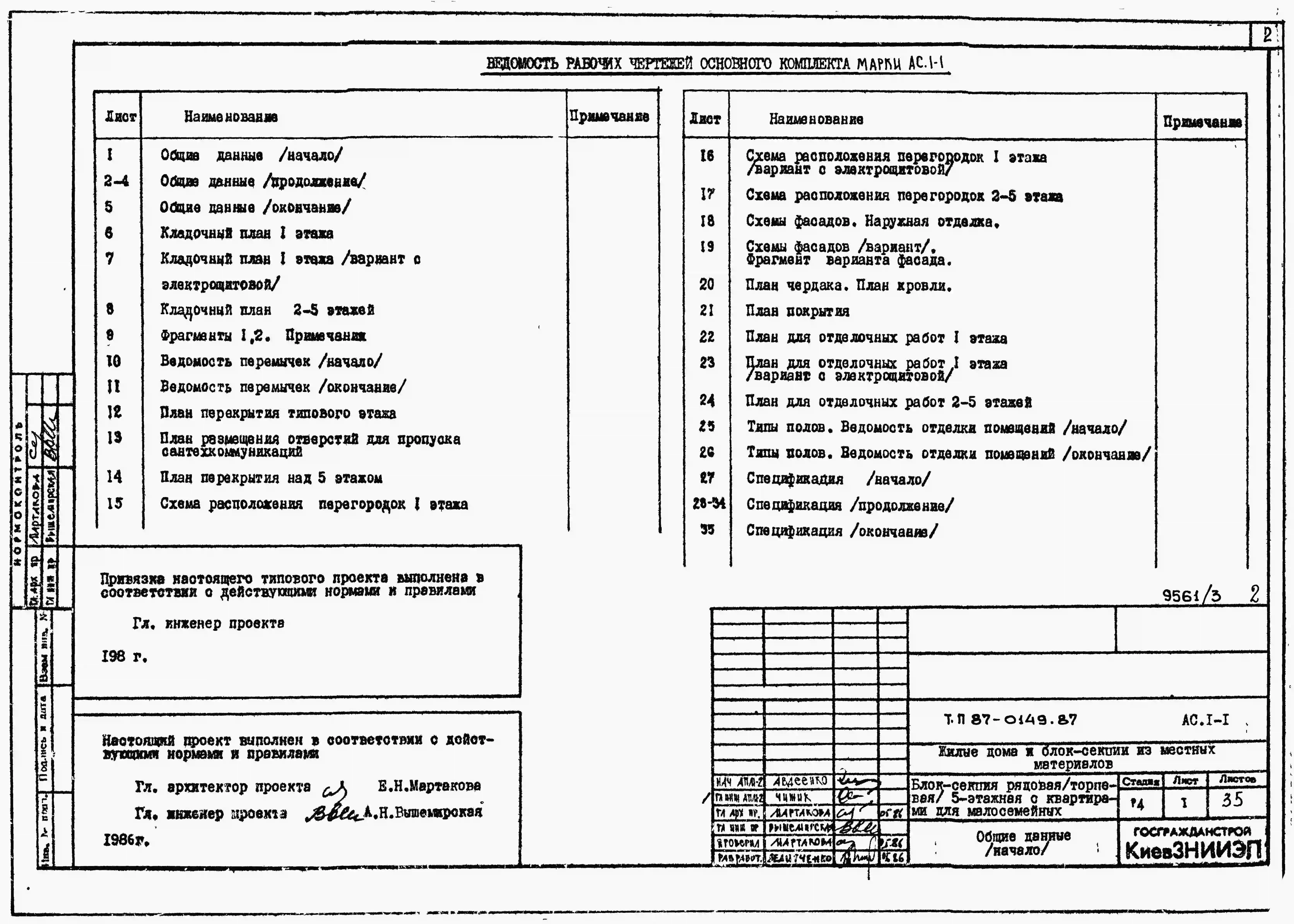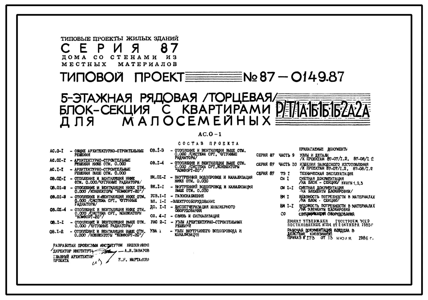 Типовой проект 87-0149.87 5-этажная рядовая /торцовая/ блок-секция на 30 квартир для малосемейных Р/Т/ 1А-1Б-1Б-1Б-2А-2А