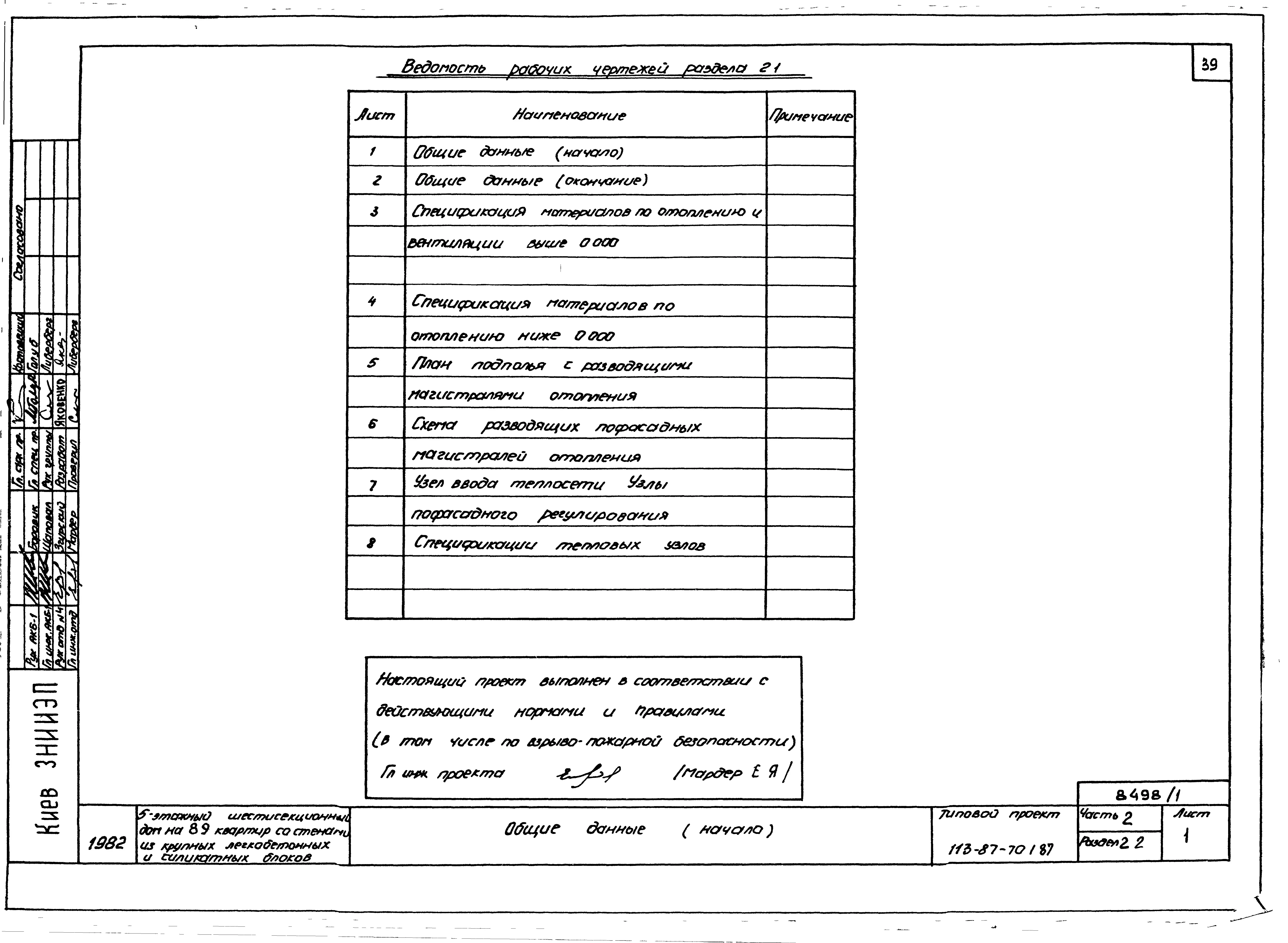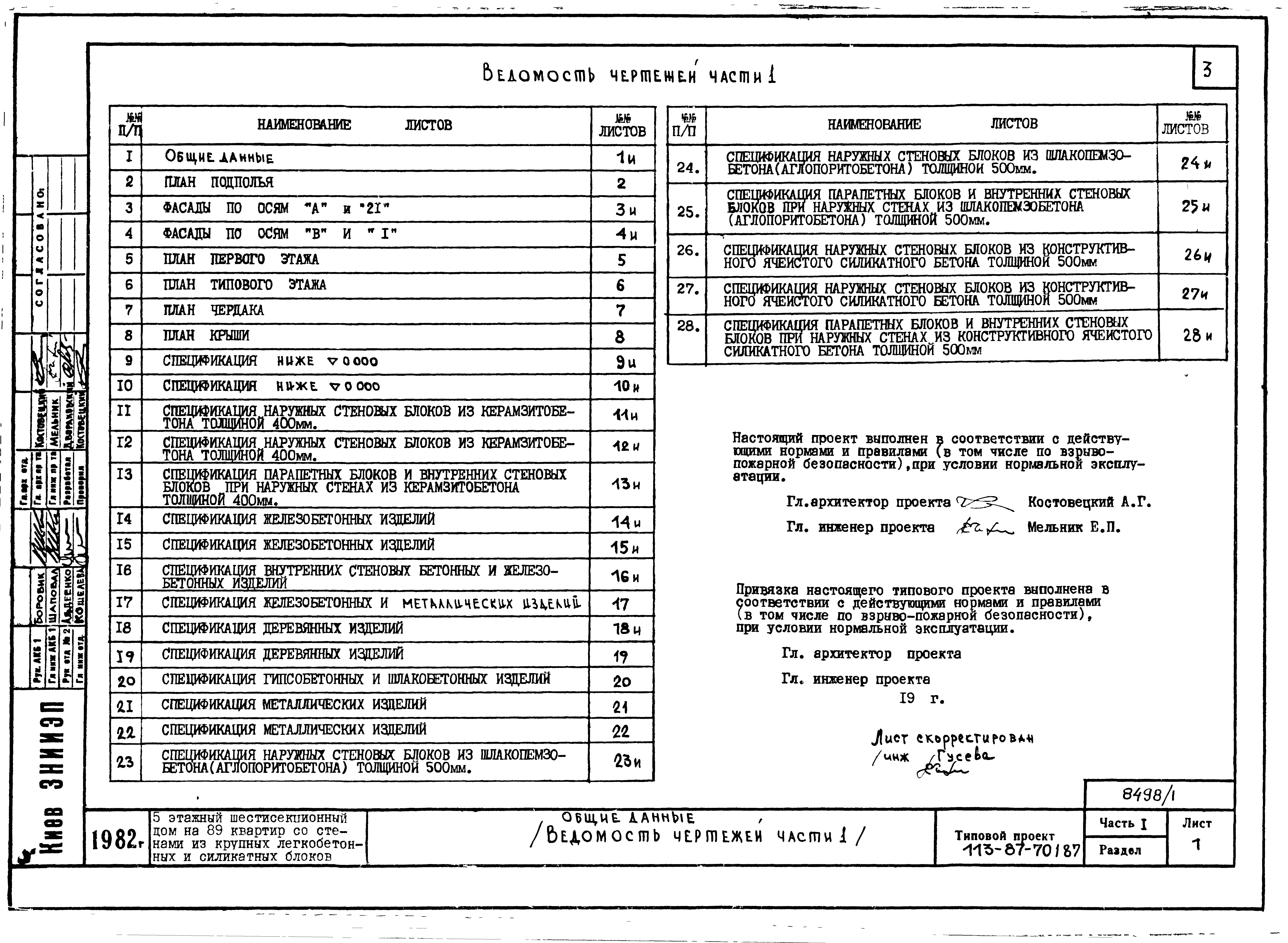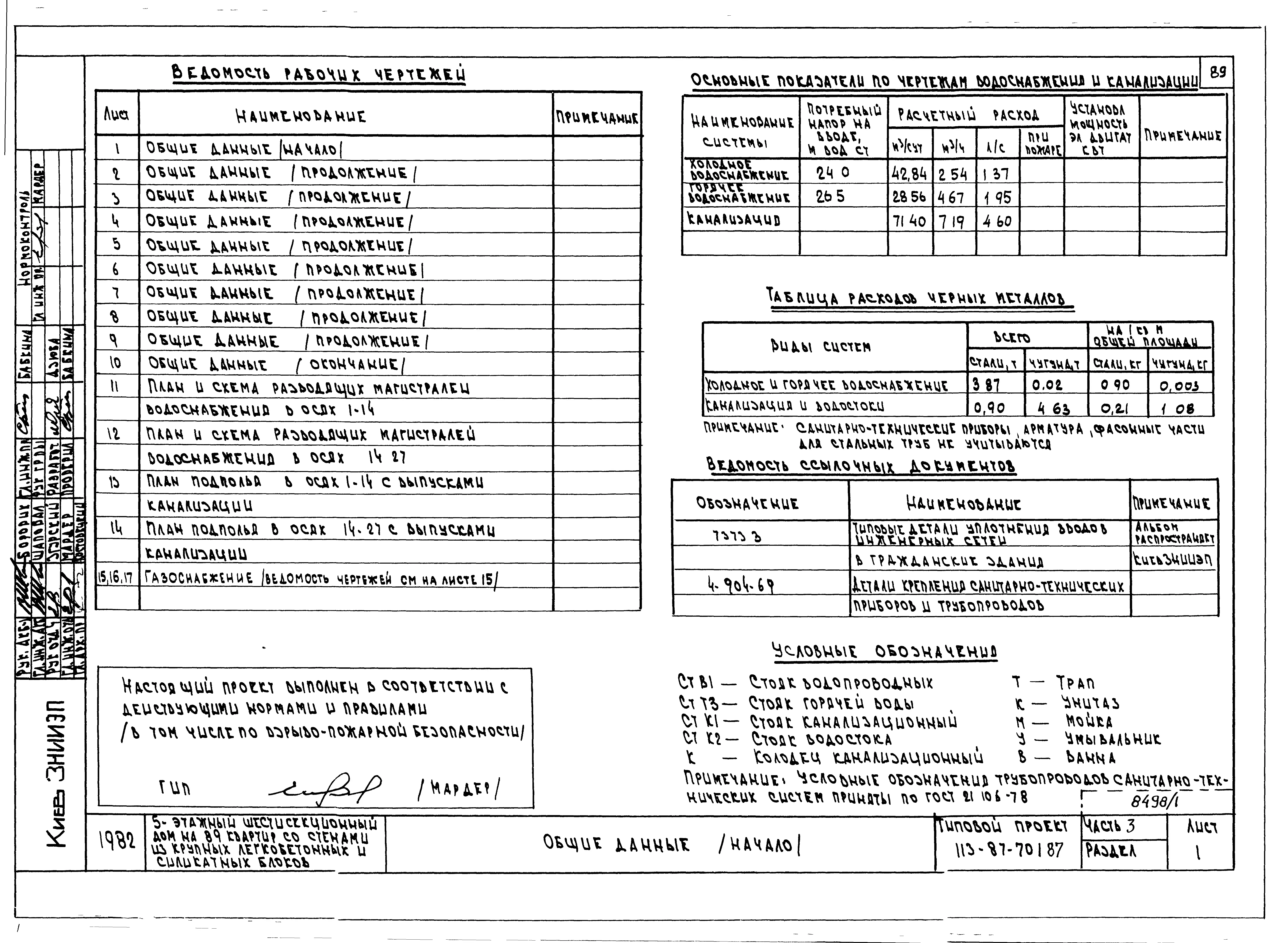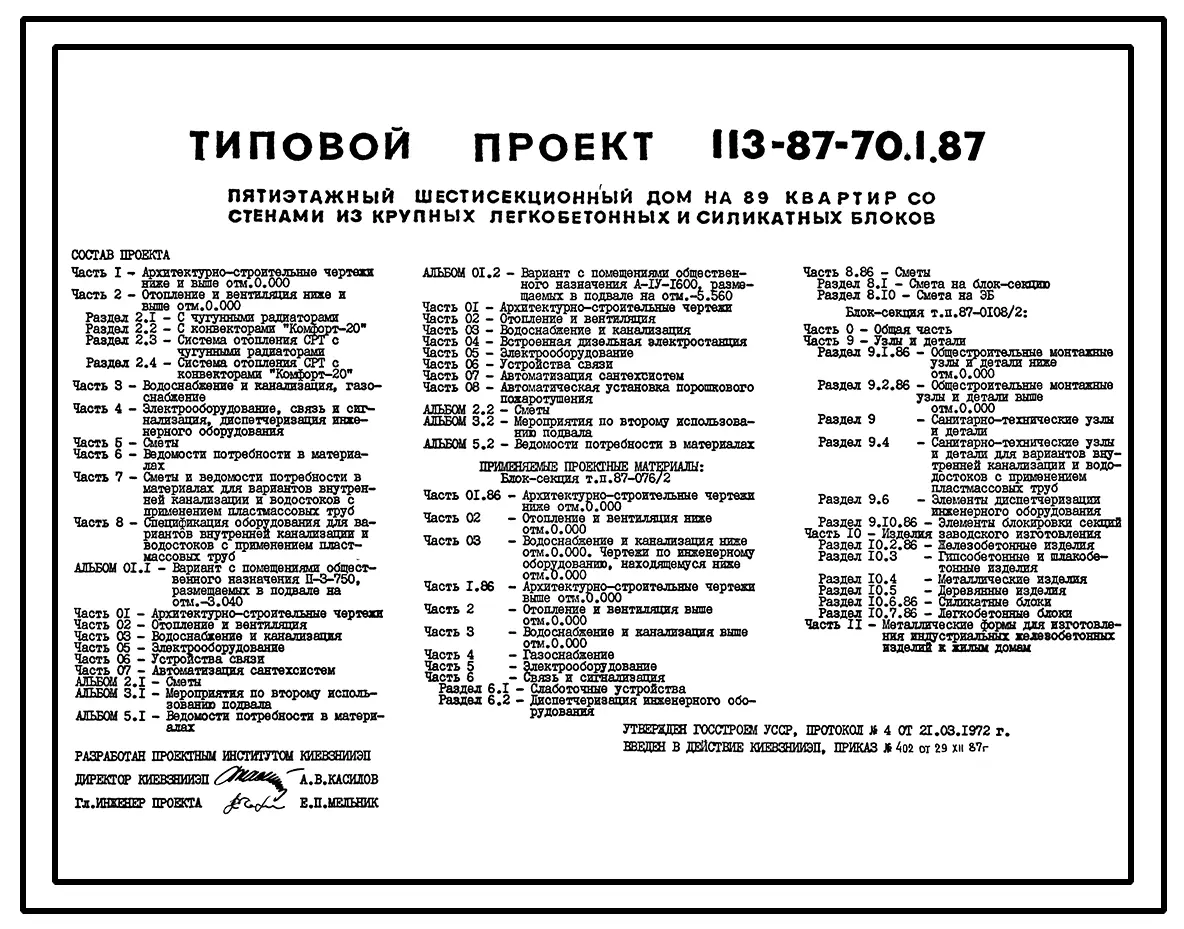 Типовой проект 113-87-70.1.87 Пятиэтажный шестисекционный жилой дом на 89 квартир /вариант проекта с подвалом на отм. -3,040, т.п. 113-87-70.2.87
