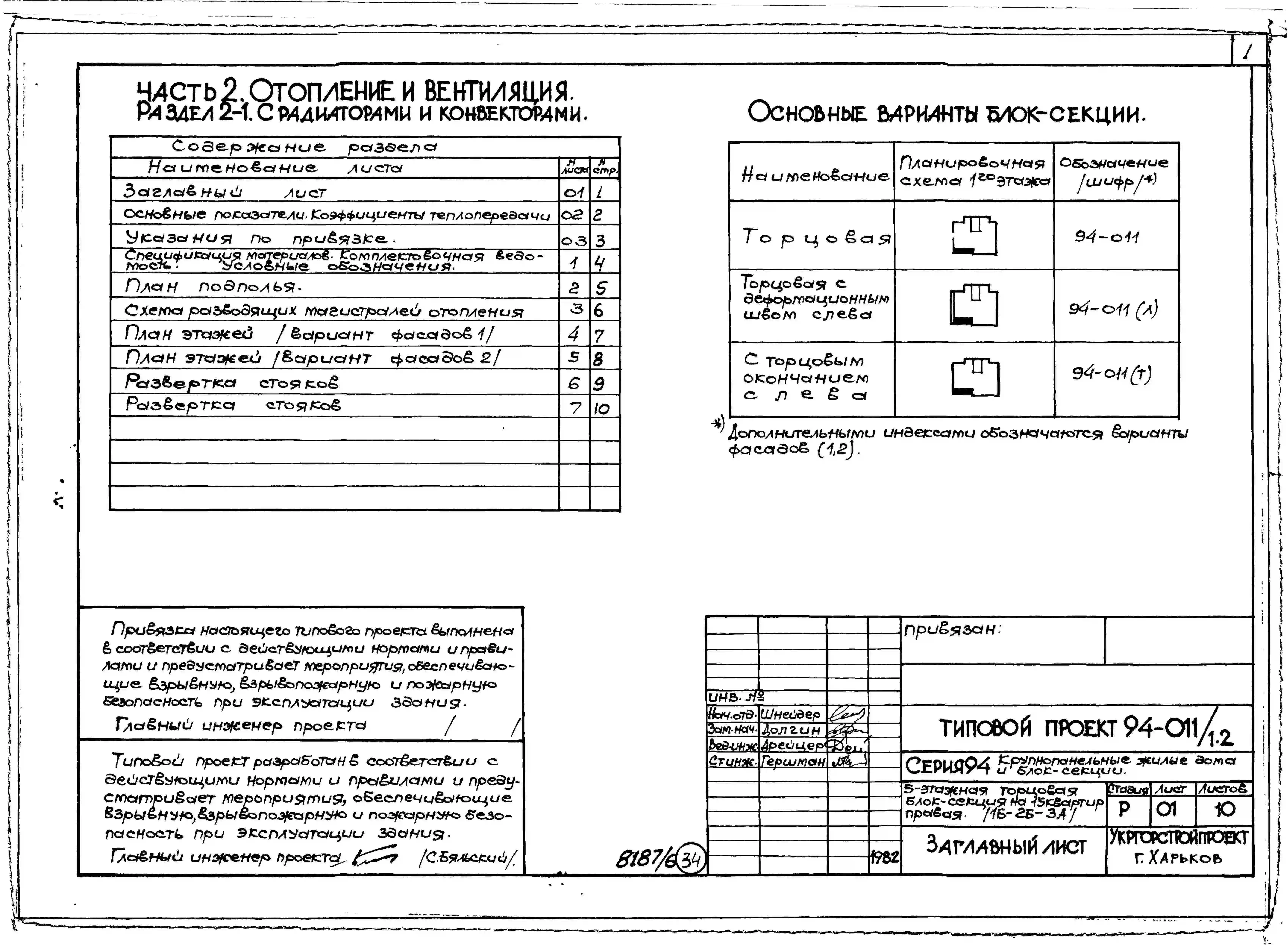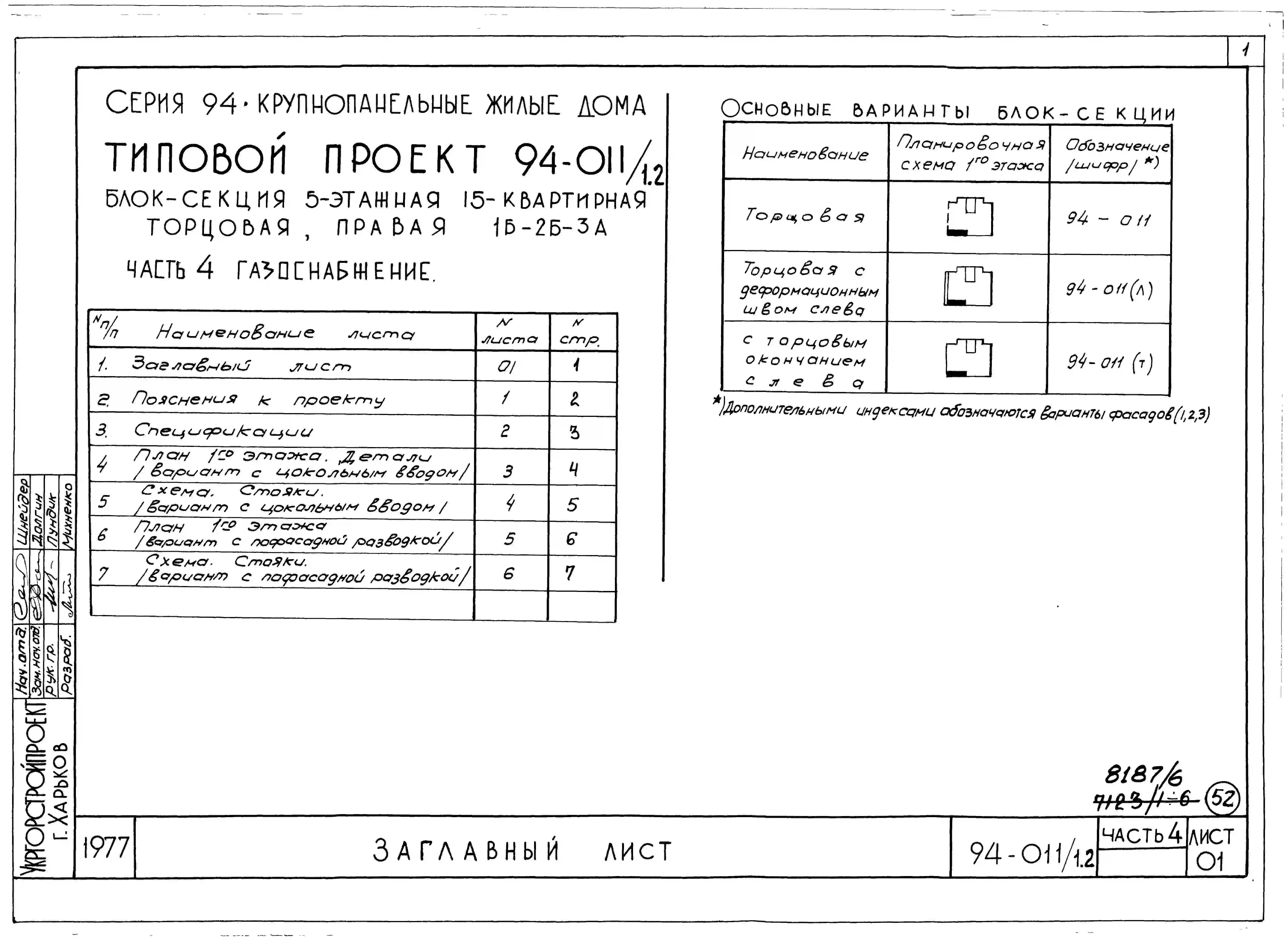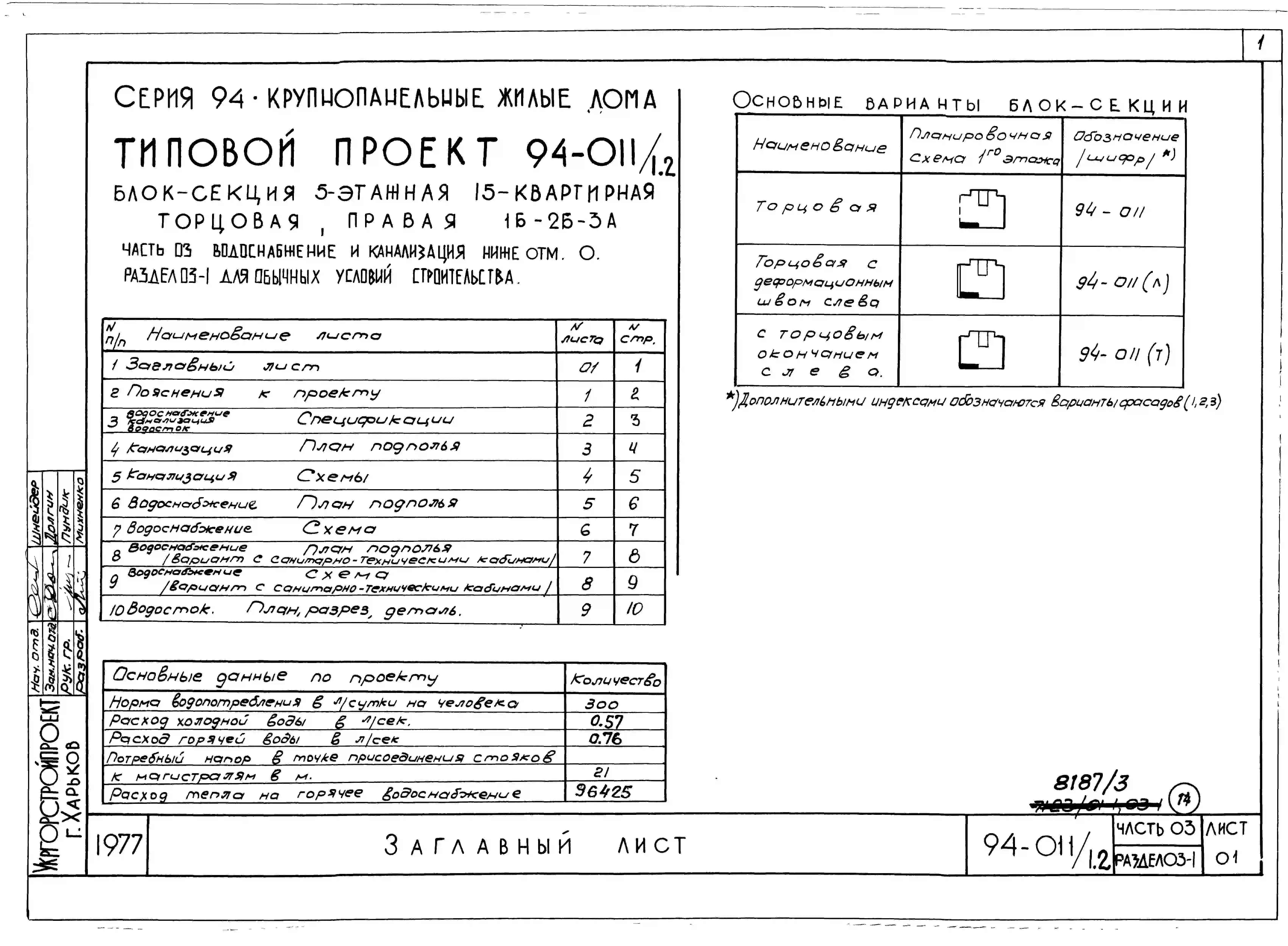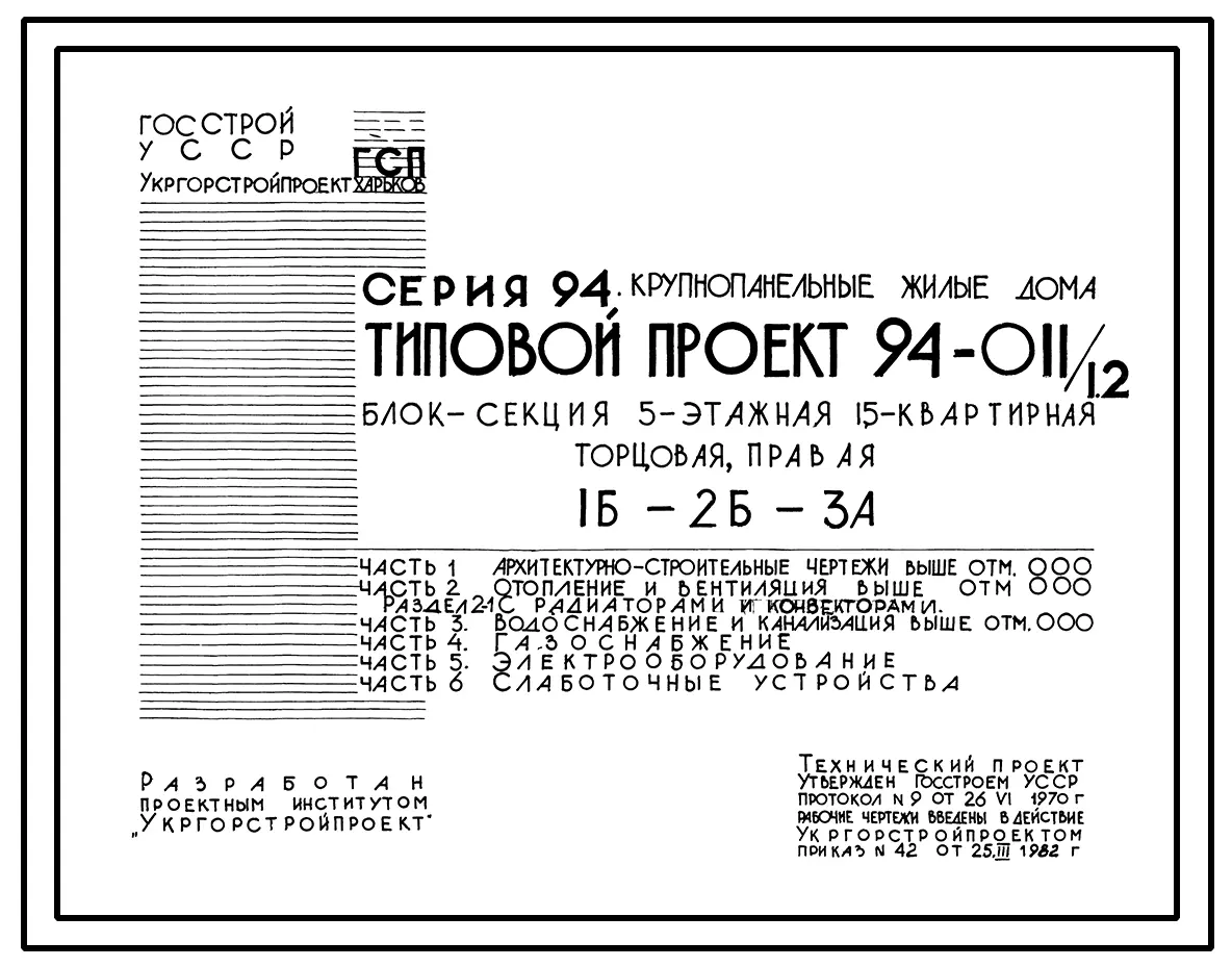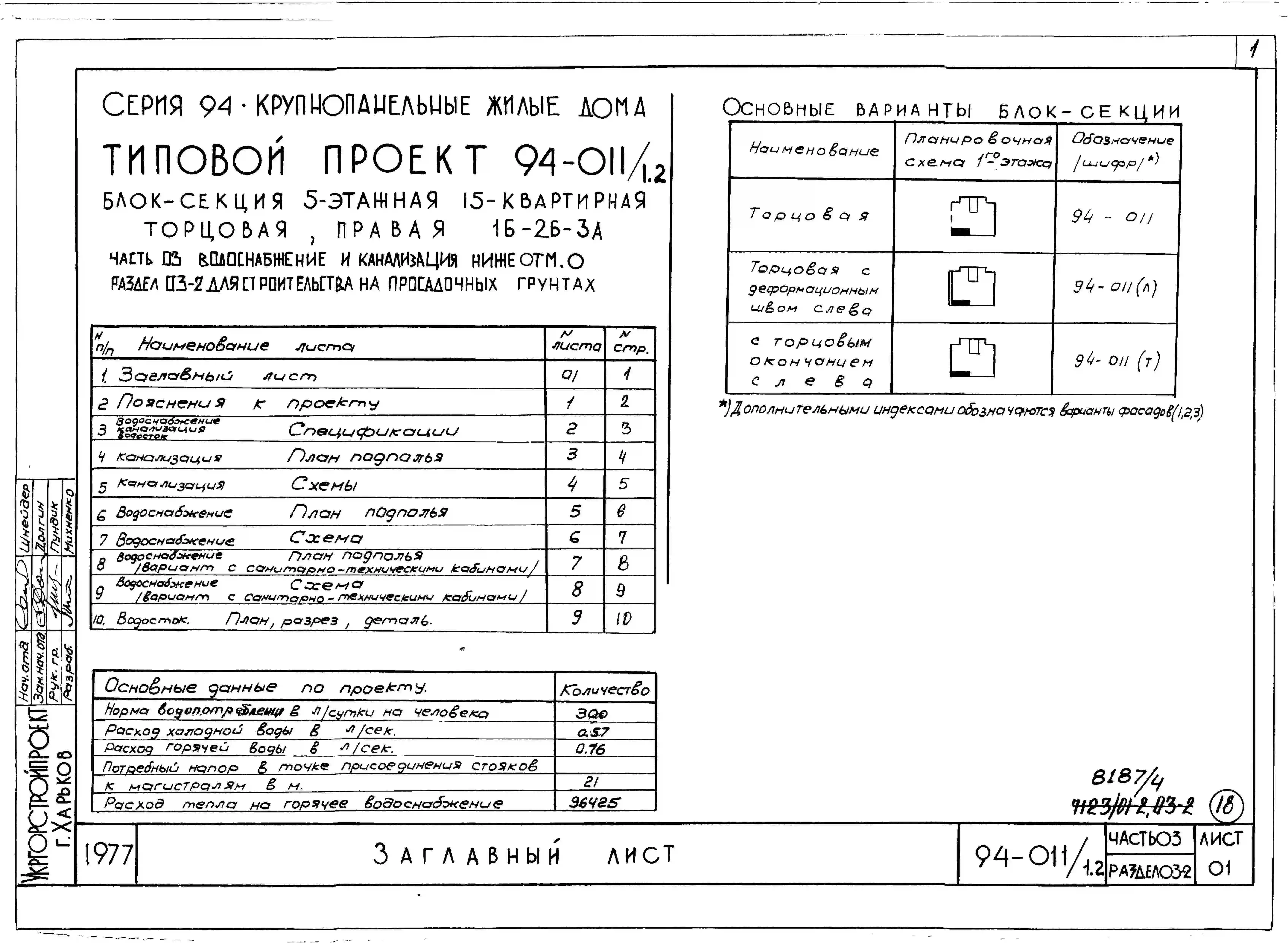Типовой проект 94-011/1.2 Блок-секция 5-этажная 15-квартирная торцовая правая 1Б-2Б-3А. Паспорт проекта (формат PDF) Чертежи (формат TIF)