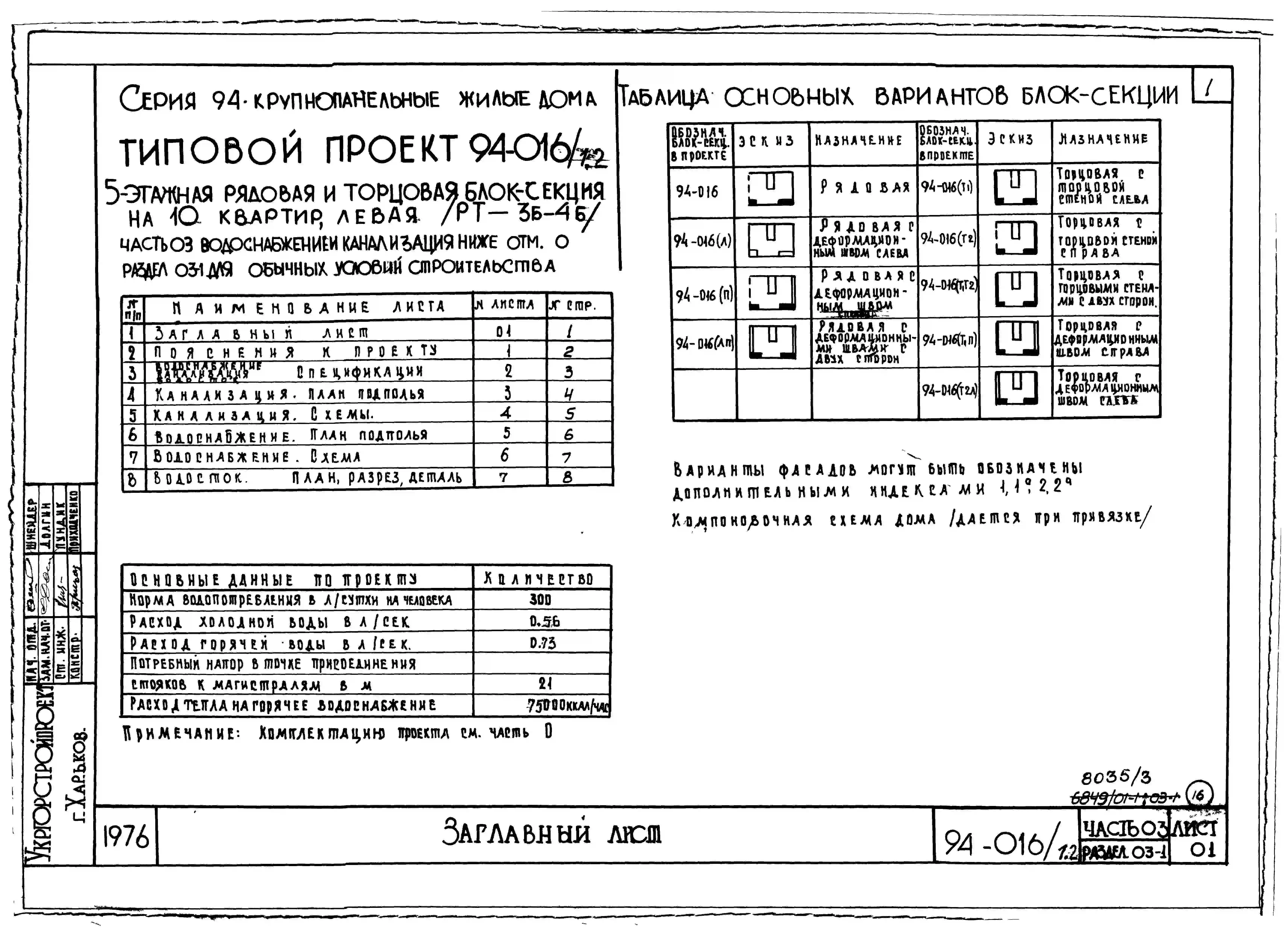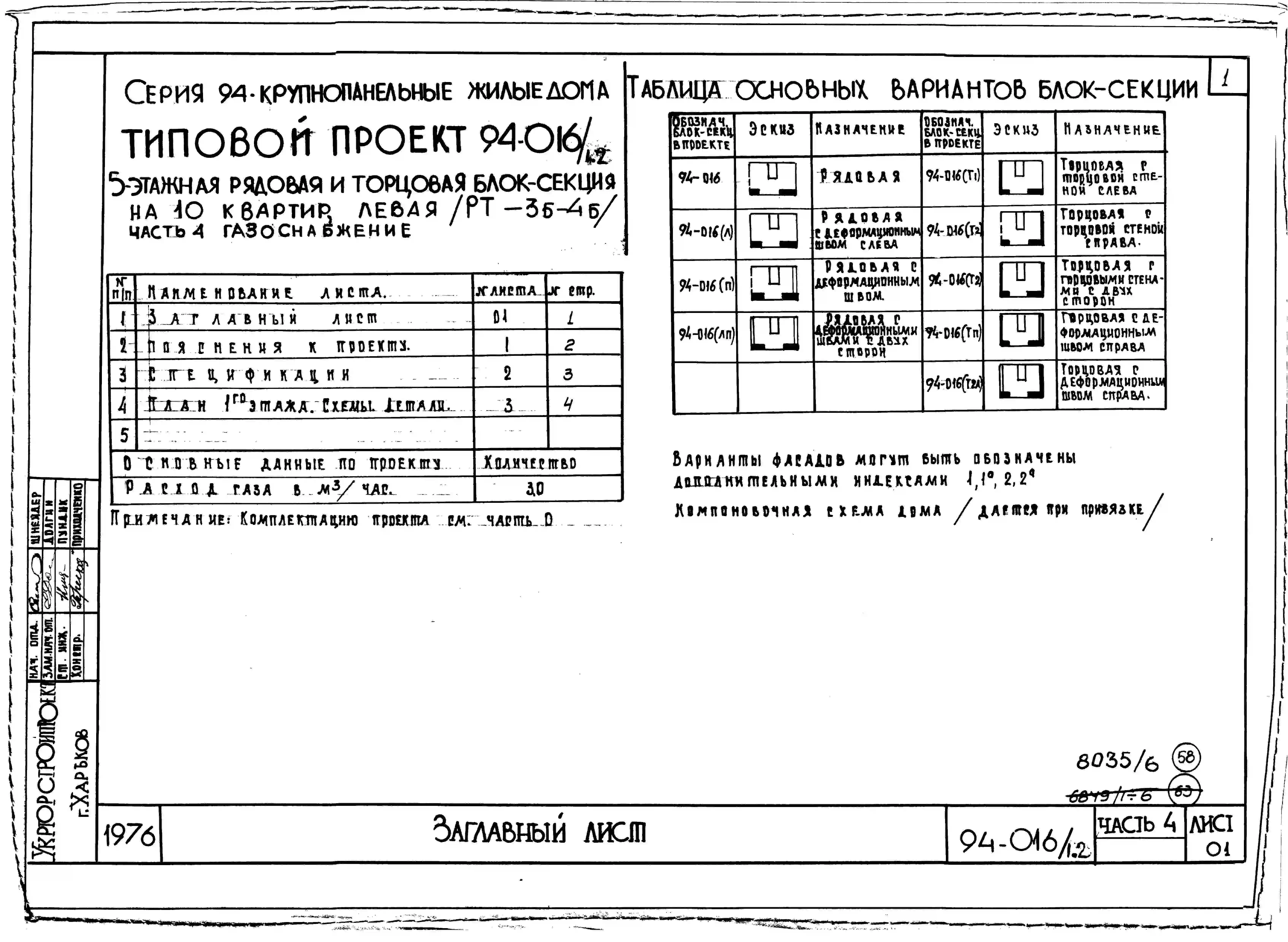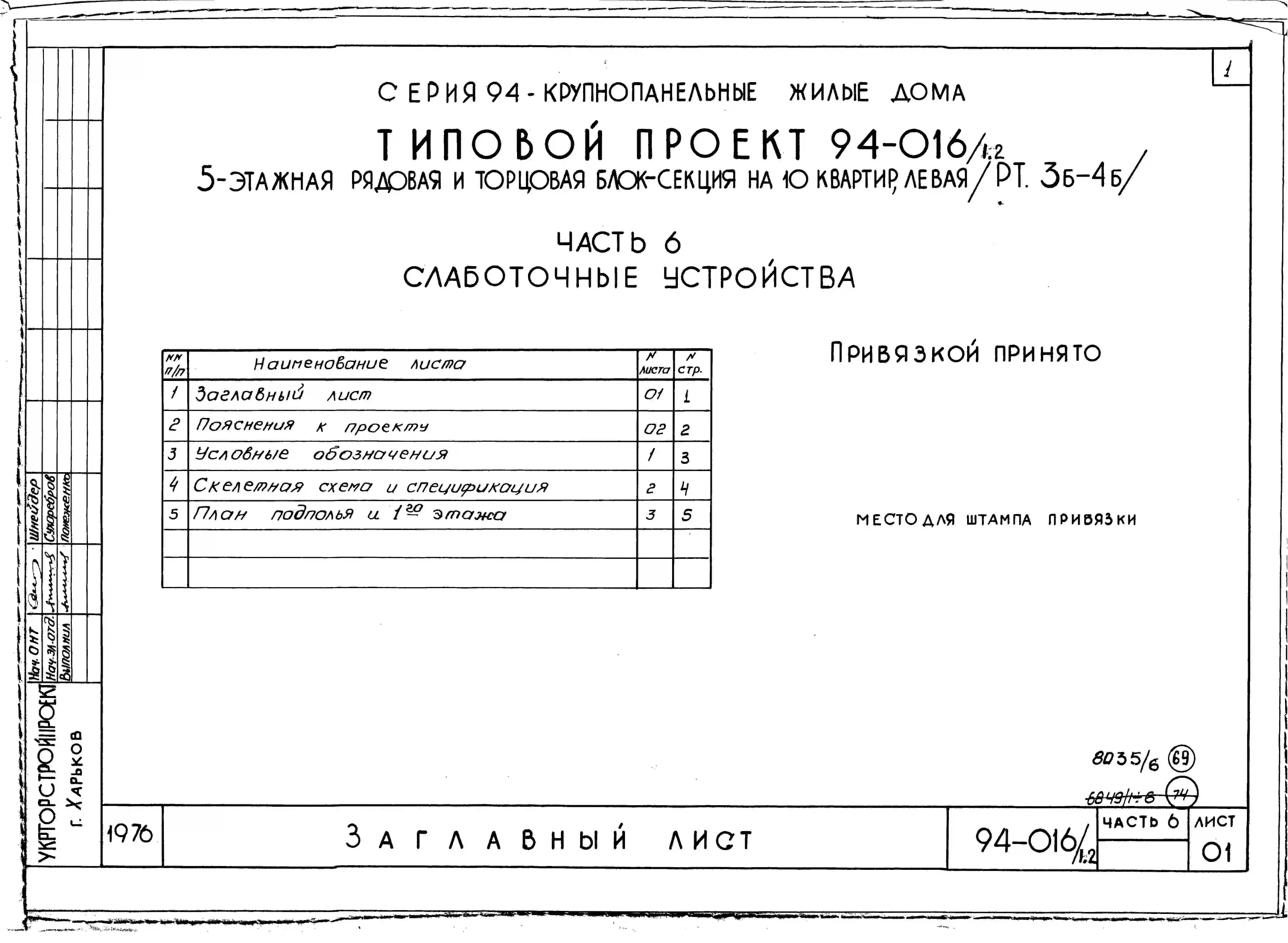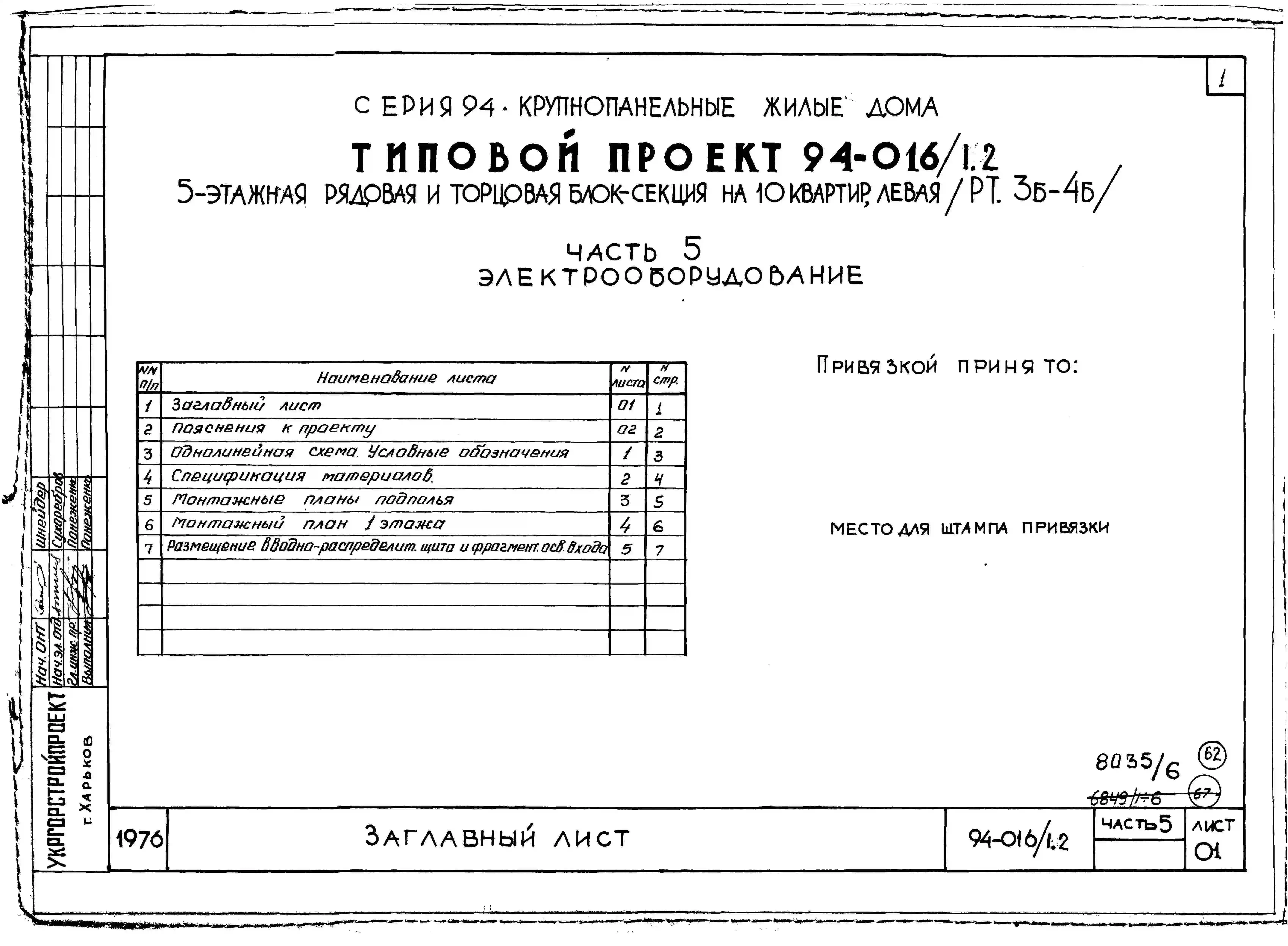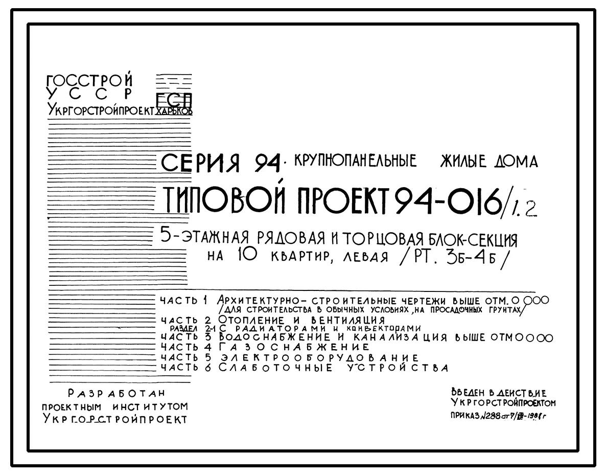 Типовой проект 94-016/1.2 5-этажная рядовая и торцовая блок-секция на 10 квартир левая 3Б-4Б. Паспорт проекта (формат PDF) Чертежи (формат TIF)