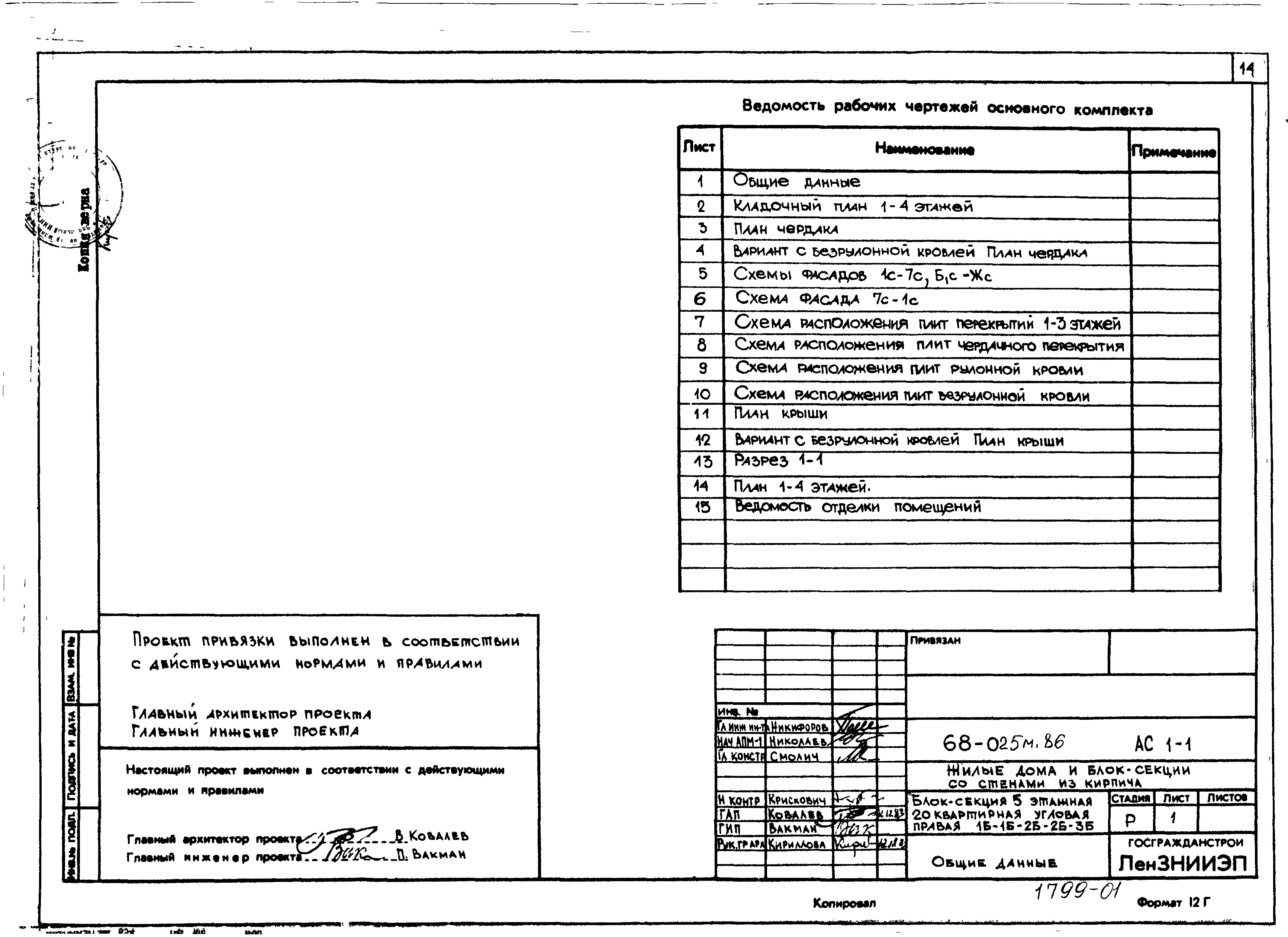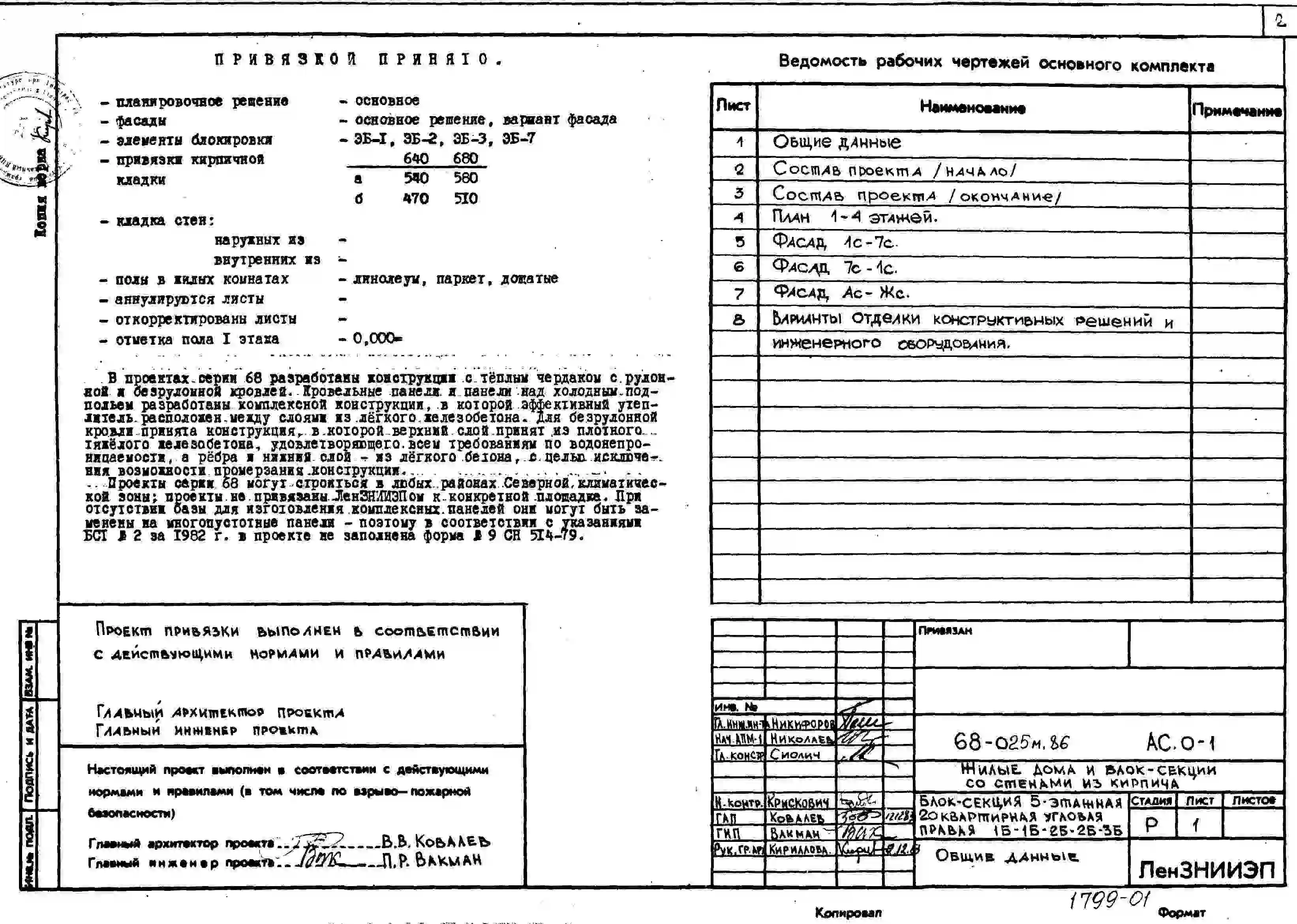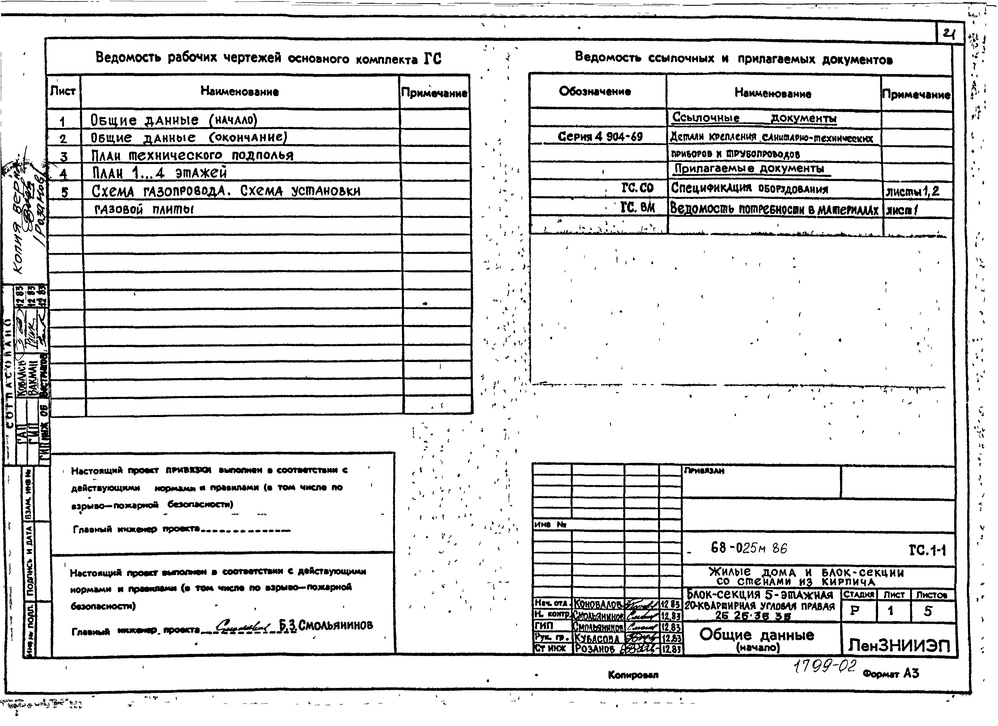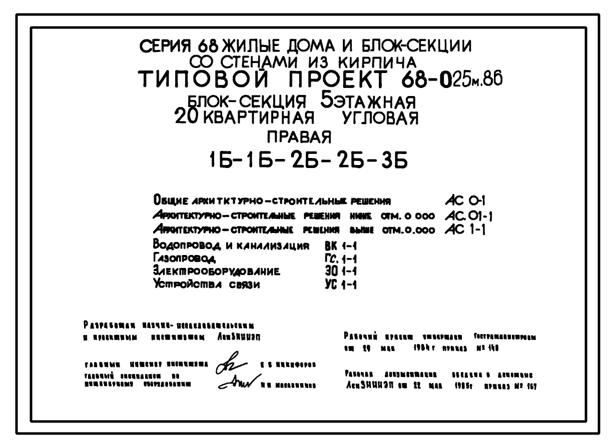 Типовой проект 68-025м.86 Блок-секция 5-этажная 20-квартирная угловая правая 1Б-1Б-2Б-2Б-3Б
