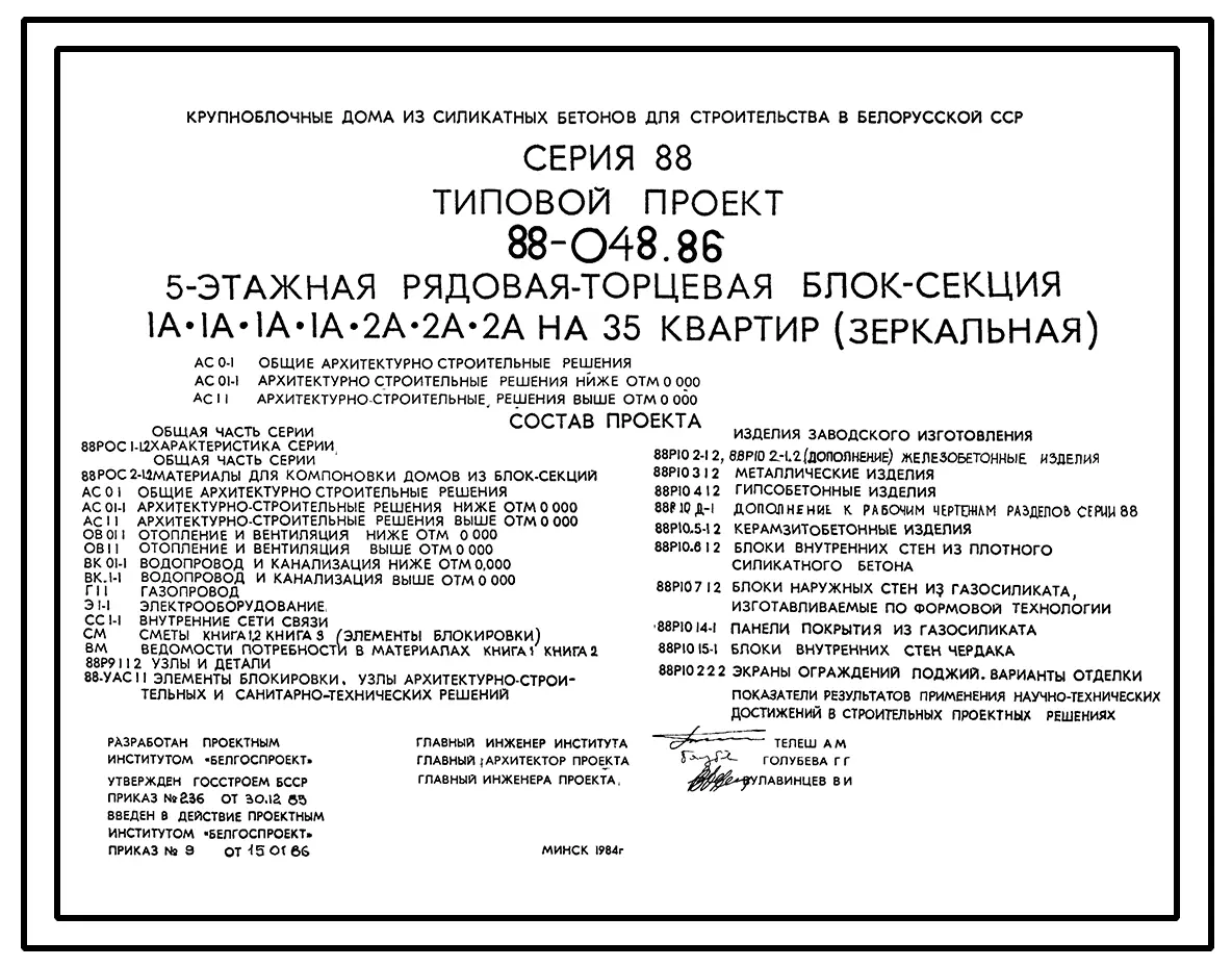 Типовой проект 88-048.86 Пятиэтажная блок-секция рядовая, торцевая (зеркальная) на 35 квартир