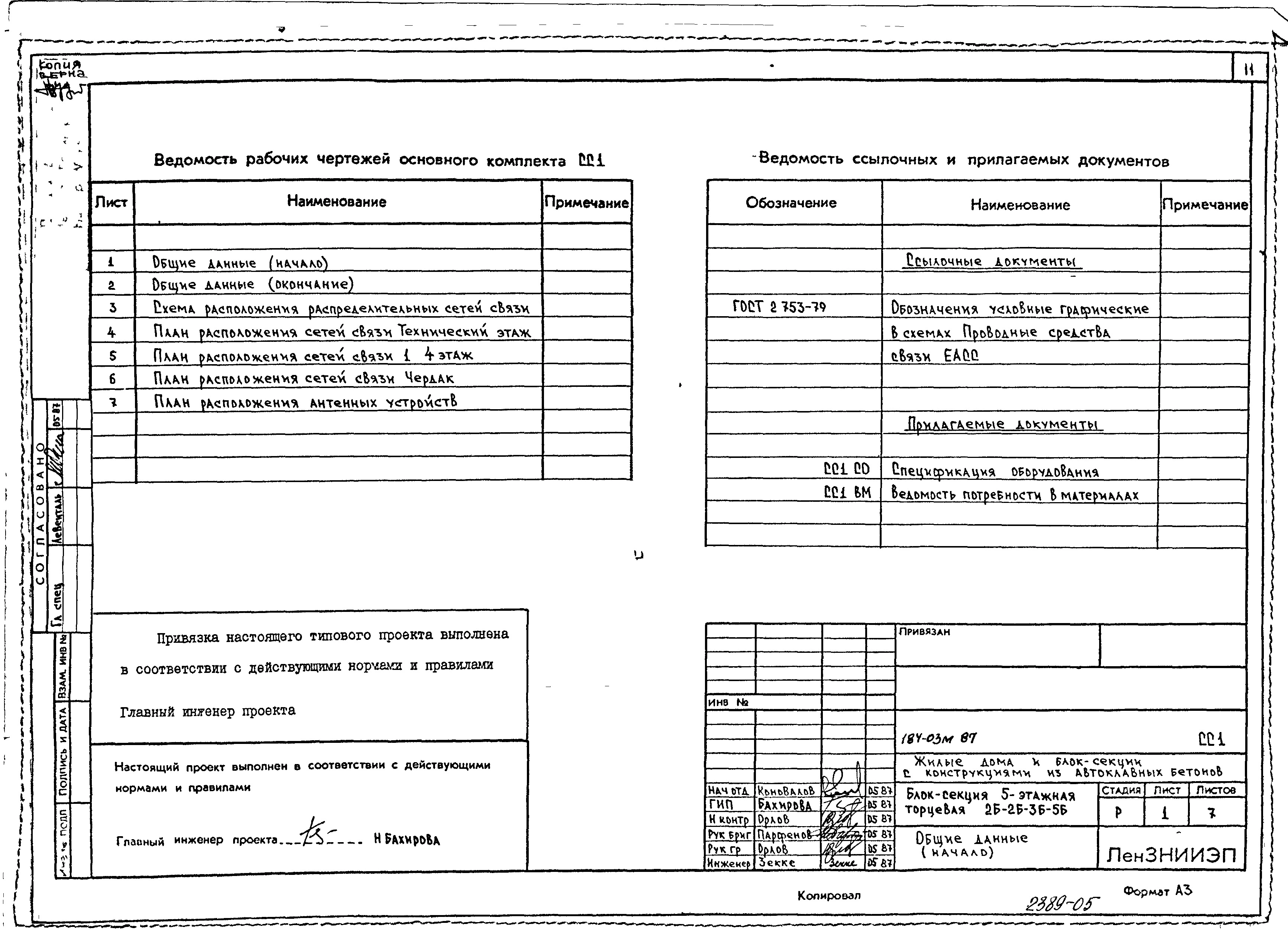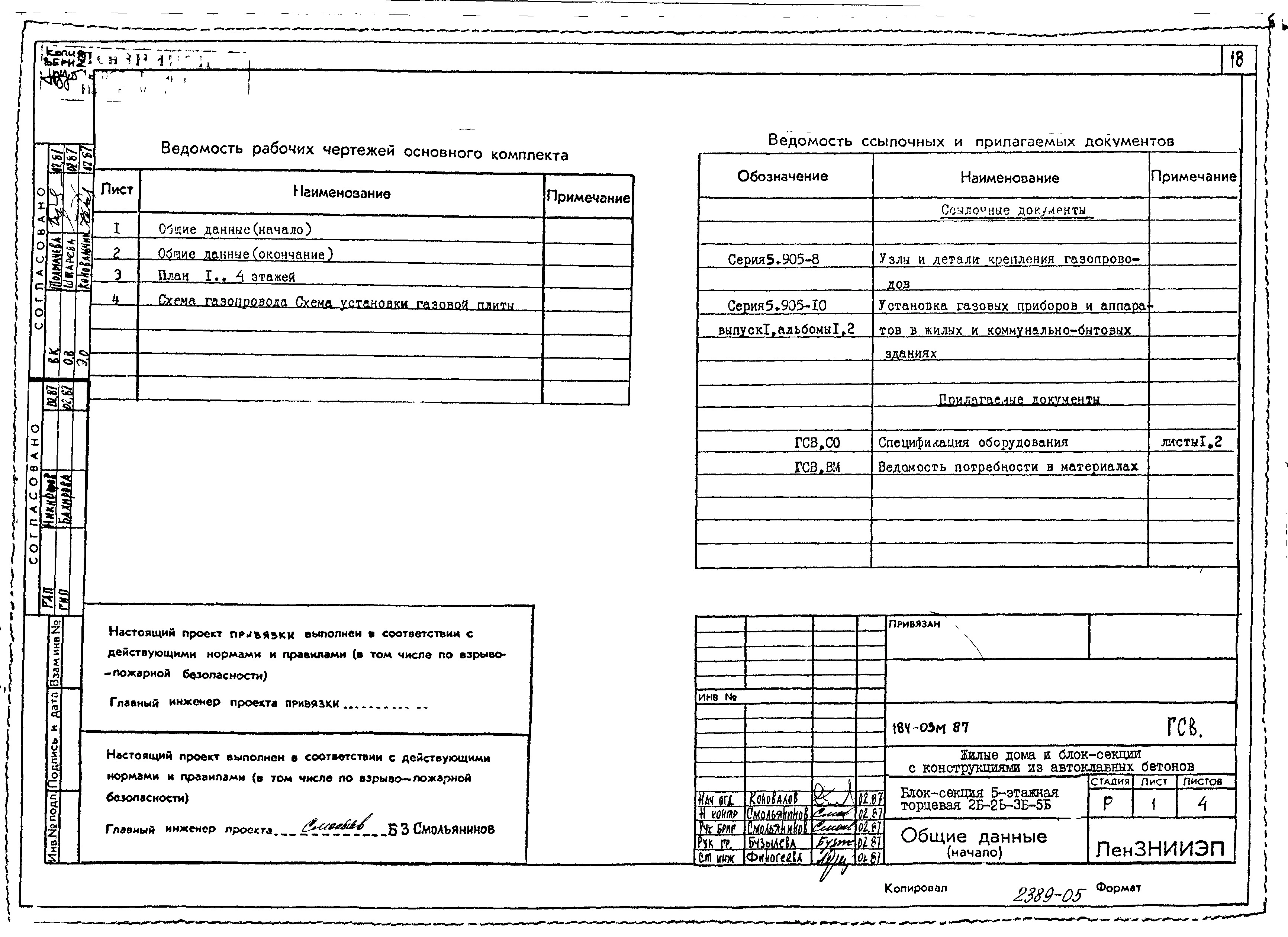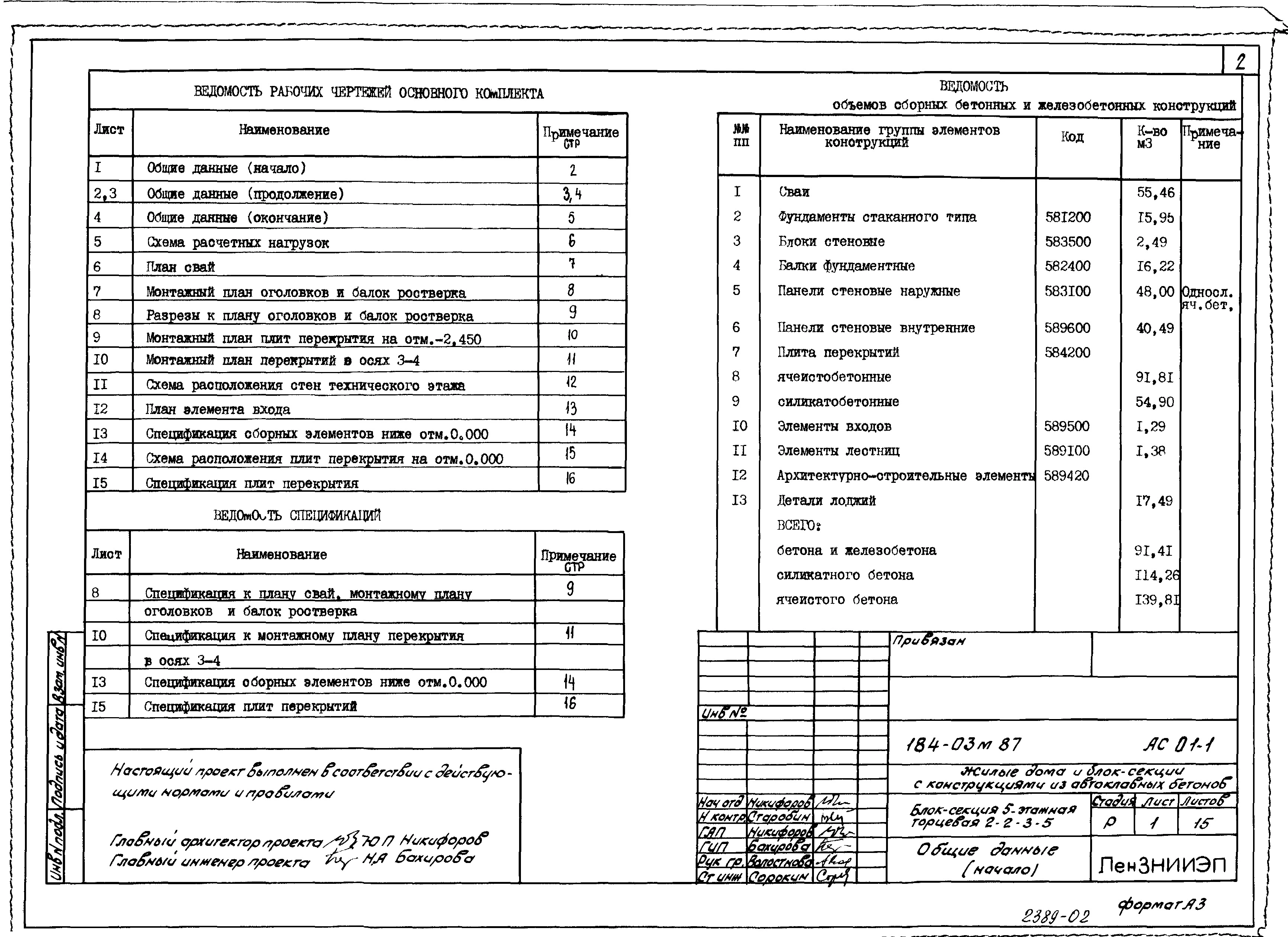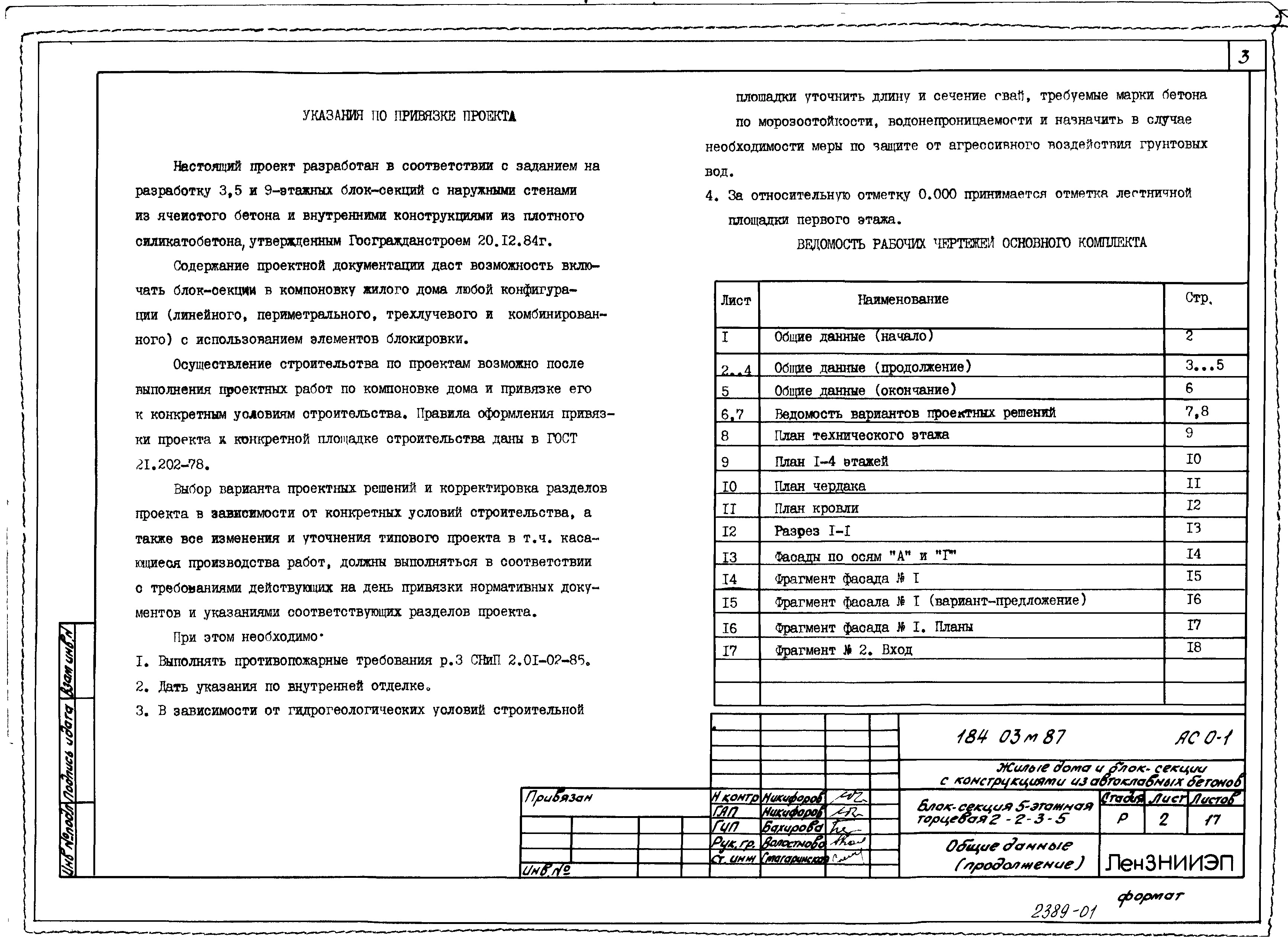 Типовой проект 184-03м.87 Блок-секция 5-этажная торцевая 2-2-3-5.. Паспорт проекта (формат PDF) Чертежи (формат TIF)
