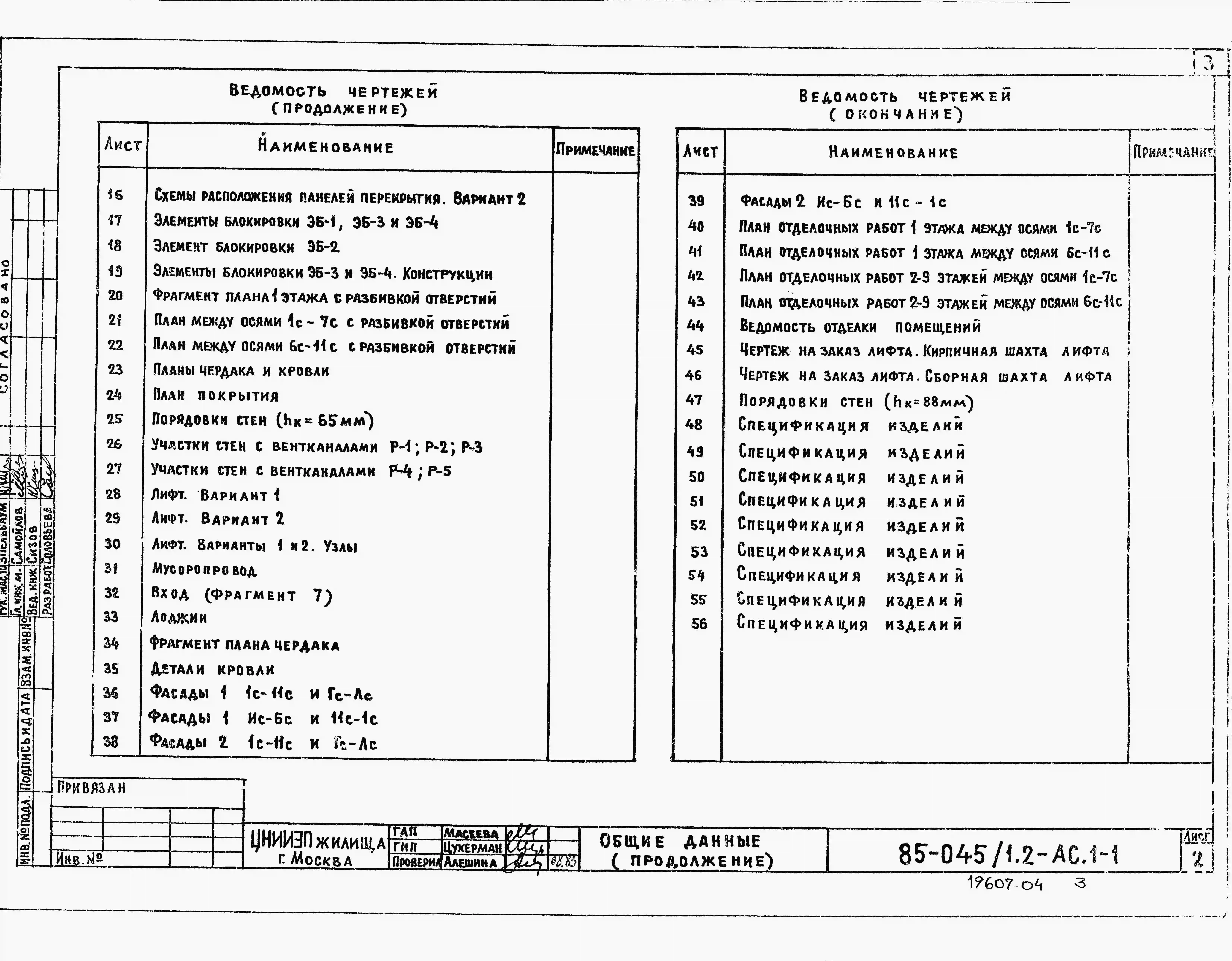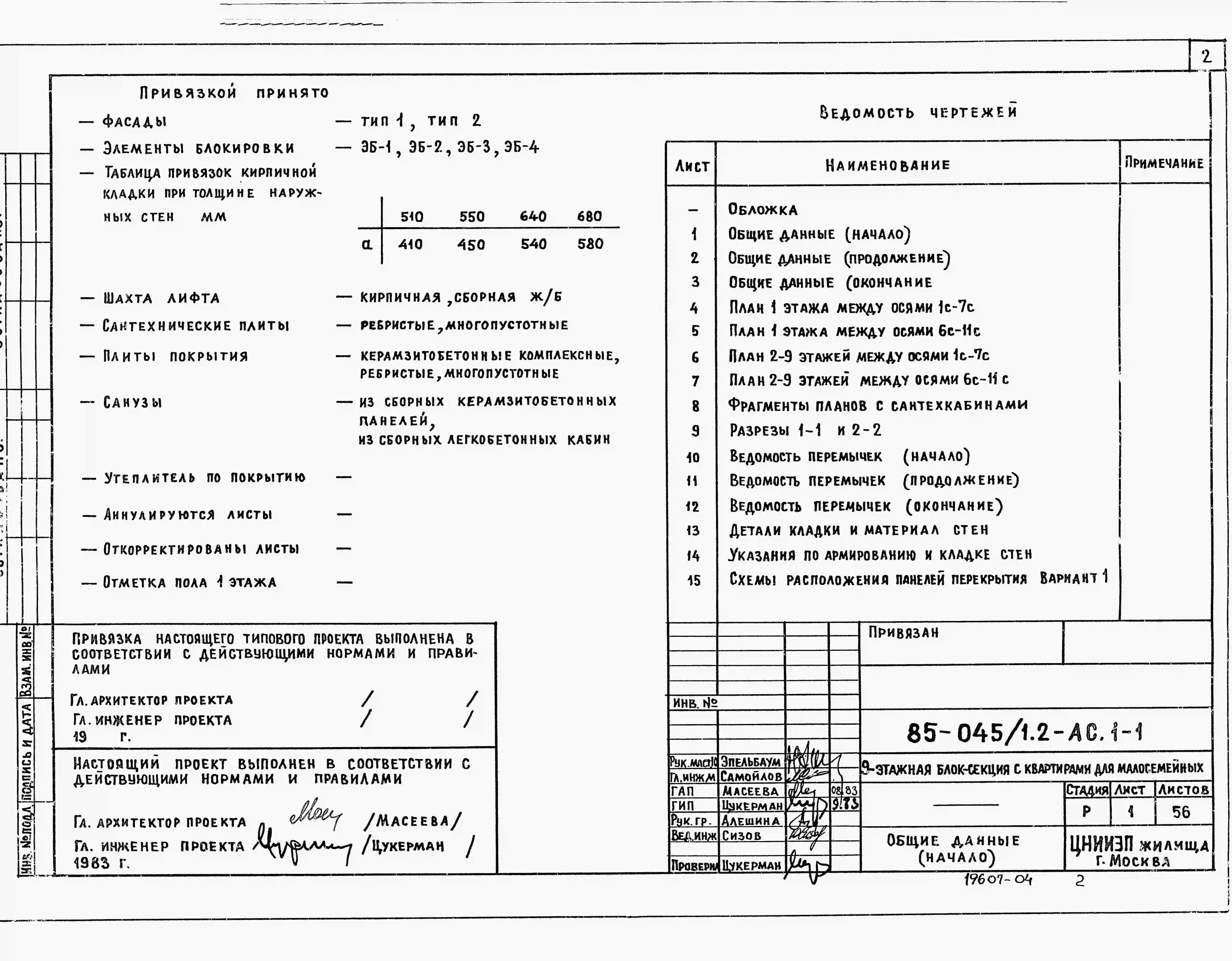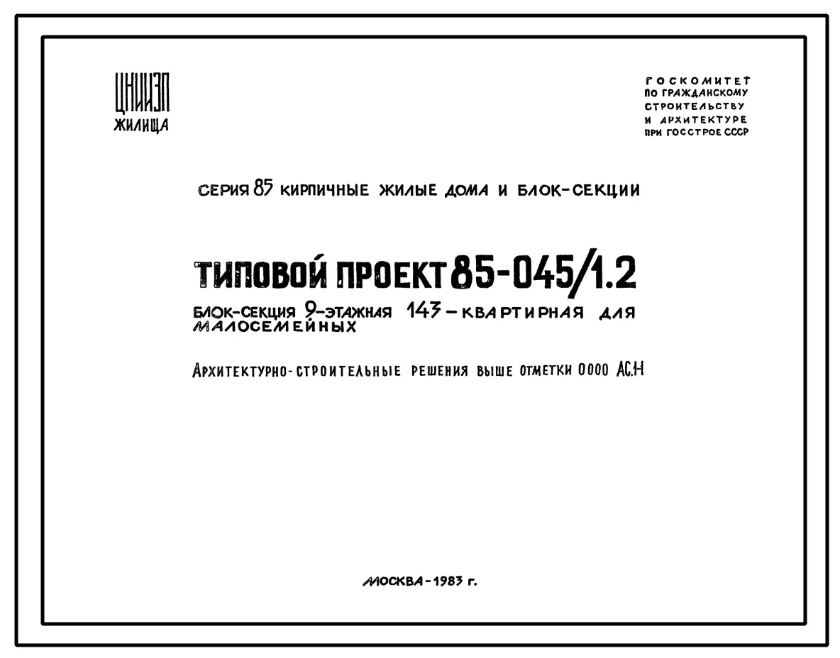 Типовой проект 85-045/1.2 Блок-секция 9-этажная 143-квартирная для малосемейных. Паспорт проекта (формат PDF) Чертежи (формат TIF)